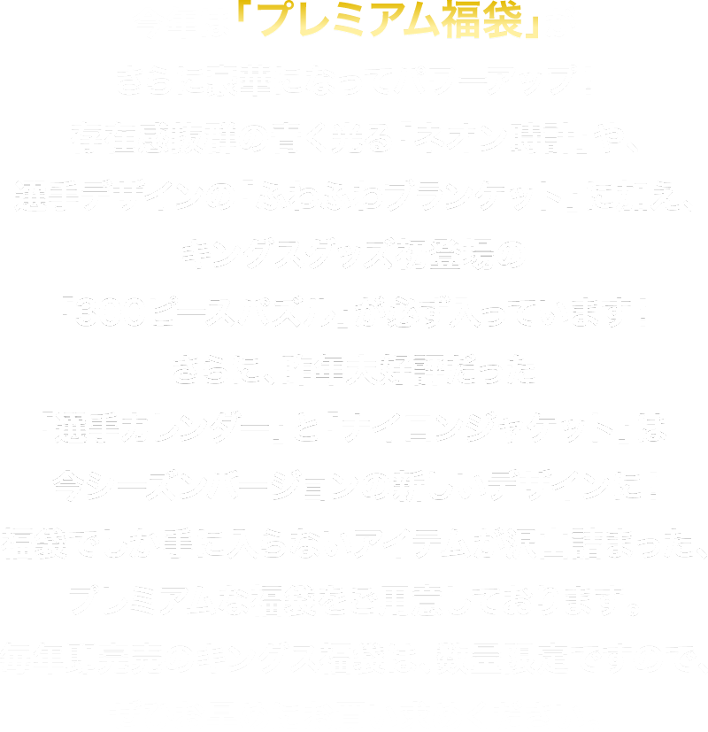 ・出荷の関係上、ご注文は1回につき福袋1点とさせていただきます。複数点ご希望の方は複数回に分けてご注文ください。