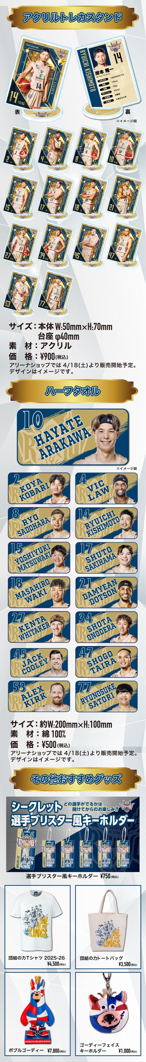 本日より、選手シークレットグッズの「アクリルトレカスタンド」、「ハーフタオル」をキングス公式オンラインショップ・アリーナショップにて販売いたします。 ハーフタオルは、ポケットにも収まる持ち運びに便利なサイズ感! アクリルトレカスタンドは、並べて飾って楽しめる、コレクションにもおすすめのアイテムです。 どの選手が出るかは、開けてからのお楽しみのシークレット仕様です。 ぜひお気に入りの選手をゲットしてください! ※アリーナショップでの販売開始は下記を予定しております。 ・アクリルトレカスタンド:4月18日(土) ・ハーフタオル:4月末ごろ