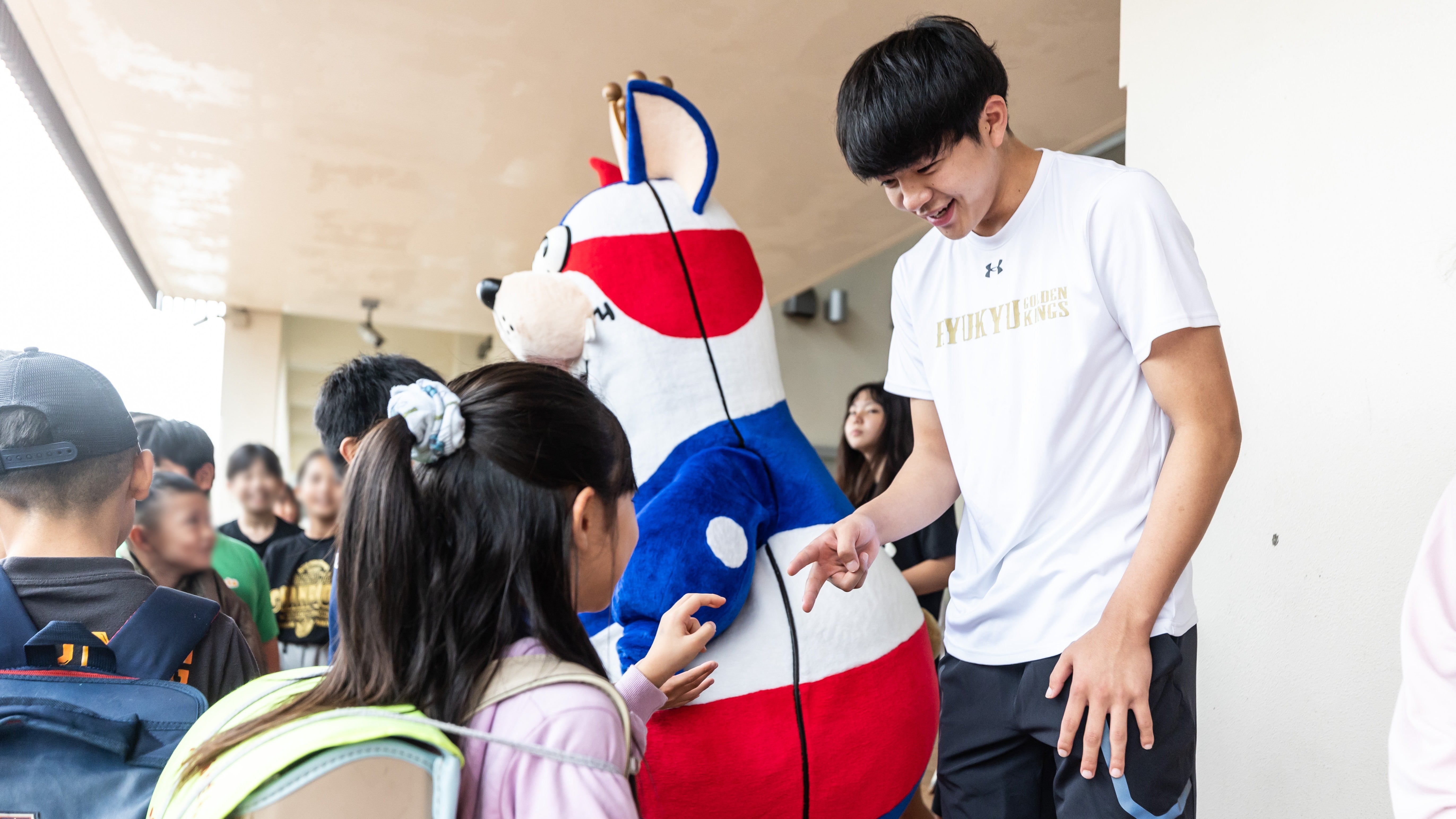 11月12日(水)にホームタウン沖縄市の高原小学校にて、「おおきなわ」の活動の一環として行っている「ゴーディーによる朝のあいさつ運動」を実施し、#77 佐取龍之介選手がゴーディーと一緒に参加しました。ご協力いただいた高原小学校の皆さま、児童会の皆さま、美東中学校の生徒会の皆さま、ありがとうございました。