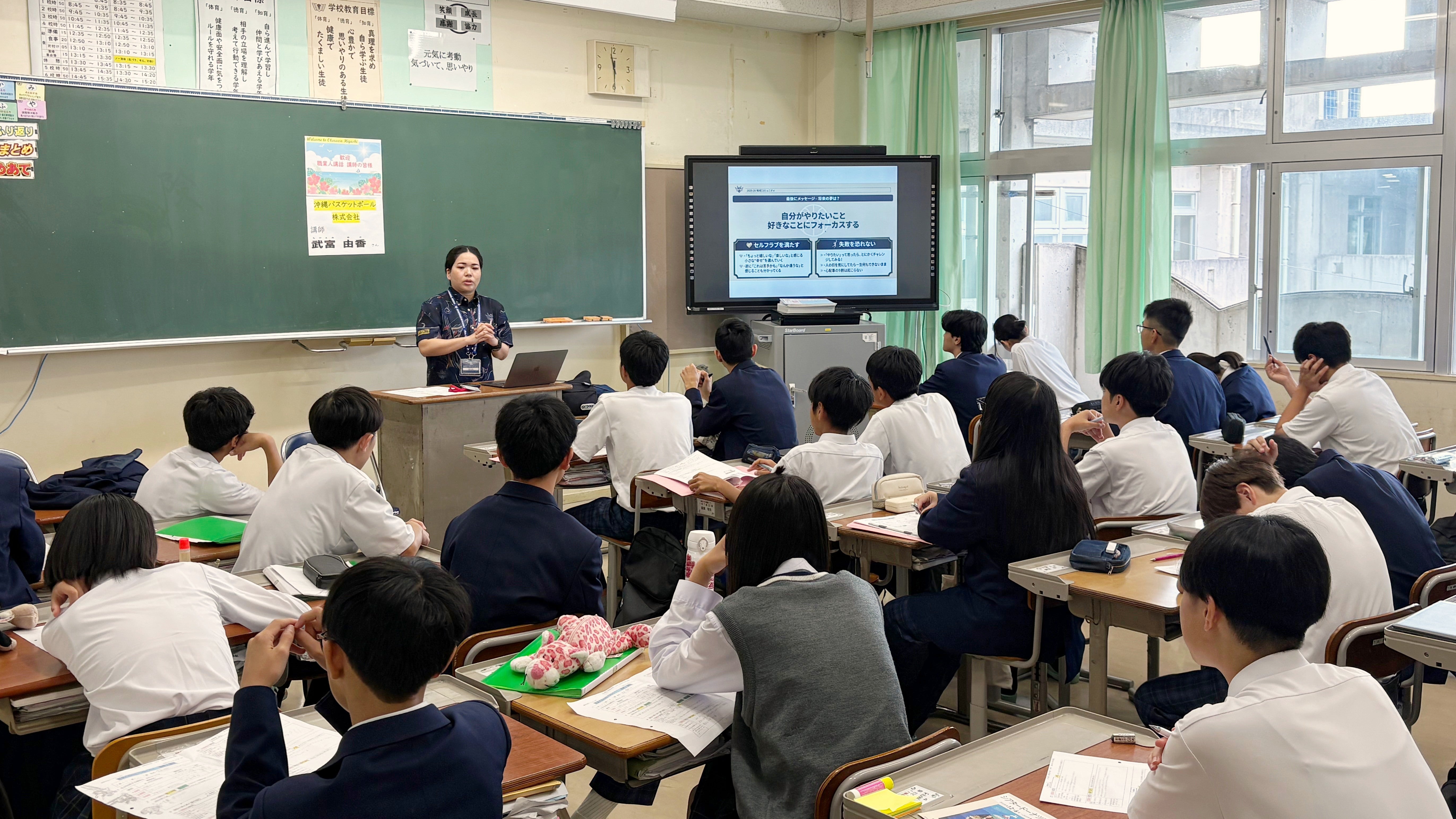 この度、沖縄バスケットボール株式会社の地域コミュニティ担当社員が沖縄県内の小中学校にて実施された職業講話に参加しました。ご協力いただいた各学校の皆さま、誠にありがとうございました。