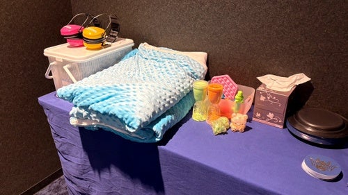 フレンドリールームの設置にあたり沖縄県発達障がい者支援センターご協力のもと、沖縄サントリーアリーナ内にある既存のスイートルームを活用し、音や光の刺激を抑える為に室内スピーカーをオフにし、ブラインドを下ろすことで室内の明るさ調整をできるようにし、イヤーマフや加重ブランケットの貸し出しを行い、実際に感覚過敏の方に試合観戦を体験していただきました。