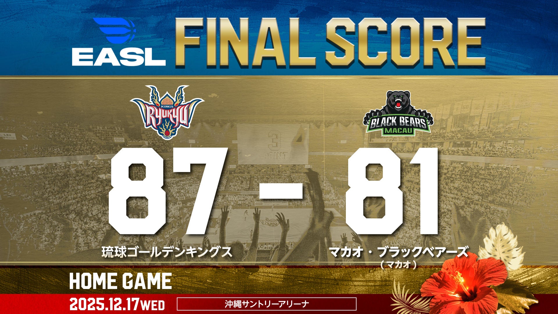 【結果】ゲームレポート [12/17(水) EASL vsマカオ・ブラックベアーズ戦]