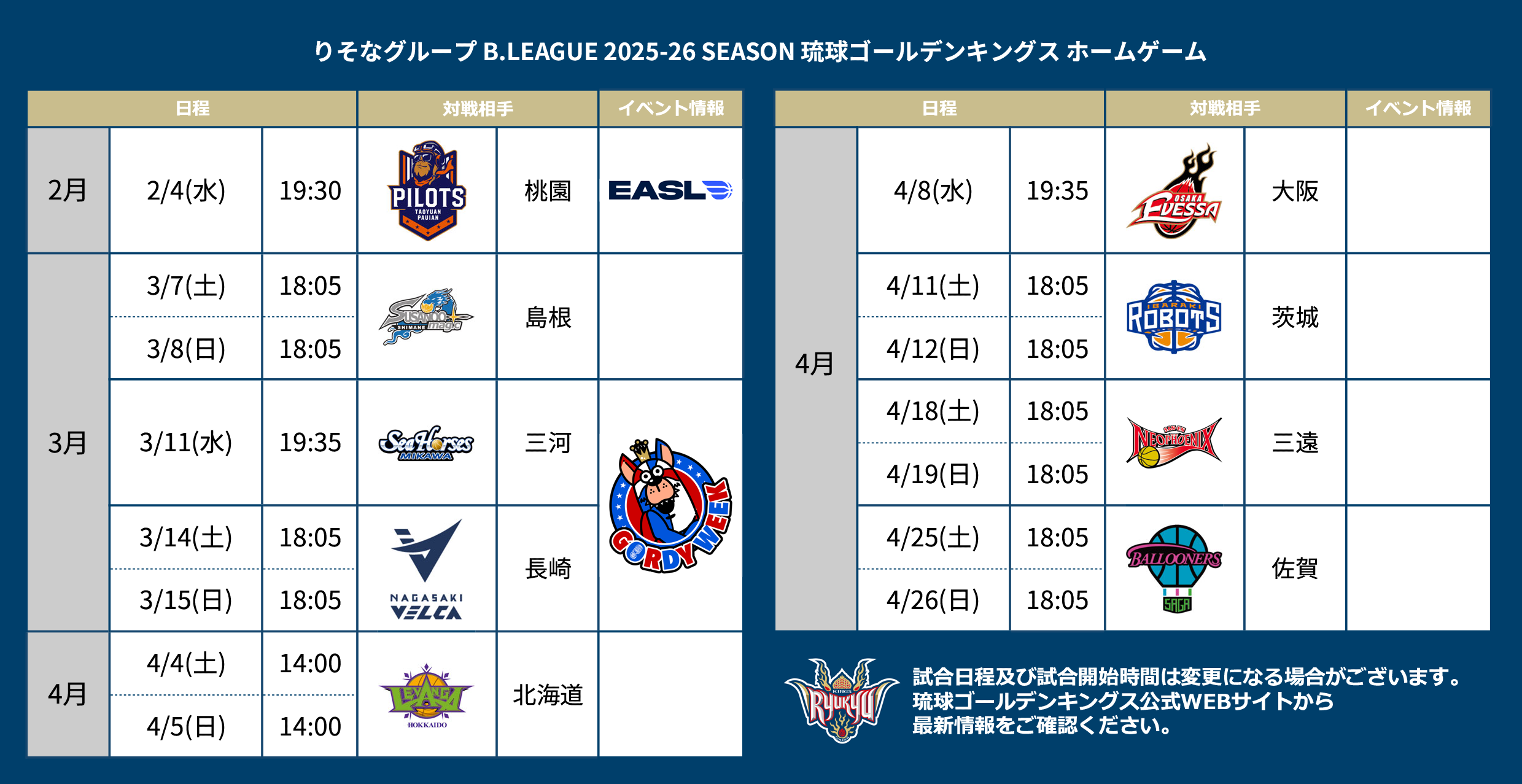 りそなグループ B.LEAGUE 2025-26 SEASON 後半戦(32節-36節) 試合開始時間決定のお知らせ