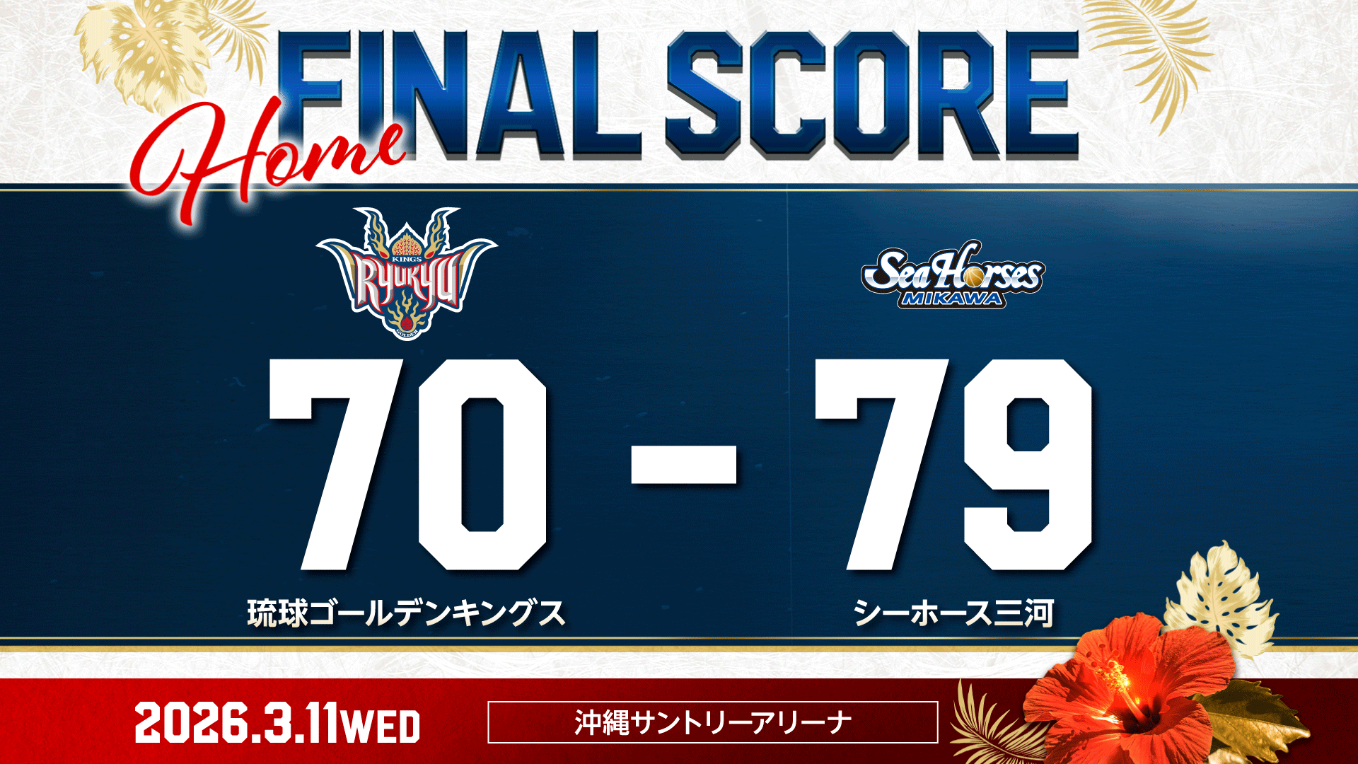 【結果】最終盤の攻防を制せず悔しい敗戦[3/11(水)vsシーホース三河]