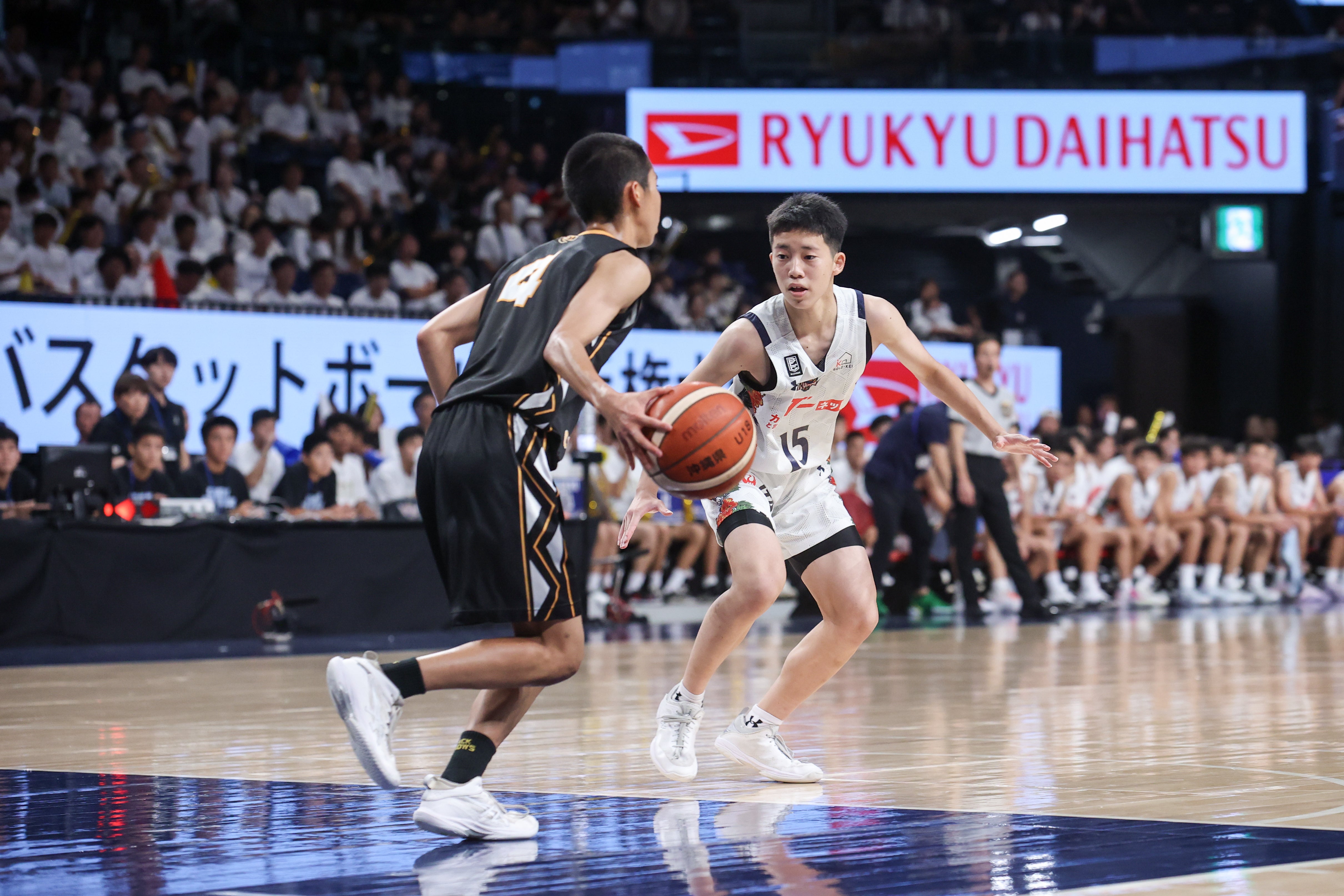 #18 宮城選手が3Pシュートを決めると、#9 嶺井選手がスティールからのレイアップシュートを流し込みます。#15 平野永流選手が3Pシュートで得点を重ねます。#8 與那嶺選手が速攻からのレイアップシュートを決めると、ブロックショットからボールを奪い#30 仲松選手がレイアップシュートを流し込み、攻撃の手を緩めません。さらに#15 平野選手が3Pシュートを射抜きます。ロスター全員が得点し、101-36で大会6連覇を達成しました。
