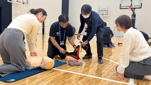ホームゲーム運営に携わる両社スタッフが参加し、急病人の発生に備えた救急法講習を実施しました。