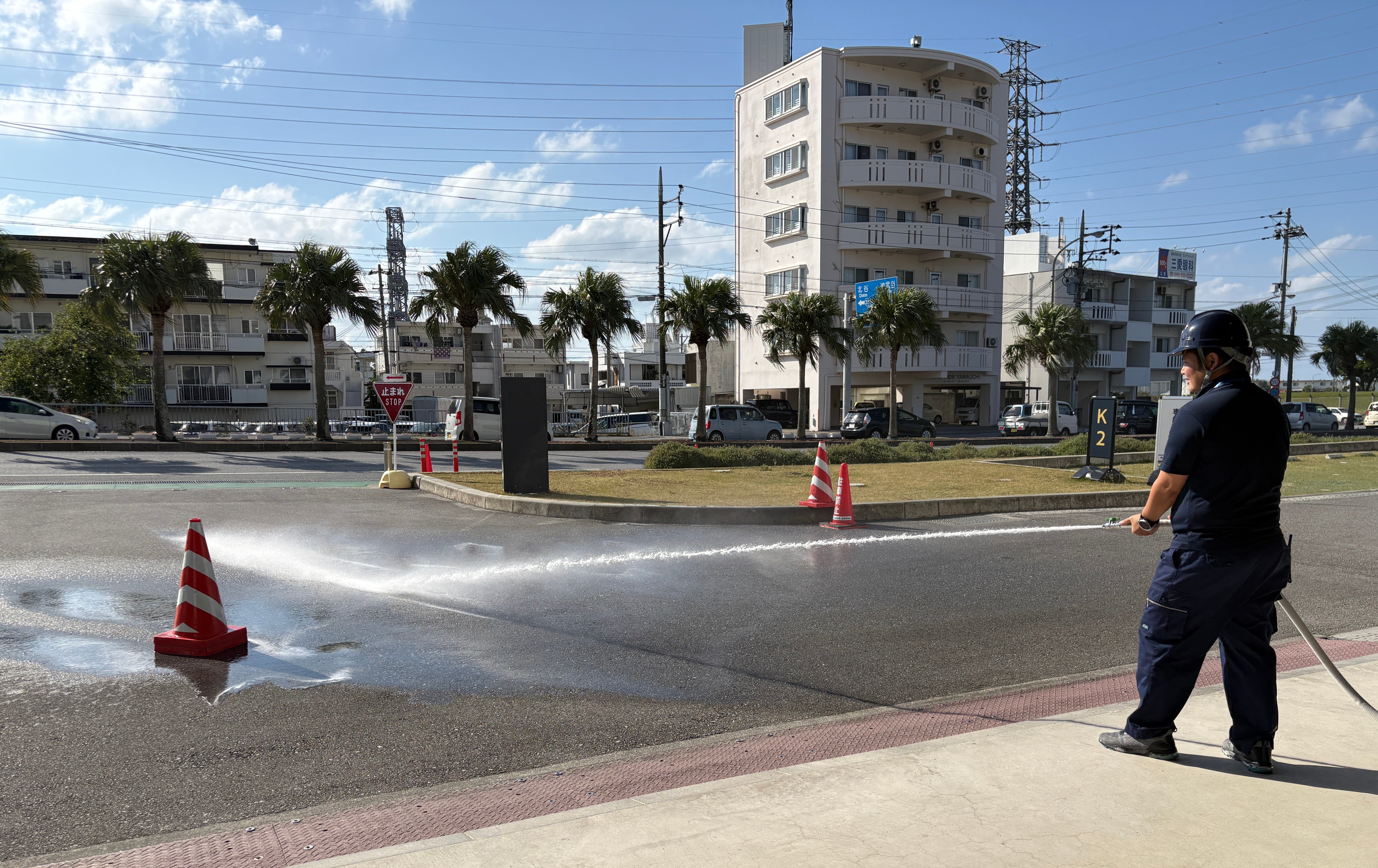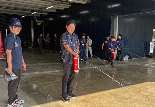続いて、アリーナ入口付近にて消火器や屋内消火栓設備を使用した初期消火訓練も行い、災害発生時に求められる基本的な動作を確認しました。