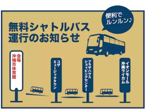 会場へお越しの際は、コザミュージックタウン、プラザハウスショッピングセンター、イオンモール沖縄ライカムを巡回する無料シャトルバスをご利用ください。シャトルバスは、試合開始2時間前から試合終了1時間後まで運行しています。シャトルバス詳細はこちら。