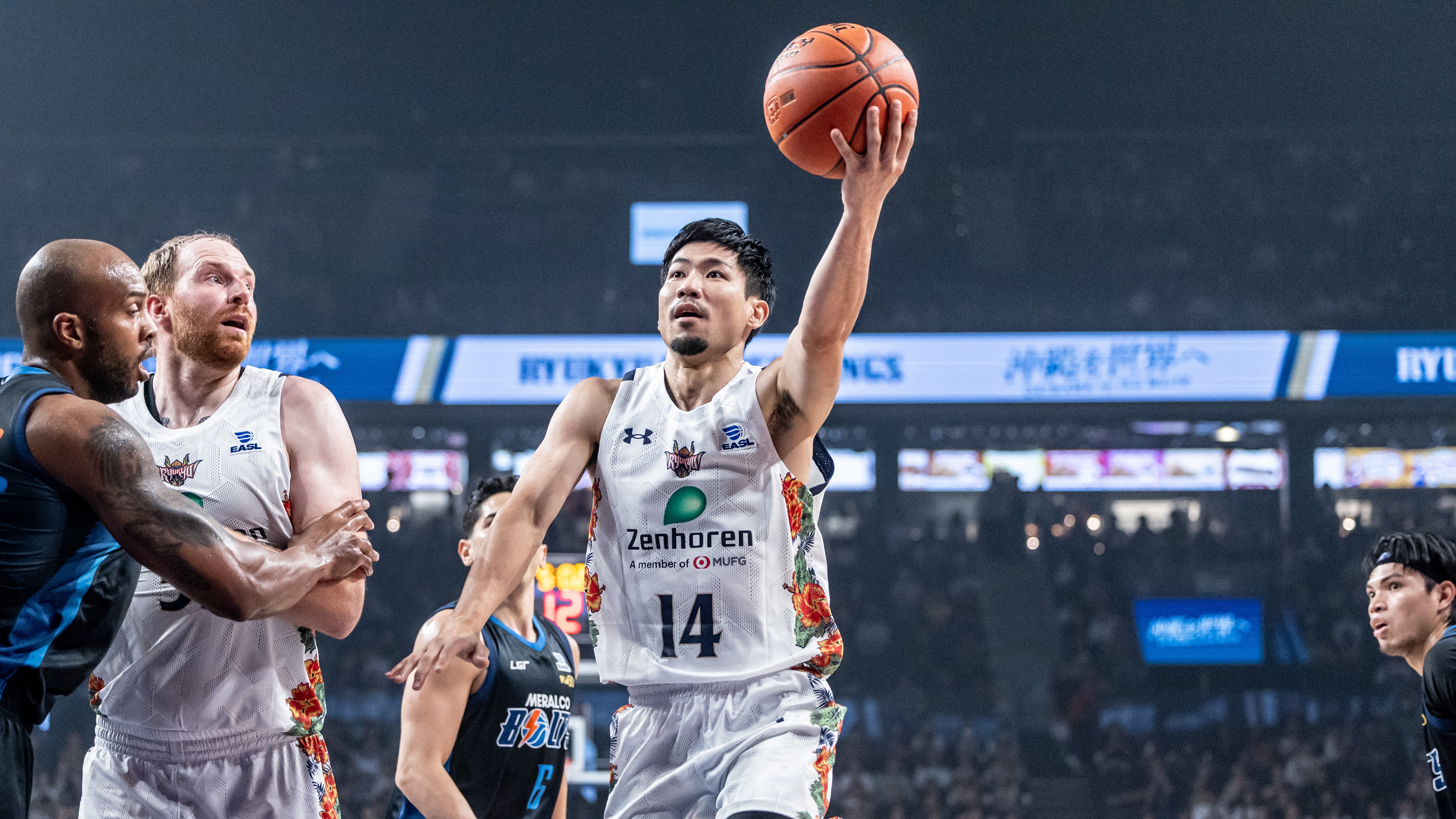 #10 荒川颯選手が3Pシュートを沈め、#8 佐土原選手がレイアップシュートで加点します。#53 カーク選手がリング下から2Pシュートを決めると、#14 岸本選手がこの日5本目となる3Pシュートを沈め得点を重ねます。#14 岸本選手が粘り強いディフェンスからボールを奪うと、相手のファールを誘い、フリースロー2本決め切ります。#53 カーク選手が2Pシュートを決め、さらに#8 佐土原選手が3Pシュートを沈め、81-72で勝利しました。