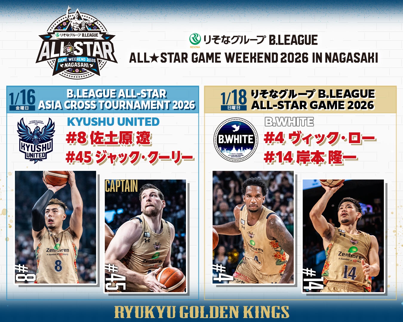 B.LEAGUEより発表がありました通り、来年2026年1月16日(金)から18日(日)に長崎県にて、「りそなグループ B.LEAGUE ALL-STAR GAME WEEKEND 2026 IN NAGASAKI」が開催されます。1月18日(日)に開催される「B.LEAGUE ALL-STAR GAME」では、B.WHITEチームとして琉球ゴールデンキングスから#4 ヴィック・ロー選手、#14 岸本隆一選手が選出されました。