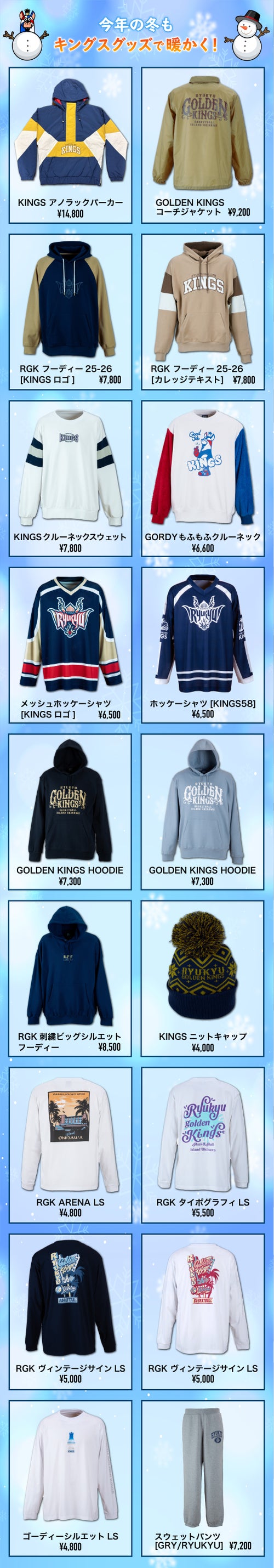 肌寒くなってきた今の季節にぴったりの「キングスウィンターアイテム」が、アリーナショップ・キングス公式オンラインショップで販売中です。 さらっと着られる定番のロングスリーブやフーディーに加えて、今年はスウェットパンツも登場。 観戦の日はもちろん、普段使いとして冬のデイリーウェアにも使えるアイテムを多数ご用意しておりますので、ぜひお気に入りのウィンターアイテムを見つけてみてください!