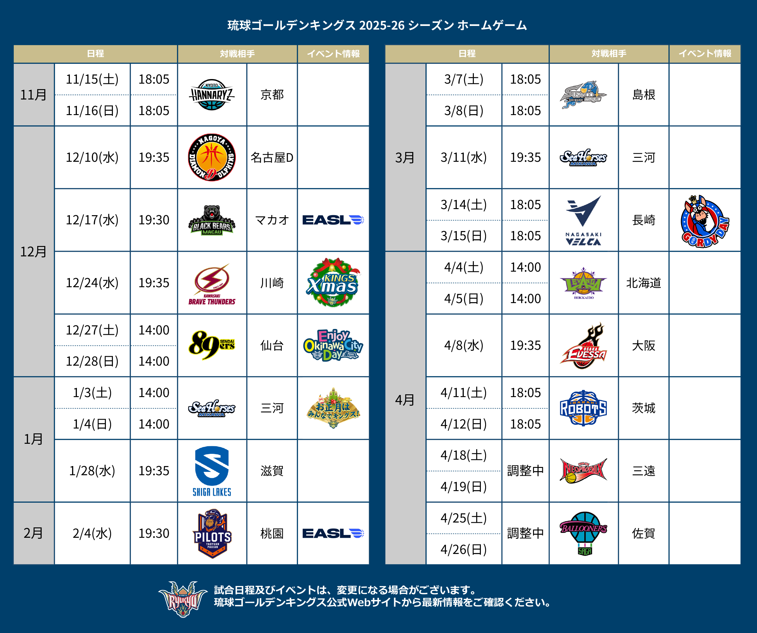 本日、Bリーグより発表がありました通り、2025-26シーズン後半戦(19節-31節)の試合時間が決定しましたのでお知らせいたします。詳細は下記をご覧ください。