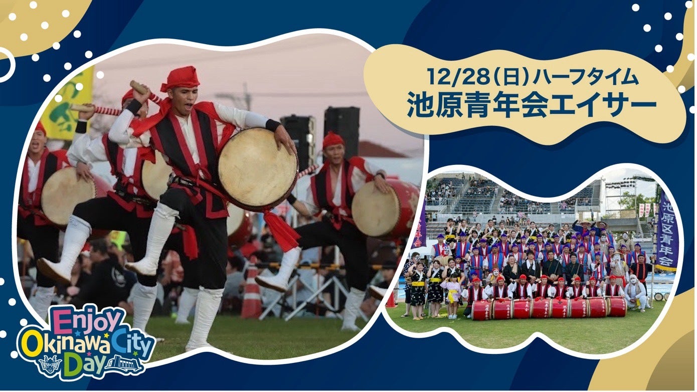 12/28(日)のハーフタイムは、「池原青年会」によるエイサーのパフォーマンスを披露!エイサーのまち沖縄市のエイサーをぜひお楽しみください!