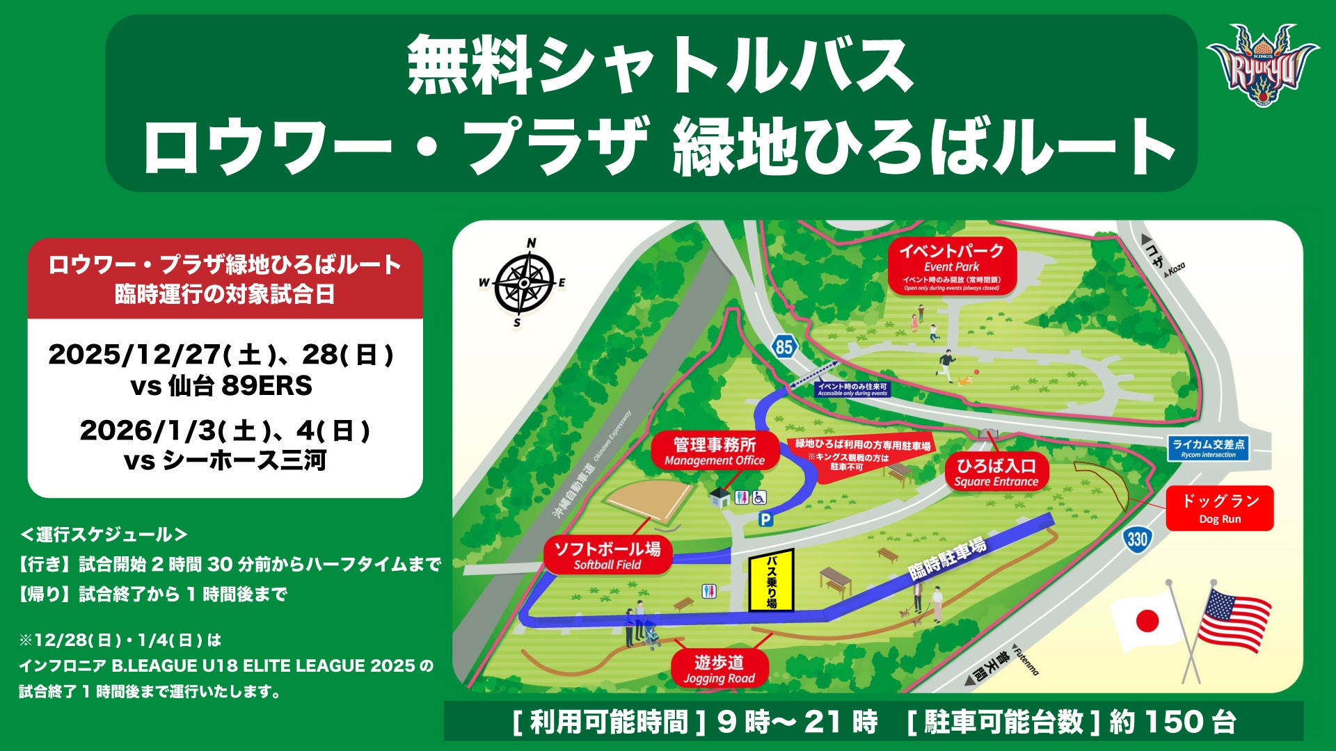 2025年12月の対象2試合、2026年1月の対象2試合において、無料シャトルバスのロウワー・プラザ緑地ひろばルートの臨時運行を実施いたします。