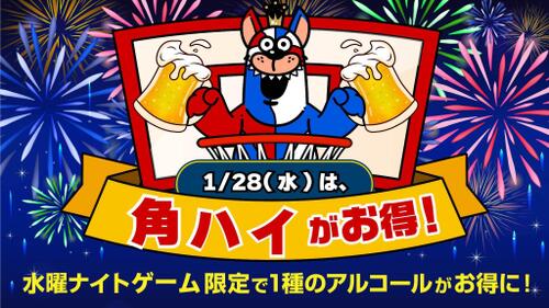 アルコールドリンクのうち1種類がお得にお楽しみいただける水曜ナイトゲーム!1月28日(水)は角ハイが通常700円のところ500円とワンコインでお楽しみいただけます!