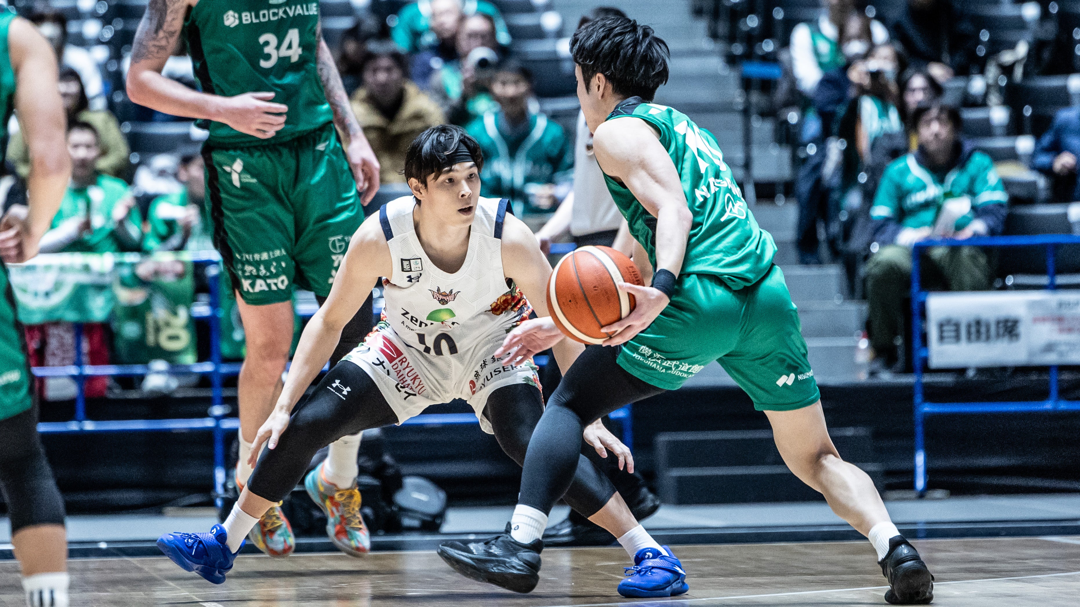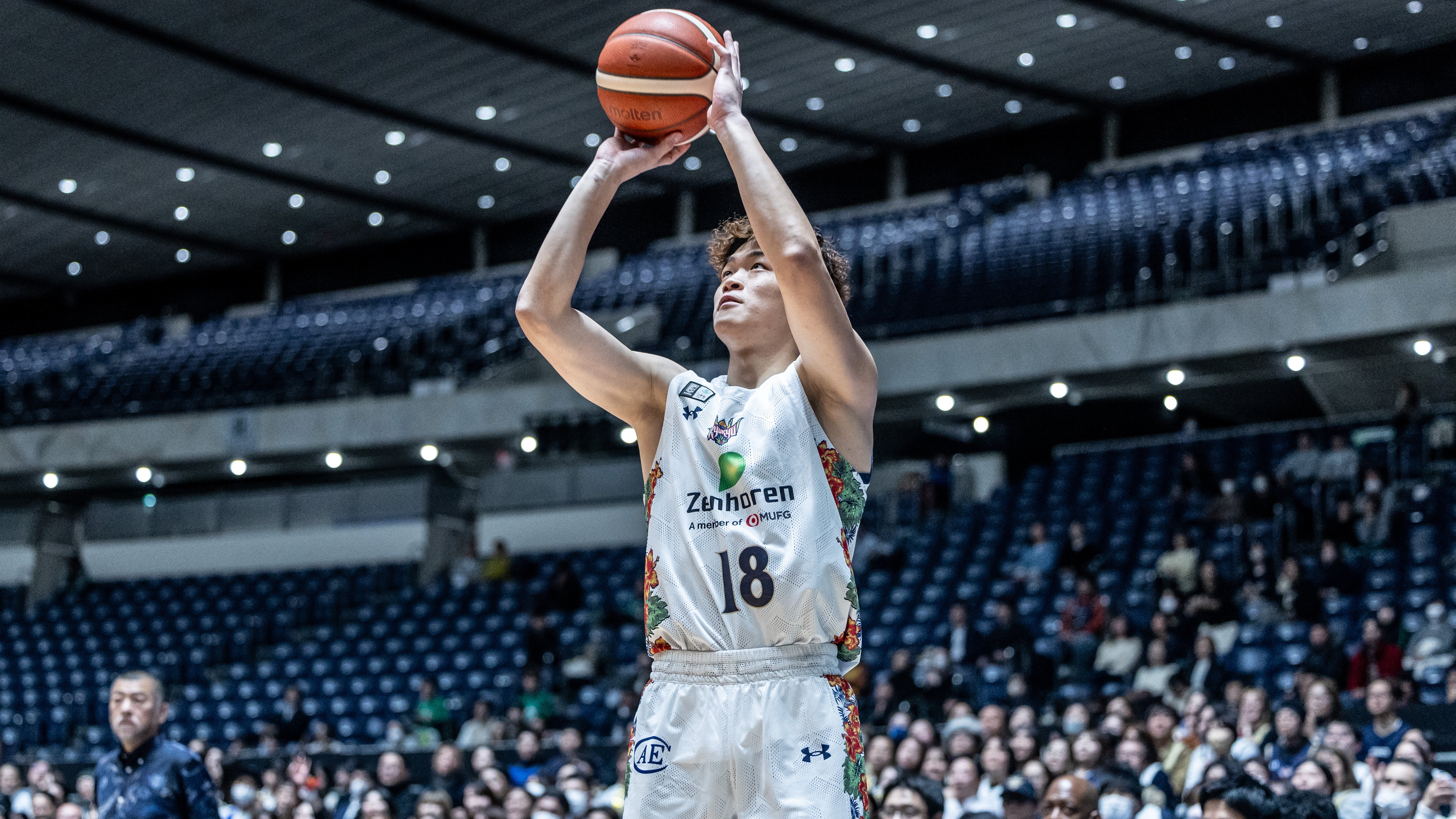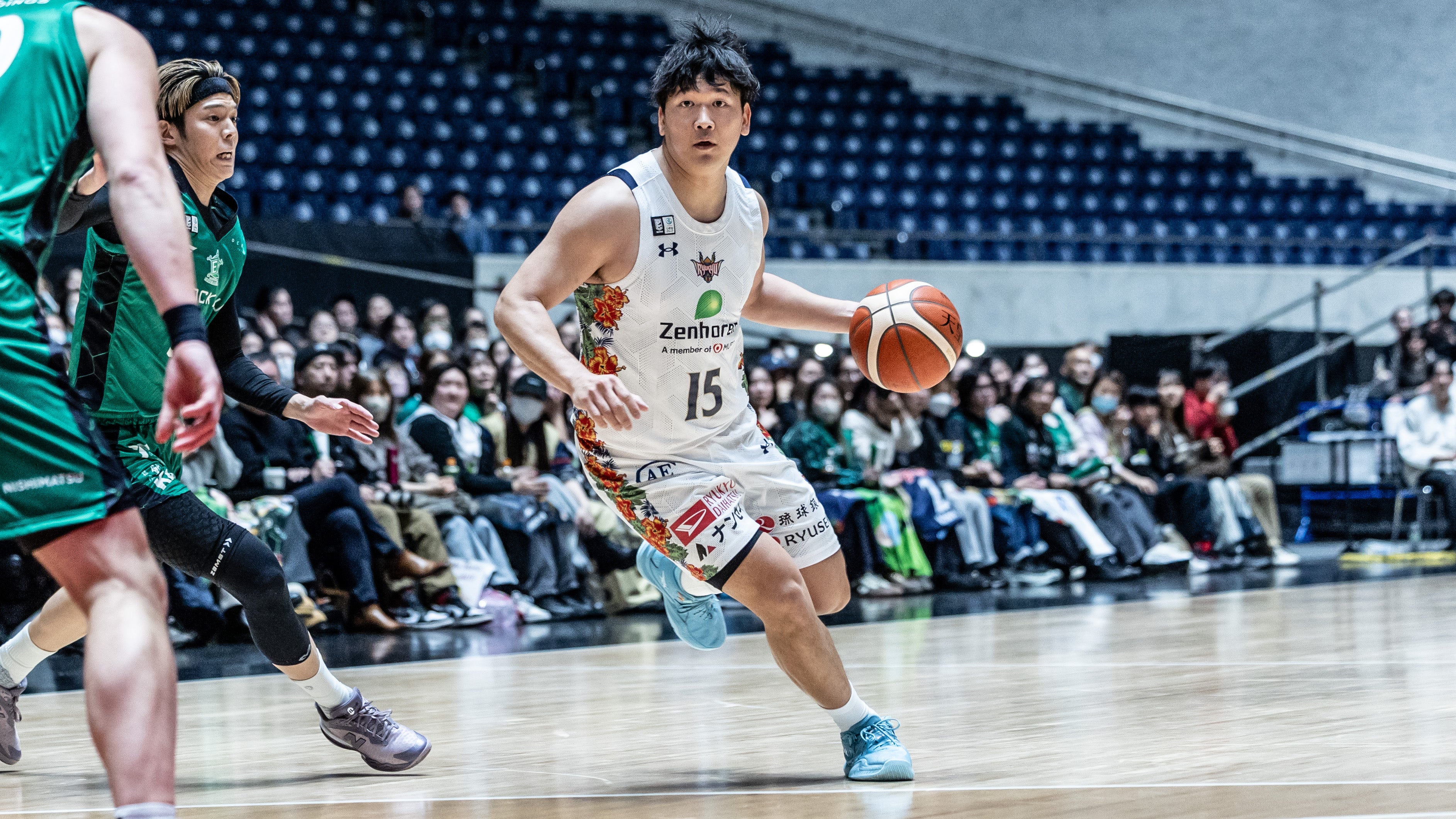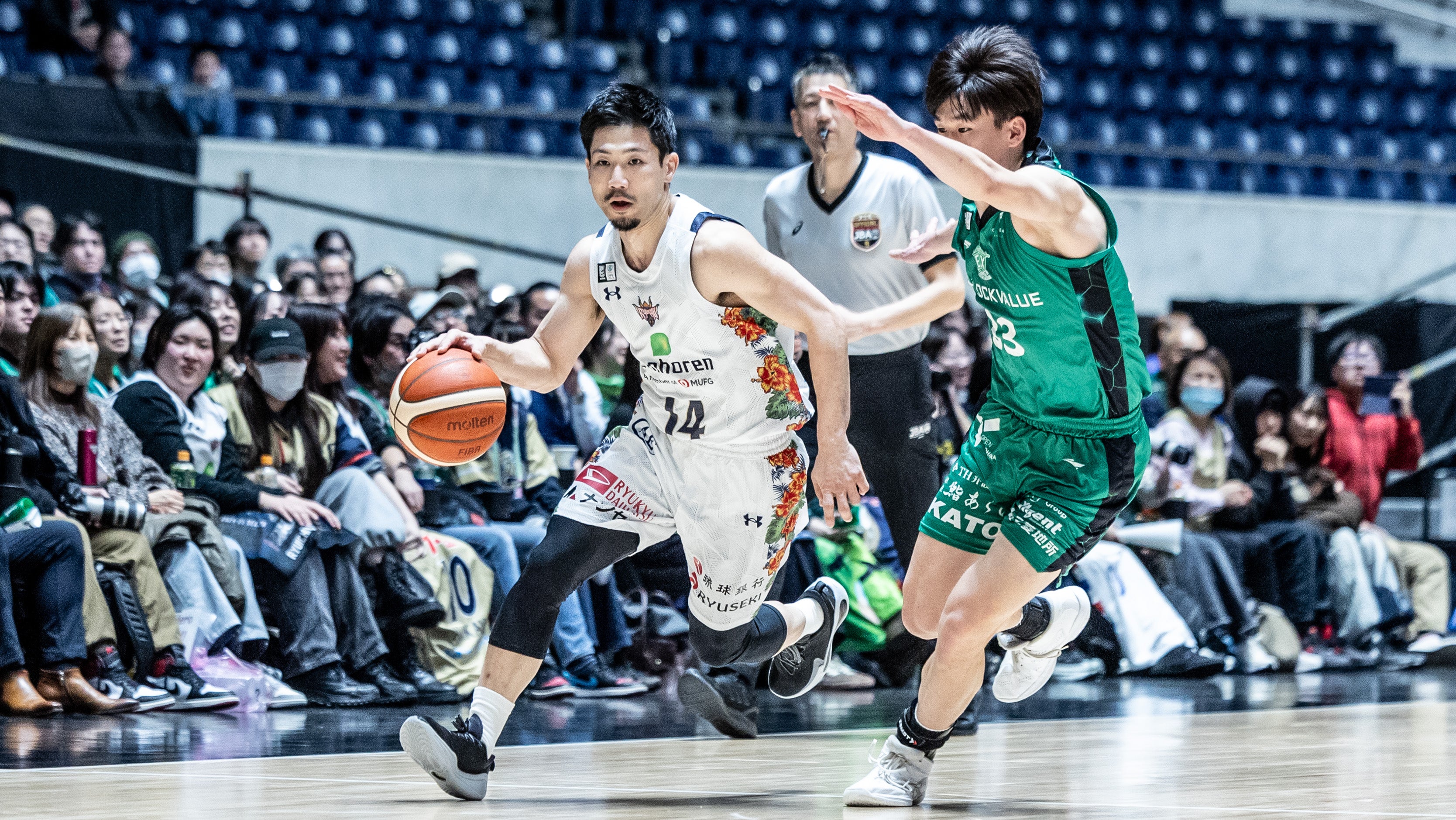 #47 平良彰吾選手がスティールからレイアップシュートを決めます。攻撃のリズムが掴めず得点に繋がらない時間帯が続くも、#15 松脇選手が3Pシュートを射抜くと、#14 岸本選手のパスに合わせた#15 松脇選手がリング下から追加点を決めます。さらに#45 クーリー選手が2Pシュート、#10 荒川颯選手が3Pシュートを沈めます。ディフェンスで高い位置からプレッシャーを与え、相手からボールを奪うと#14 岸本選手が3Pシュートを射抜きます。#53 アレックス・カーク選手が2Pシュート、#2小針幸也選手がスティールからレイアップシュートを流し込み、#14 岸本選手がこの日3本目となる3Pシュートを決め37-31で前半を終了します。