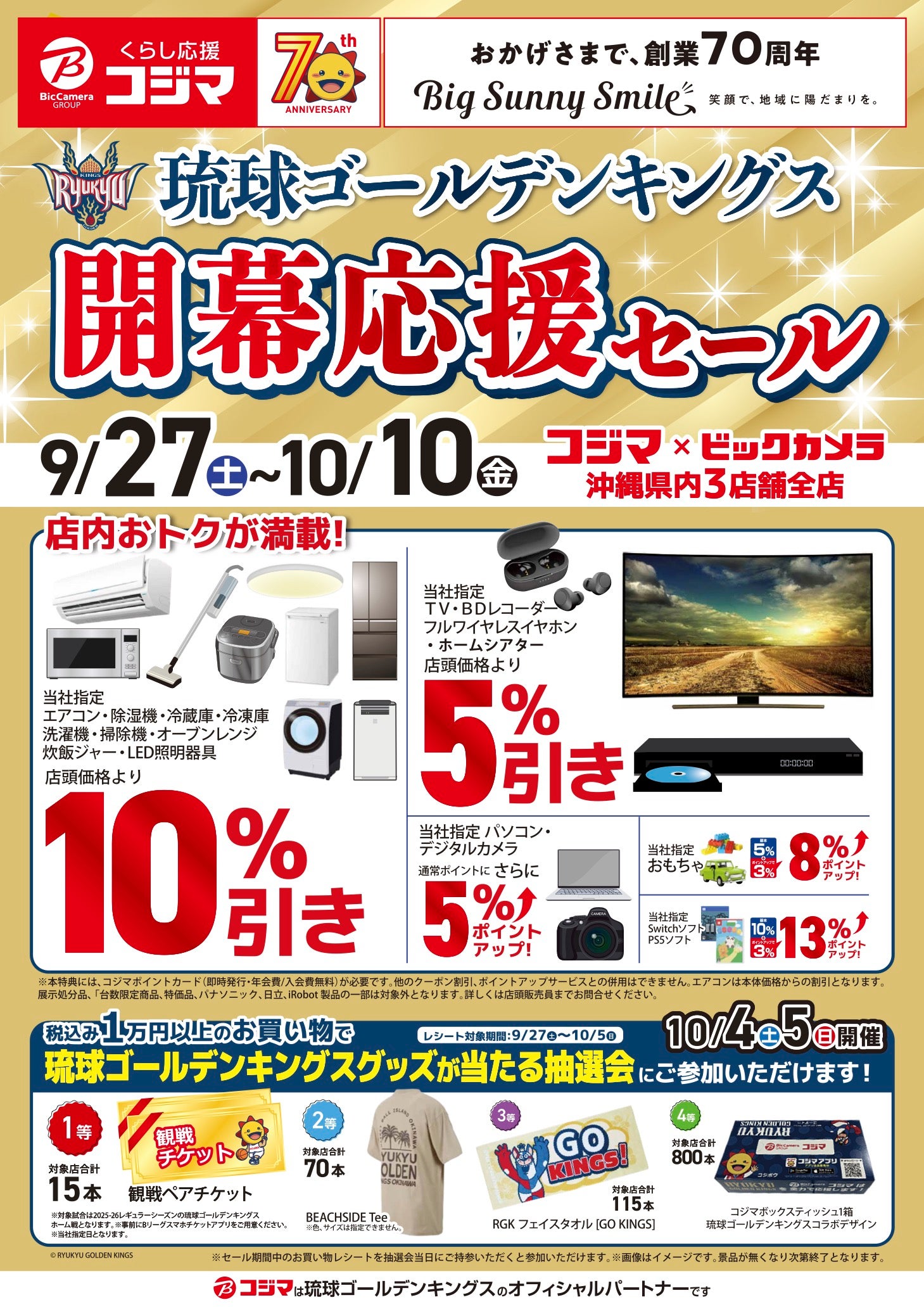 琉球ゴールデンキングスのオフィシャルパートナーである株式会社コジマでは、9月27日(土)から10月10日(金)の14日間、「りそなグループ B.LEAGUE2025-26シーズン」での活躍を祈念した、「琉球ゴールデンキングス 開幕応援セール」を開催いたします。