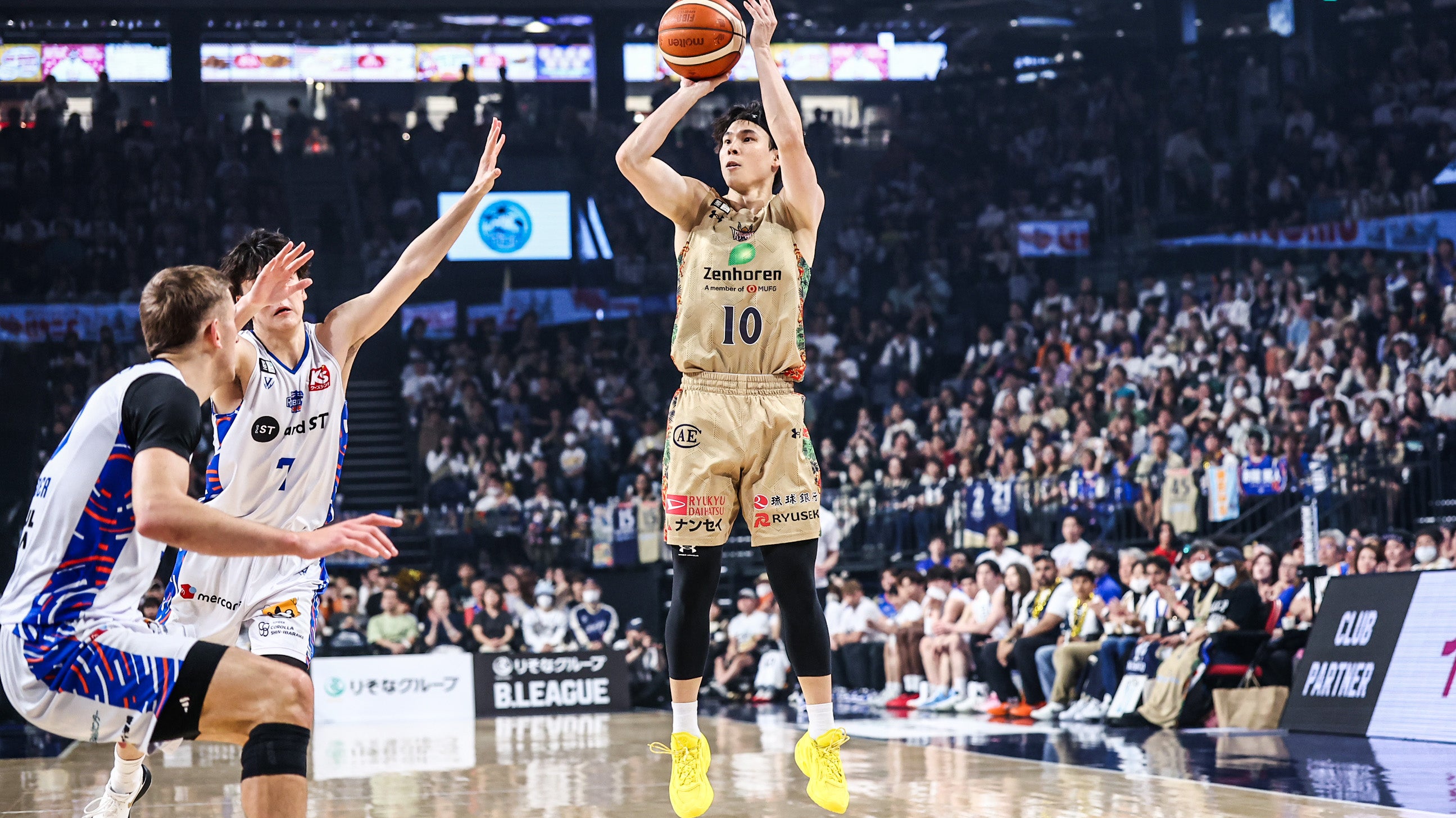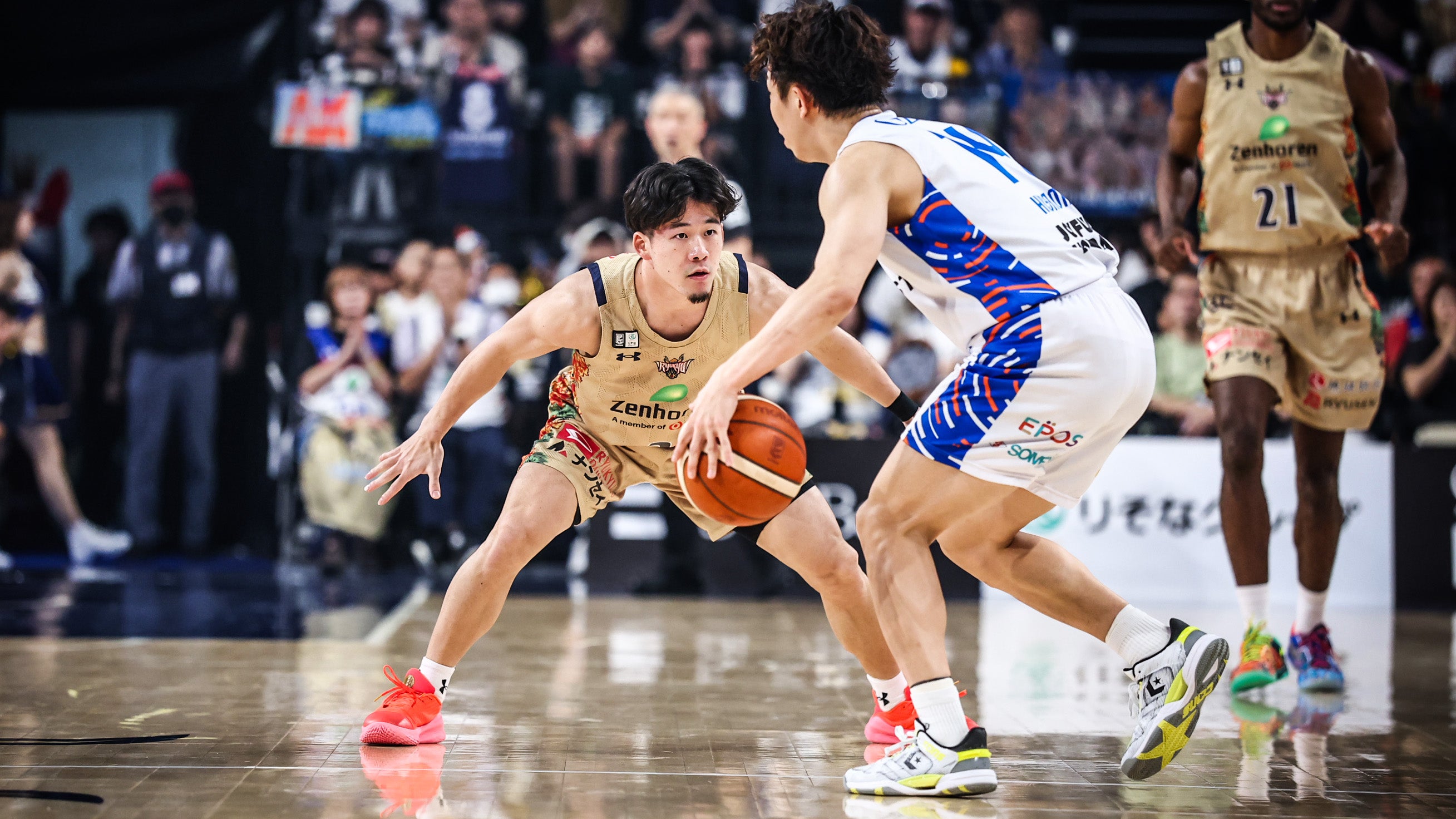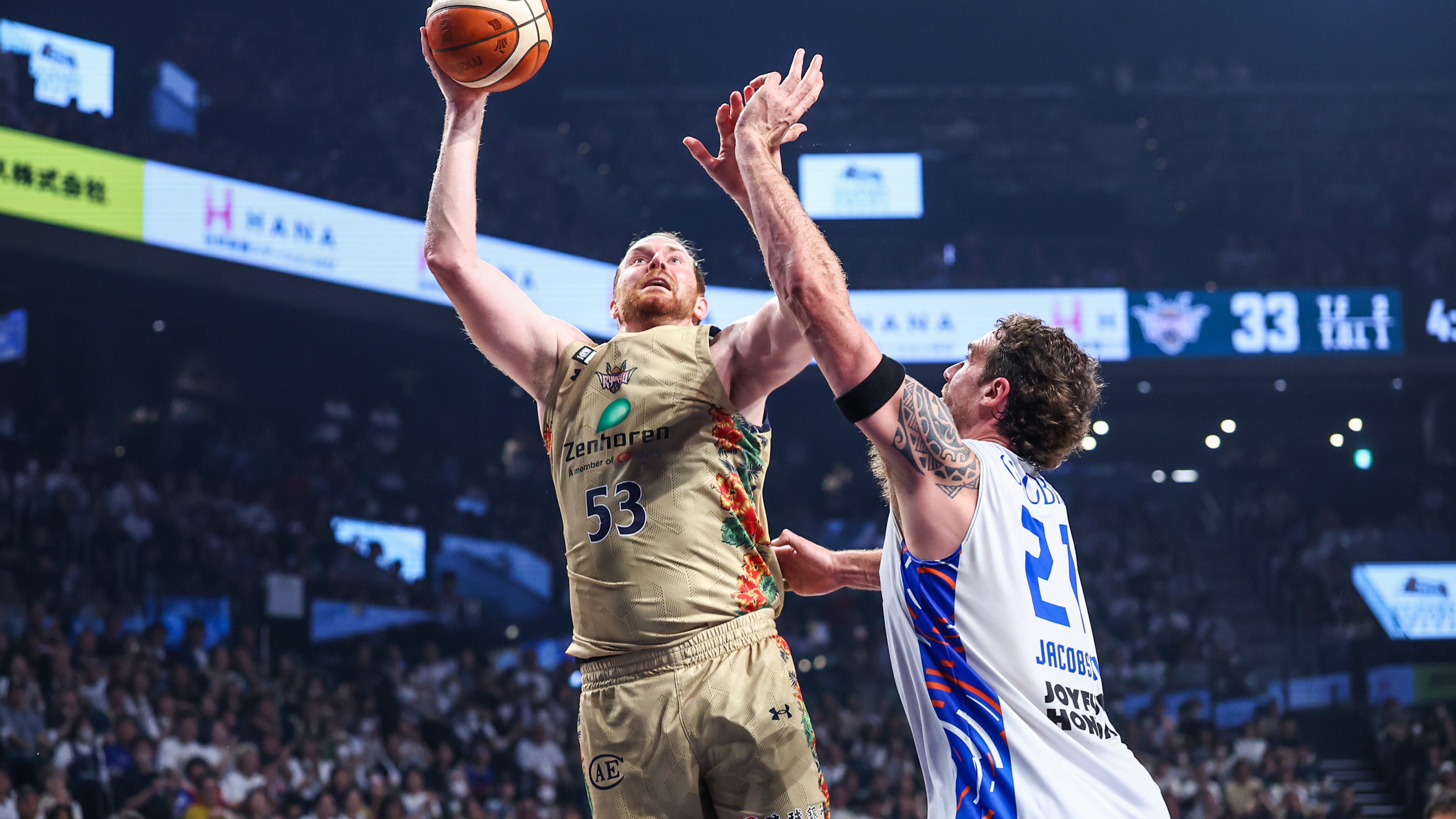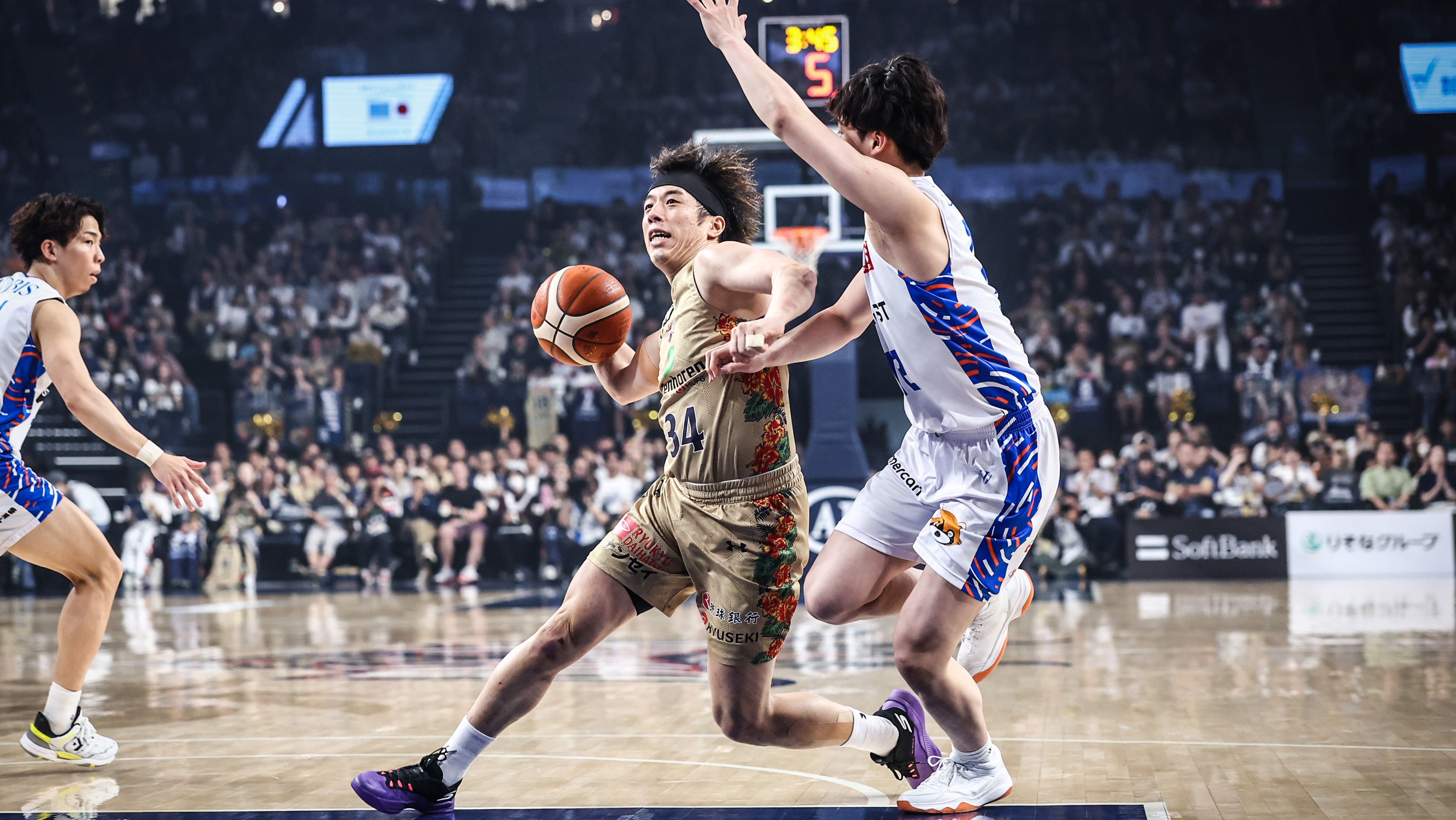 茨城をホームに迎えてのGAME1。開始早々、相手の連続3Pシュートで9点のランを許します。ディフェンスリバウンドを奪い#53 アレックス・カーク選手が2Pシュートを決めます。#21 デイミアン・ドットソン選手が3Pシュートを決めます。#8 佐土原遼選手が体を張ったディフェンスでボールを奪うとそのまま2Pシュートで加点します。しかし再び突き放され、一時13点差までリードを広げられるも、#4 ヴィック・ロー選手がオフェンスリバウンドをそのまま流し込み、続けて#14 岸本隆一選手が3Pシュートを射抜き得点を重ねます。#45 ジャック・クーリー選手がリング下から2Pシュートを決めます。#53 カーク選手がダンクシュートをたたき込むと、#14 岸本選手が3Pシュートを射抜きます。1クォーター終了間際に#10 荒川颯選手が3Pシュートを射抜き、22-24と2点差まで追い上げ1クォーターを終了します。