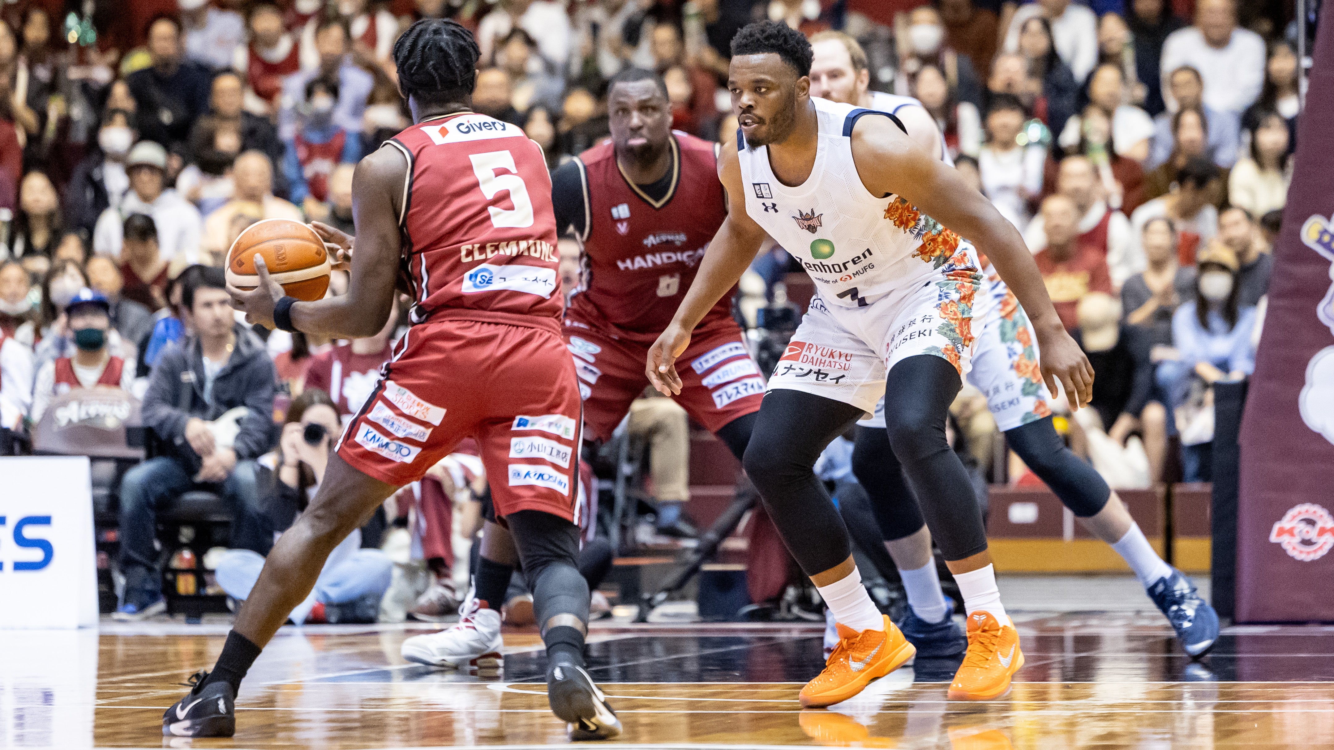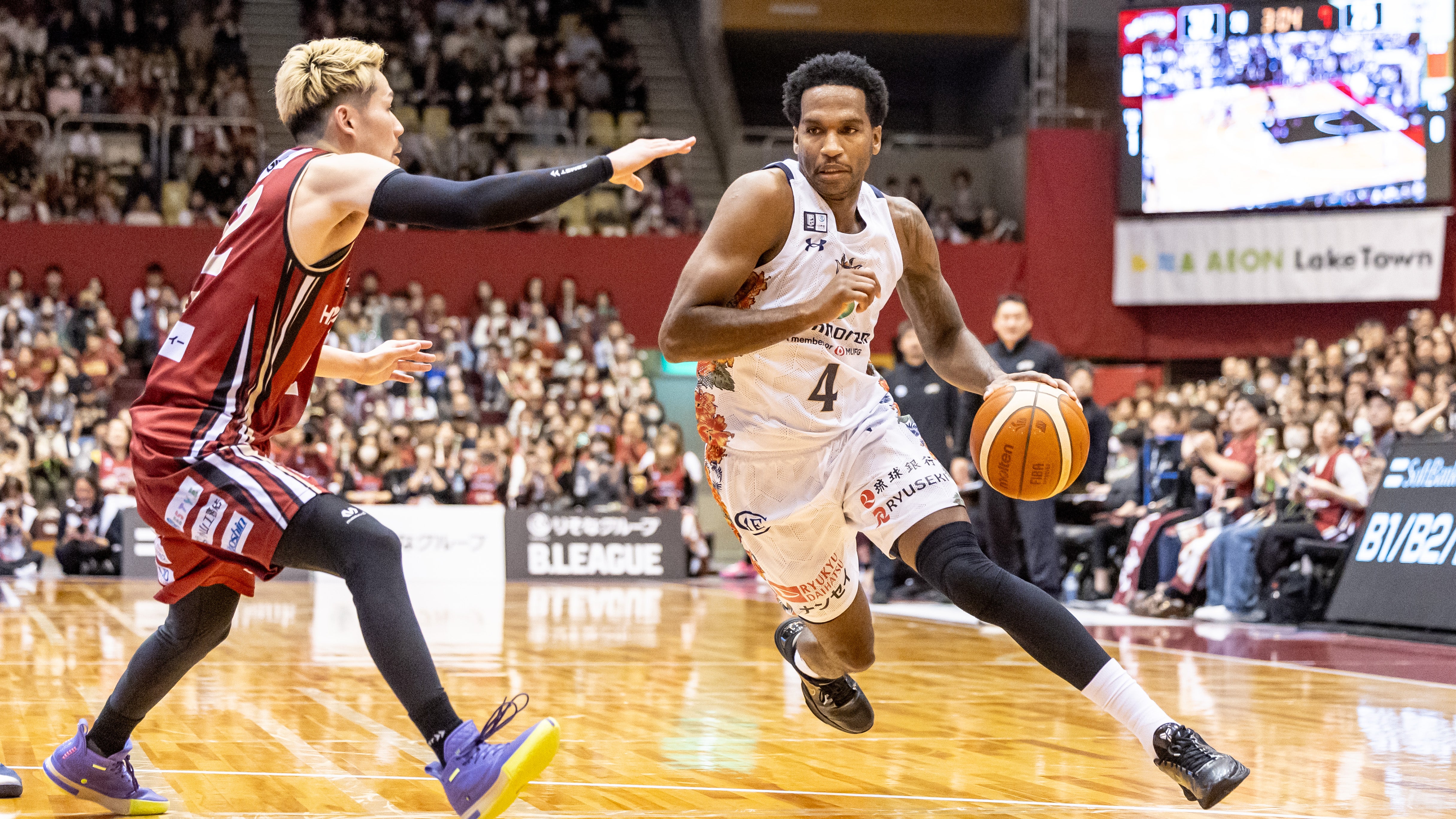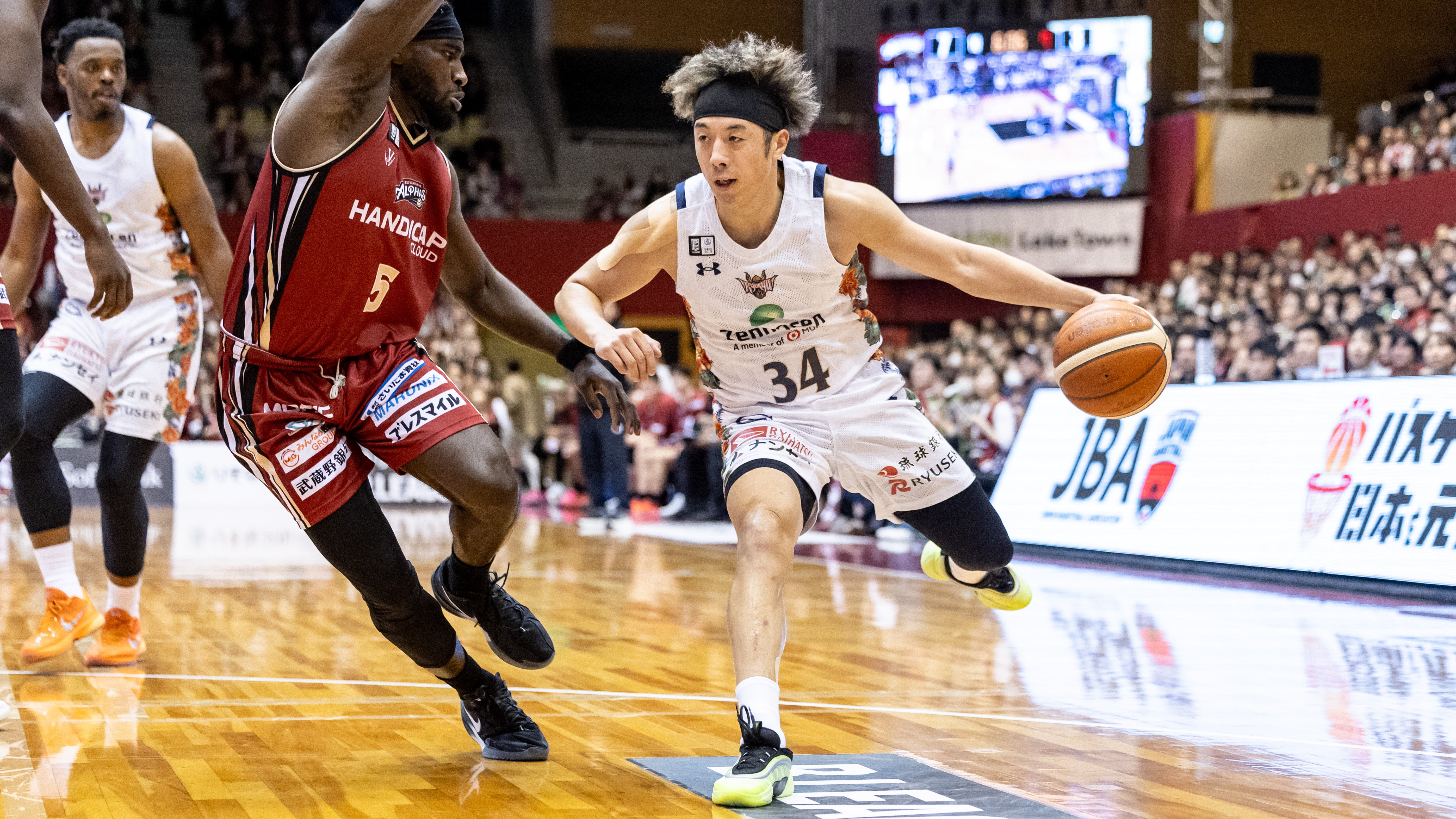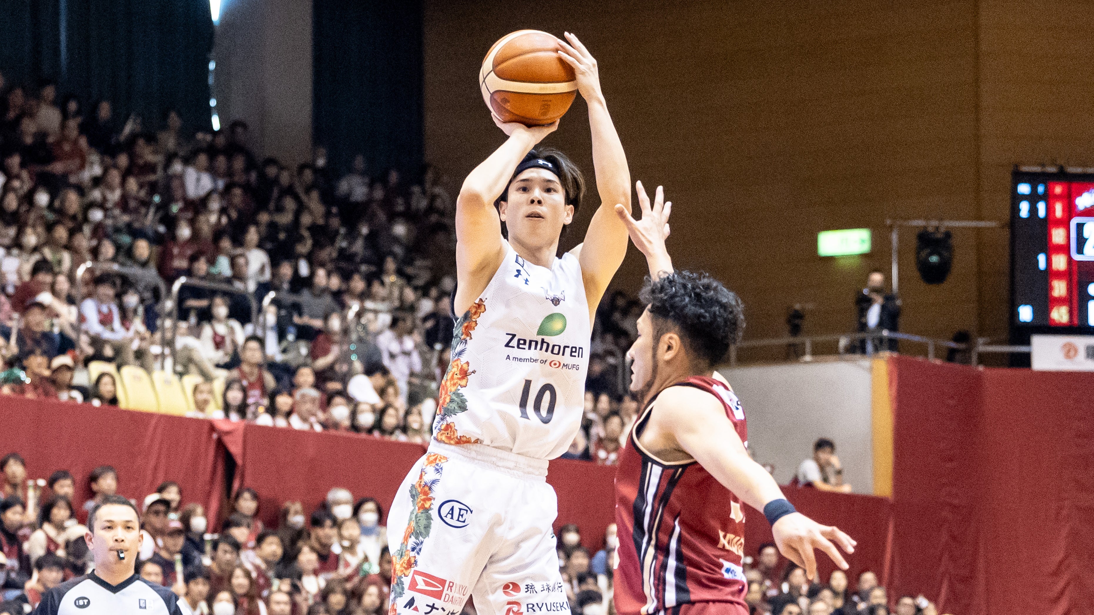 #4 ロー選手のパスを受けた#45 クーリー選手が2Pシュートを決めます。#47 平良彰吾選手のスティールから、#10 荒川颯選手が3Pシュートを射抜きます。#10 荒川選手がジャンプシュートを決めると、さらに#47 平良選手が3Pシュートで得点を重ねます。#10 荒川選手がミドルシュートを決めると、#4 ロー選手がジャンプシュートを沈めます。#14 岸本隆一選手がペイントアタックでレイアップシュートを流し込み、さらに3Pシュートを射抜き、33-38で5点のリードを許したまま前半を終了します。