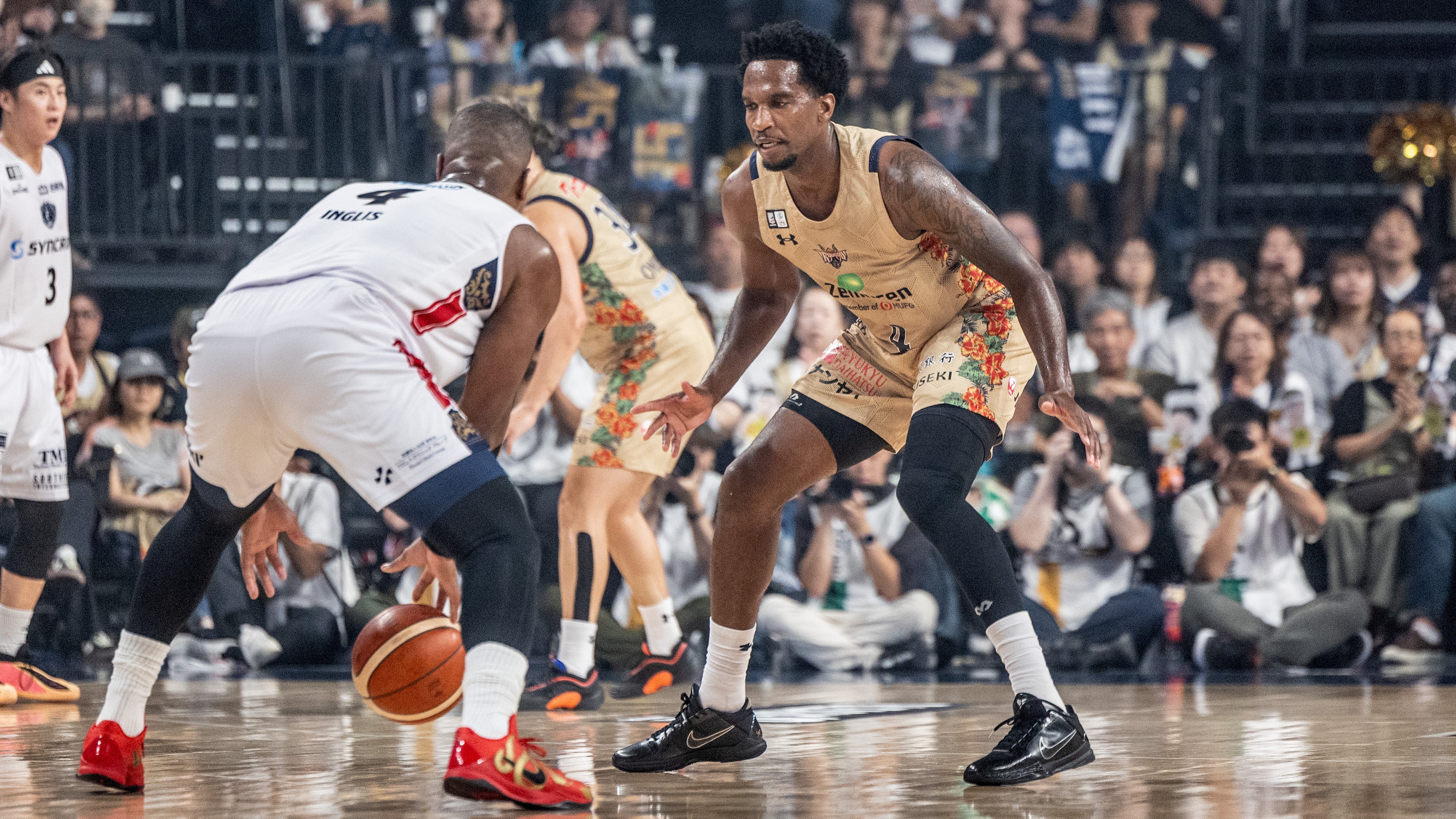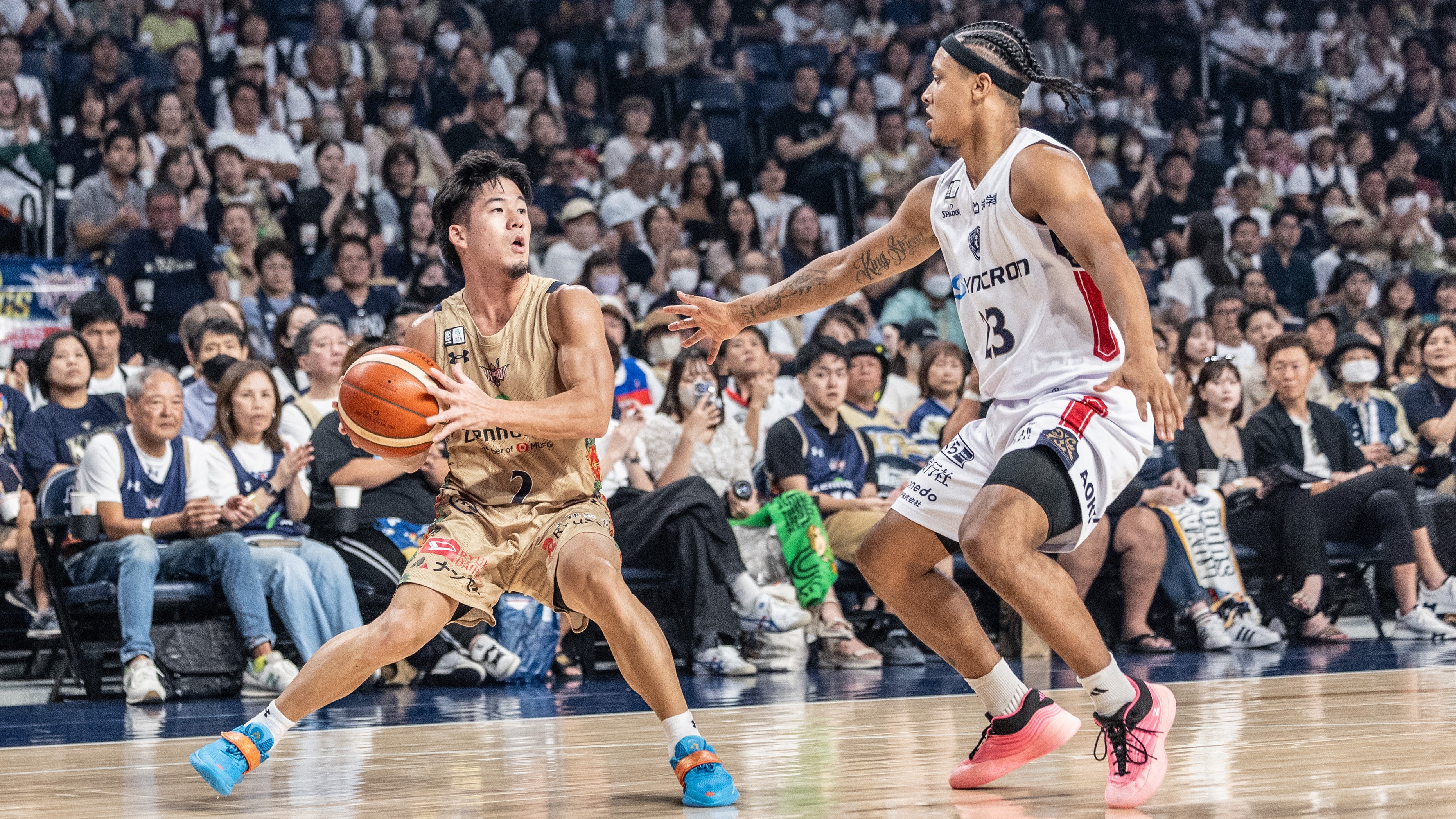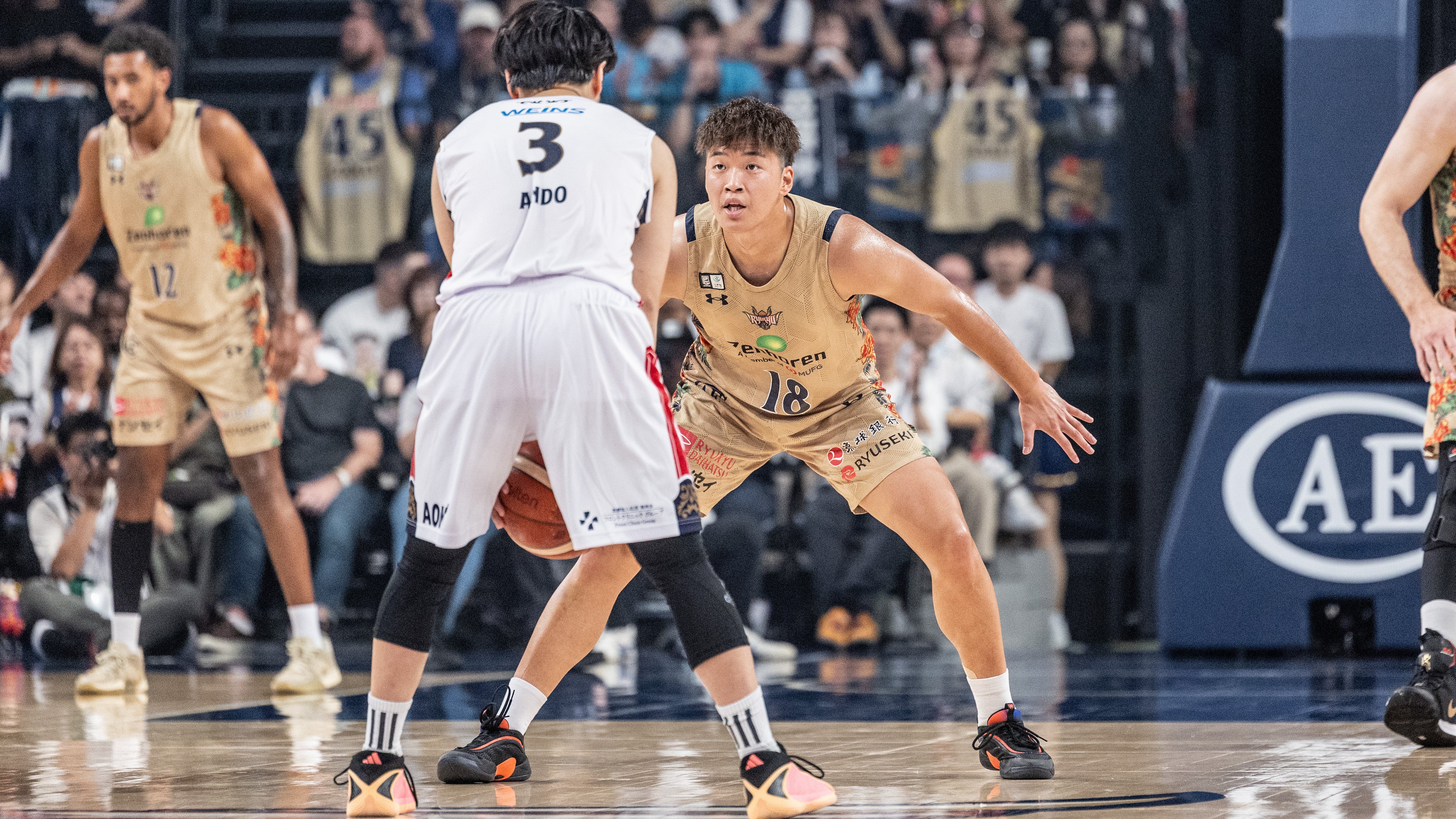 Bリーグ2025-26シーズン ホーム開幕戦となる横浜ビー・コルセアーズとのGAME1。#14 岸本隆一選手が開始早々、3Pシュートを射抜きます。#4 ヴィック・ロー選手がディフェンスリバウンドを奪い、そのままレイアップシュートを決めます。さらに#34 小野寺祥太選手が3Pシュートを沈めます。#53 アレックス・カーク選手、#12 ケヴェ・アルマ選手、#18 脇真大選手が2Pシュートで得点を重ねます。互いに譲らない試合展開の中、#4 ロー選手と#18 脇選手がインサイドから加点します。#12 アルマ選手が力強いダンクシュートをたたき込み、#53 カーク選手が2Pシュートで加点し、24-24で1クォーターを終了します。