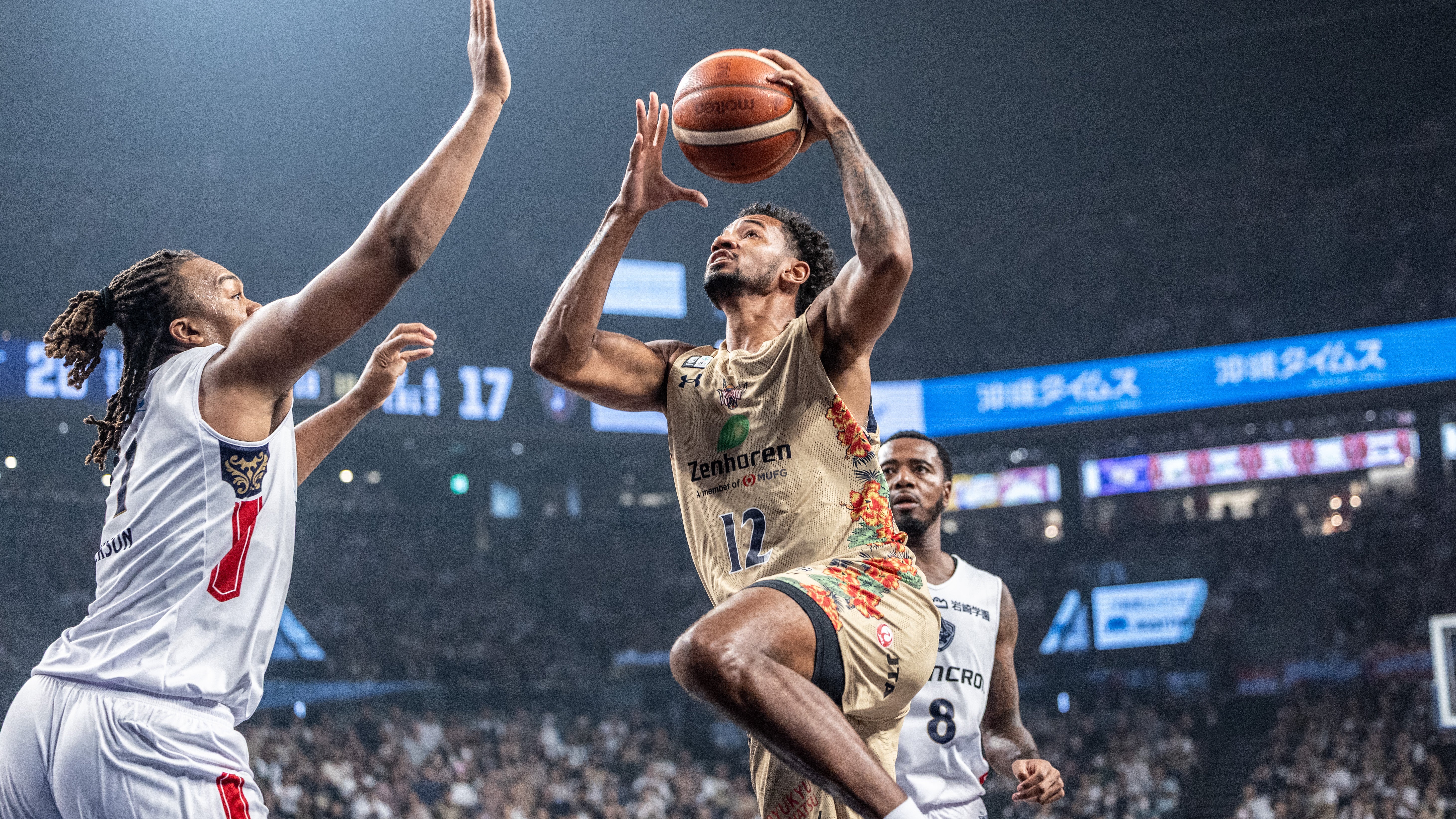 #45 ジャック・クーリー選手がゴール下から2Pシュートを決め、#12 アルマ選手が3Pシュートで加点します。両チームともに激しいディフェンスを続ける中、#4 ロー選手がダンクシュートを沈めると、#8 佐土原選手がリング下から2Pシュートを流し込みます。拮抗した展開のまま、40-38で前半を終了します。