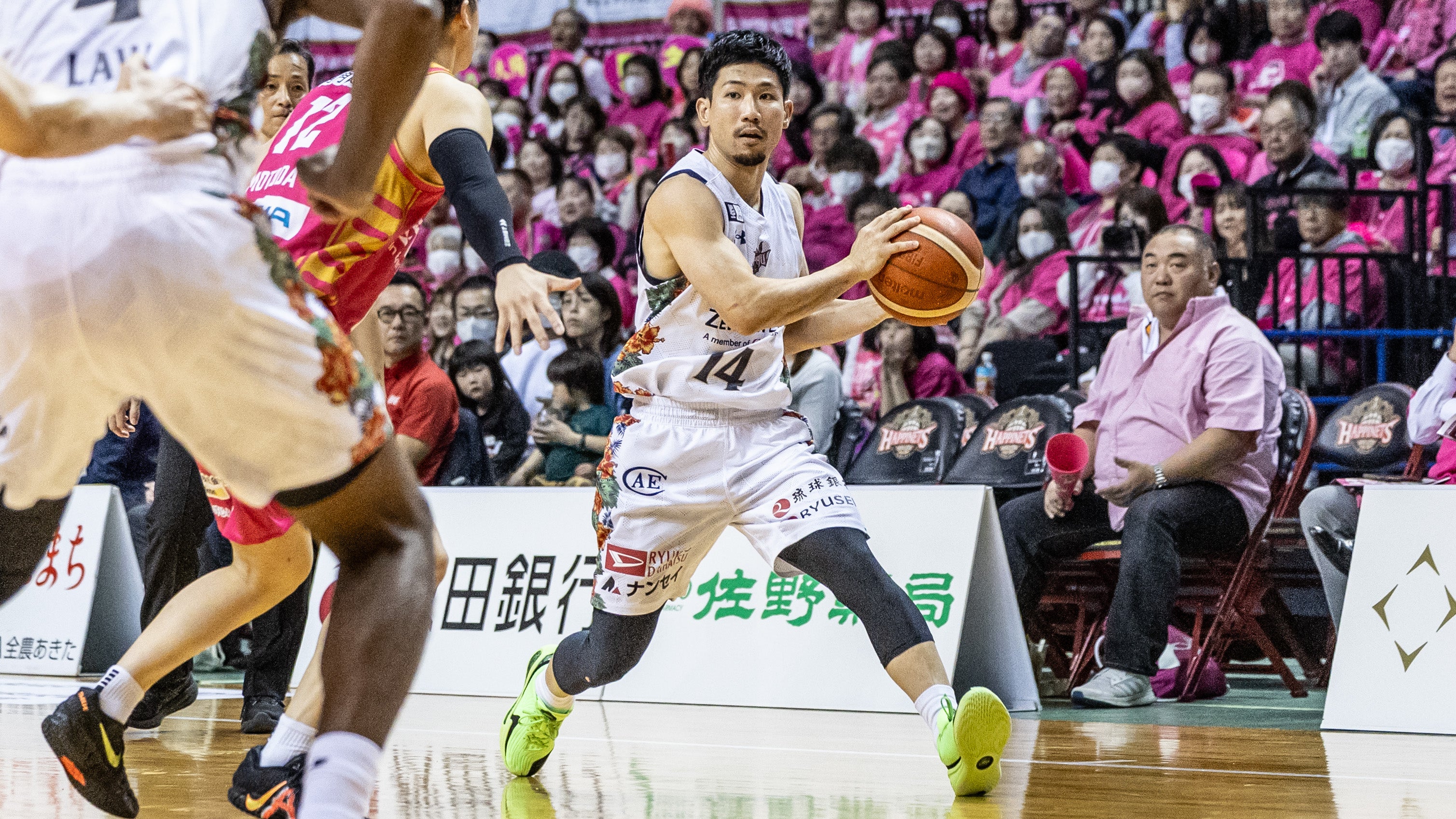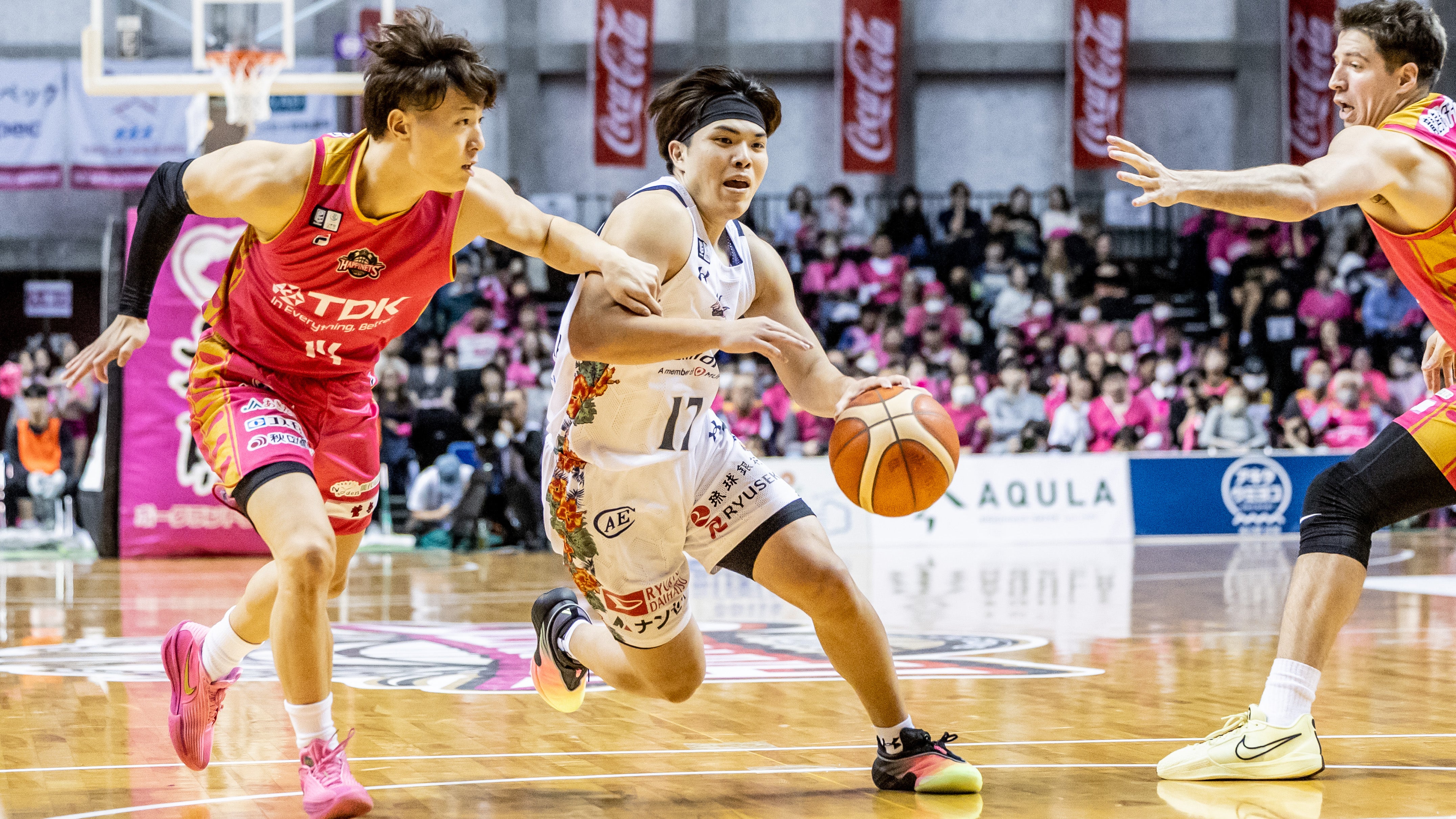 アウェー秋田とのGAME2。序盤から攻守の切り替えの早い展開の中、#14 岸本隆一選手がレイアップシュートを決めます。#45 ジャック・クーリー選手が2Pシュートを連続で決め切ります。#15 松脇圭志選手がコーナーからの3Pシュートを射抜きます。約2分半、互いに攻撃を仕掛けるも、堅いディフェンスで得点を決めることができず停滞した状態が続きます。一進一退の攻防が続き、16-17で1クォーターを終了します。