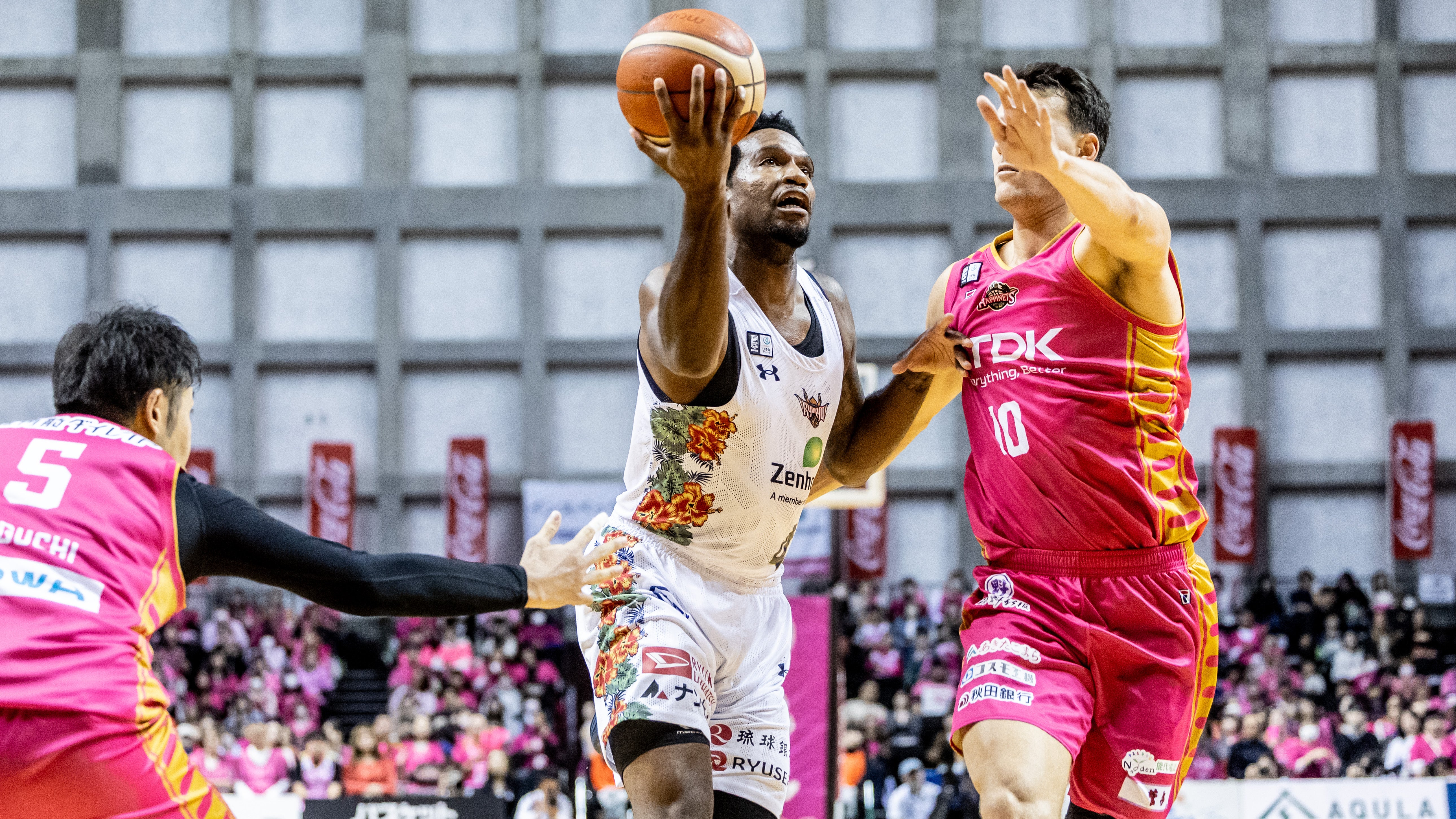 #12 ケヴェ・アルマ選手がリング下からジャンプシュートを決めます。#53 アレックス・カーク選手がダンクシュートを決めます。#47 平良彰吾選手がドライブからのレイアップシュートを流し込みます。#4 ヴィック・ロー選手がディフェンスリバウンドを奪うと、リング下の#45 クーリー選手が2Pシュートを押し込み加点します。#12 アルマ選手がオフェンスリバウンドを奪い、ダンクシュートを決めます。#53 カーク選手がシュートのこぼれ球を拾い、リングへ流し込み加点します。#4 ロー選手がジャンプシュートを沈め、37-37で前半を終了します。