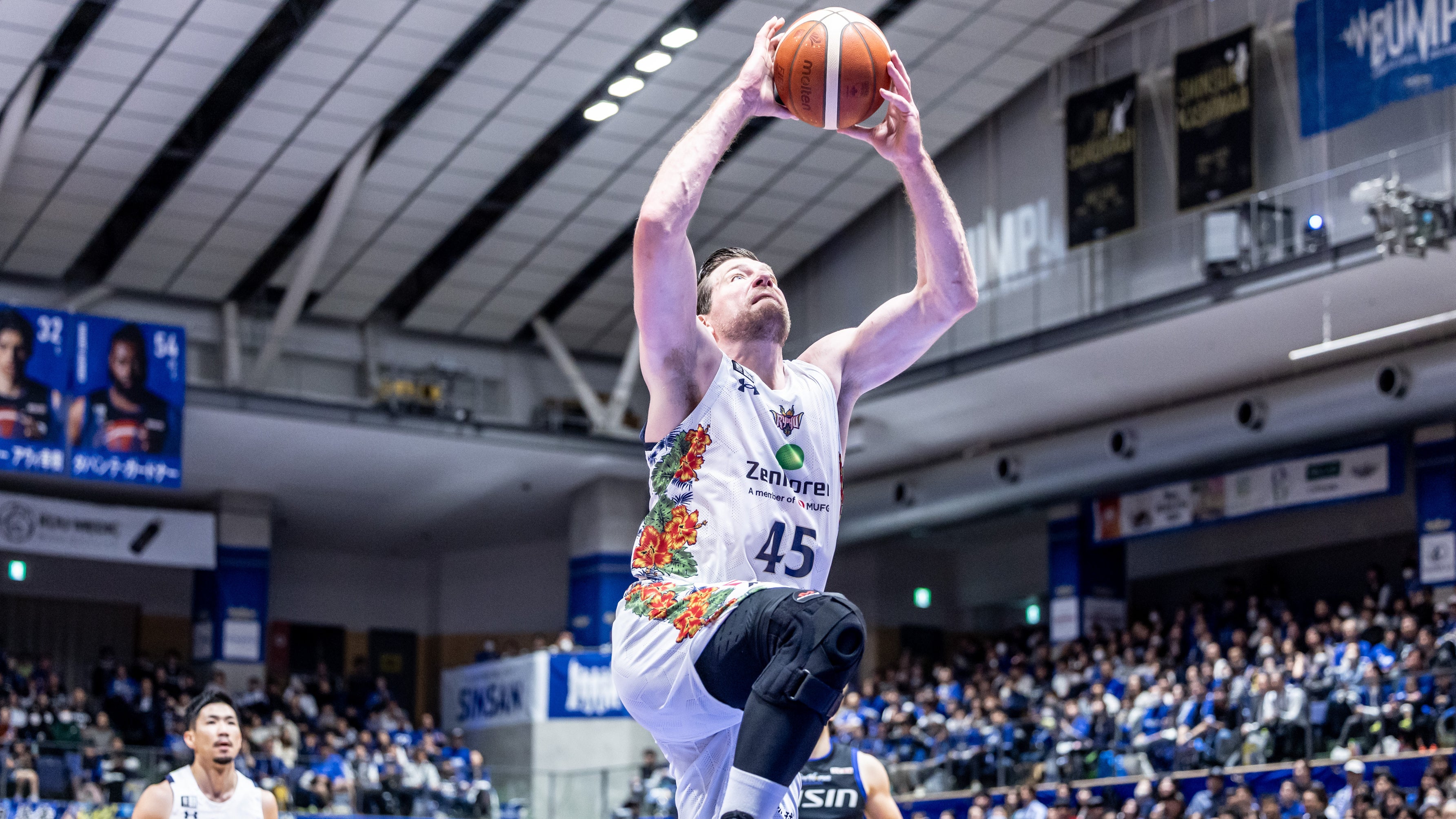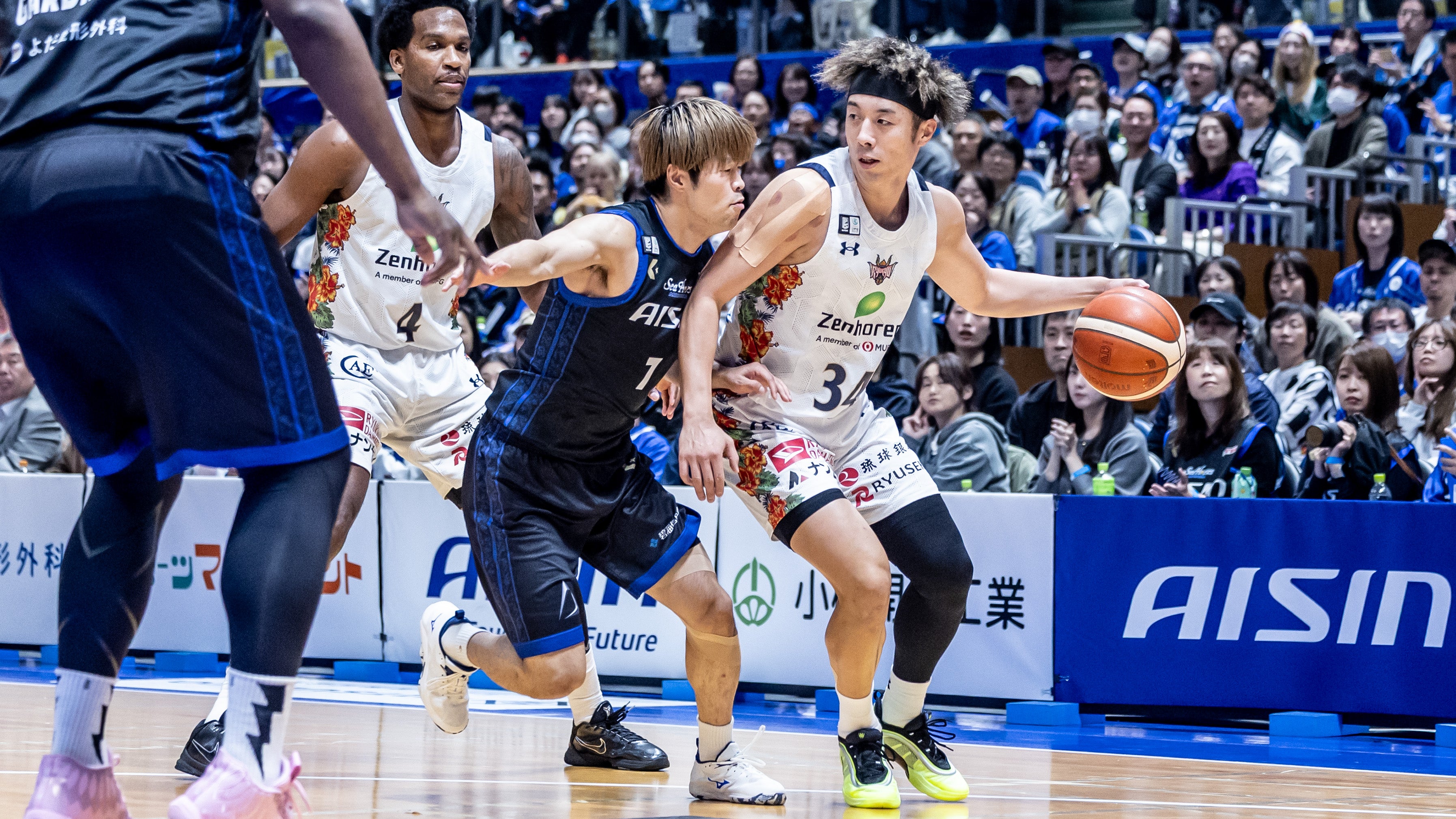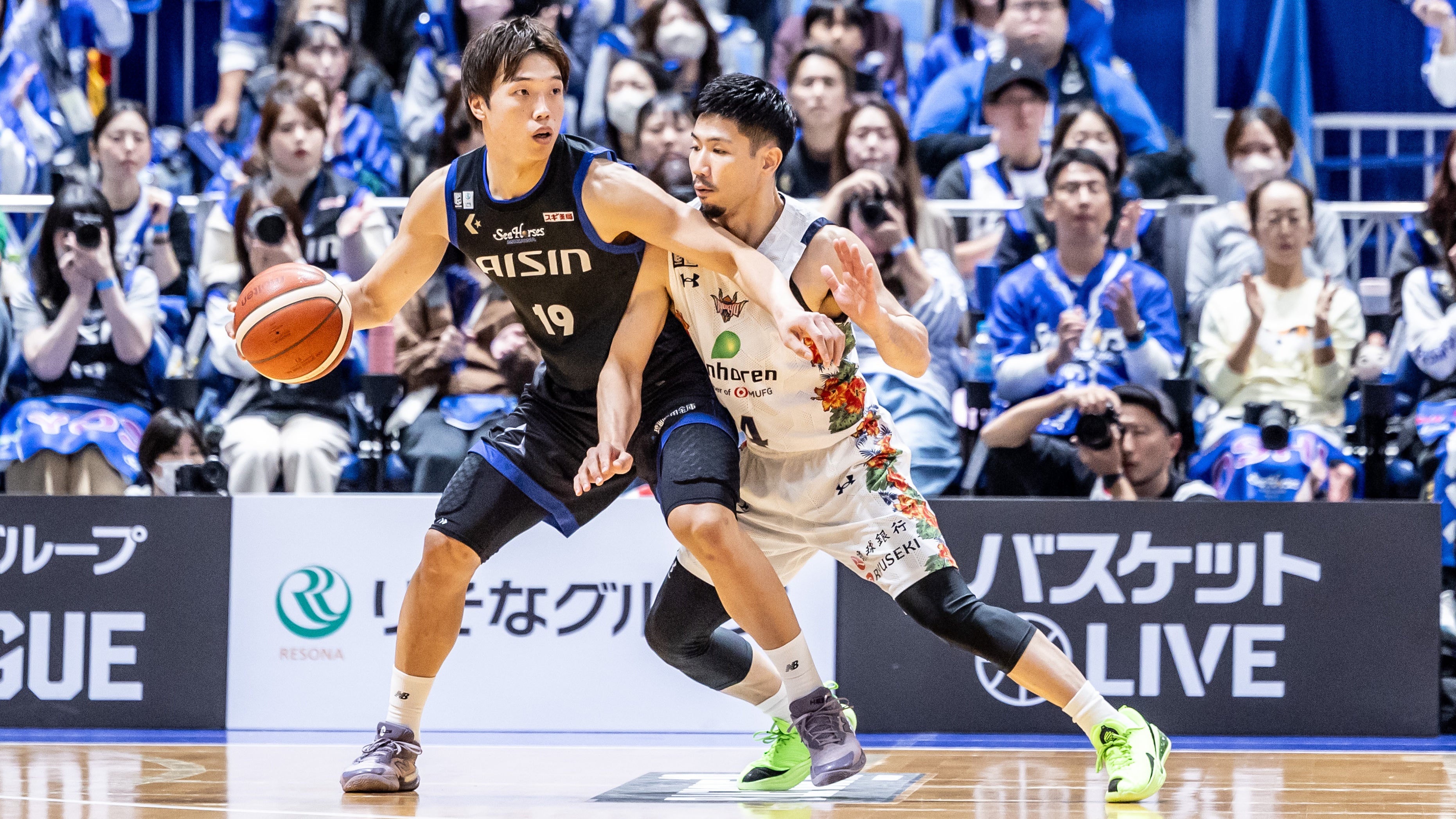 アウェーで行われた三河との一戦。#14 岸本隆一選手が3Pシュートを射抜き先制します。三河の強度の高いディフェンスに得点を阻まれ、さらにインサイドを中心とした攻撃により、11点のランを許します。#15 松脇圭志選手が3Pシュートを沈め、#8 佐土原遼選手が相手ディフェンスに体を当てながらレイアップシュートを沈めます。その後#45 ジャック・クーリー選手がスティールからそのままダンクシュートをたたき込みます。さらに#45 クーリー選手が2Pシュートを流し込みます。1クォーター終了間際に#10 荒川颯選手が3Pシュートを沈め、15-17で1クォーターを終了します。