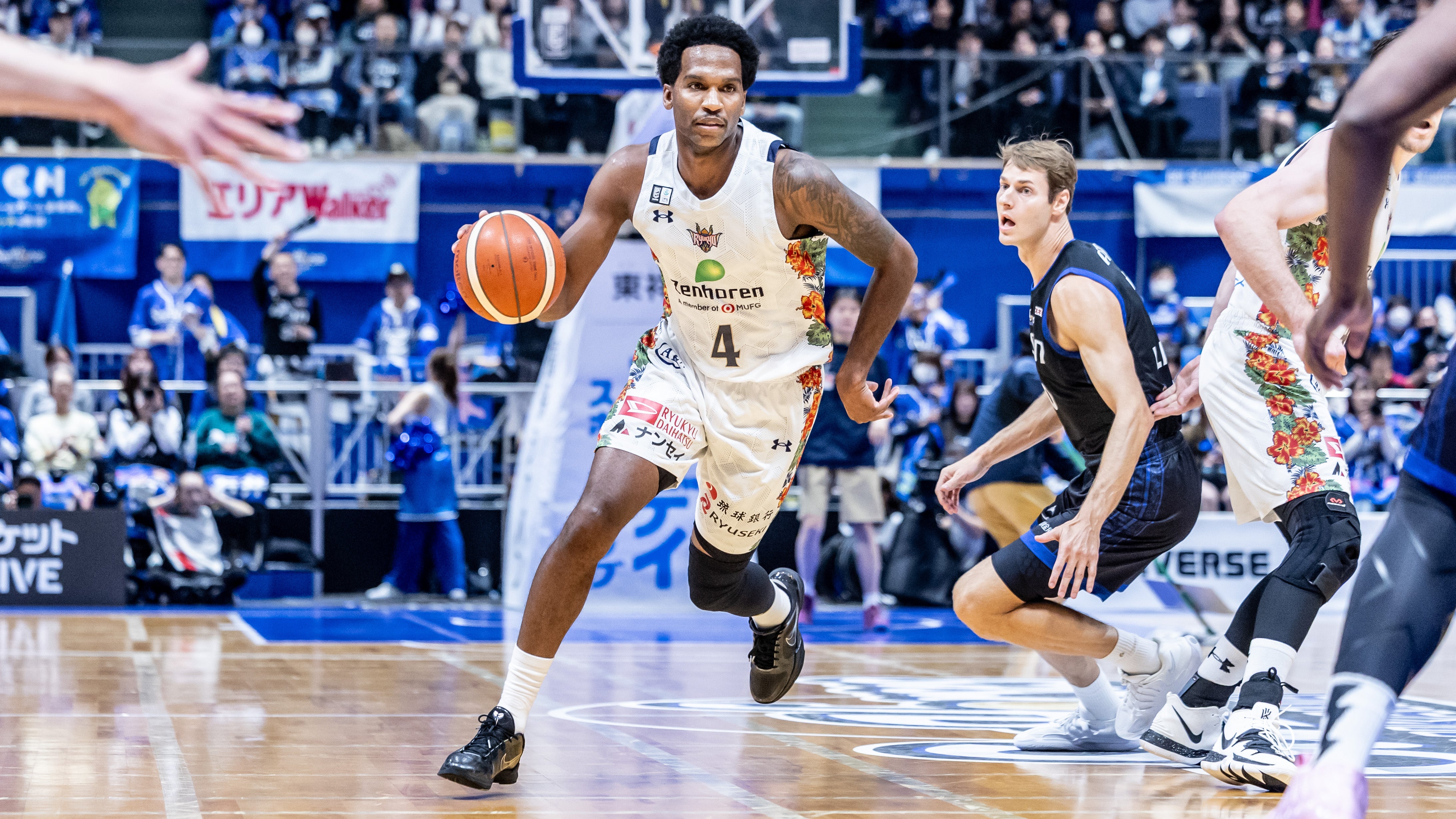 #8 佐土原選手がコーナーから3Pシュートを決め切り、さらに#10 荒川選手のディフェンスの隙を突いたパスを受け#53 カーク選手がダンクシュートを沈めます。#8 佐土原選手が3Pシュートを射抜きます。#8 佐土原選手がこの日3本目の3Pシュートを決め、28-25でリードを奪います。#4 ヴィック・ロー選手がミドルシュートを沈めます。#45 クーリー選手がフローターシュートを流し込み、#10 荒川選手が3Pシュートを決めリードを広げます。#4 ロー選手がフローターシュートで加点し、#53 カーク選手がダンクシュートを決め切ります。47-39でリードを保ったまま前半を終了します。