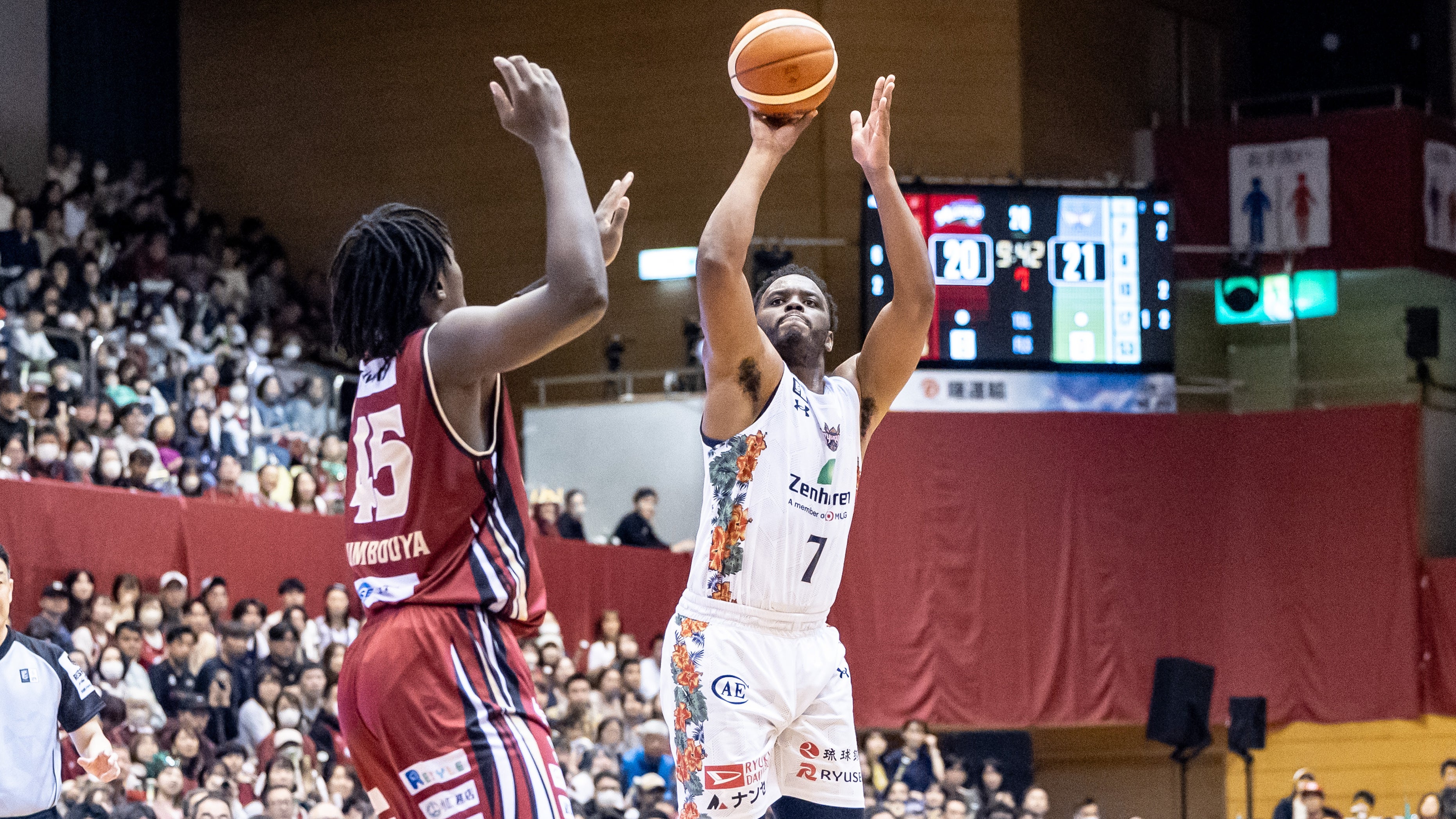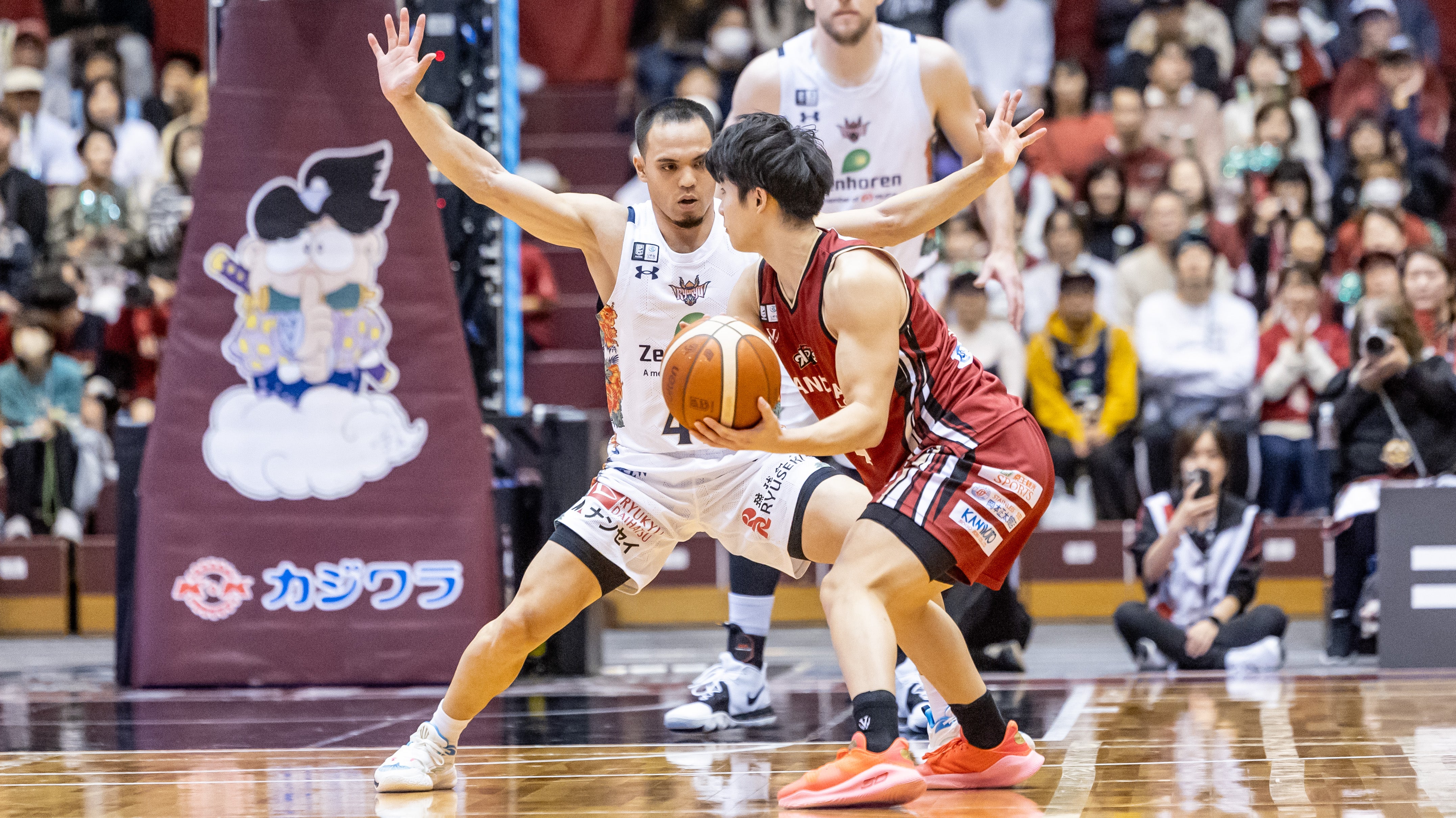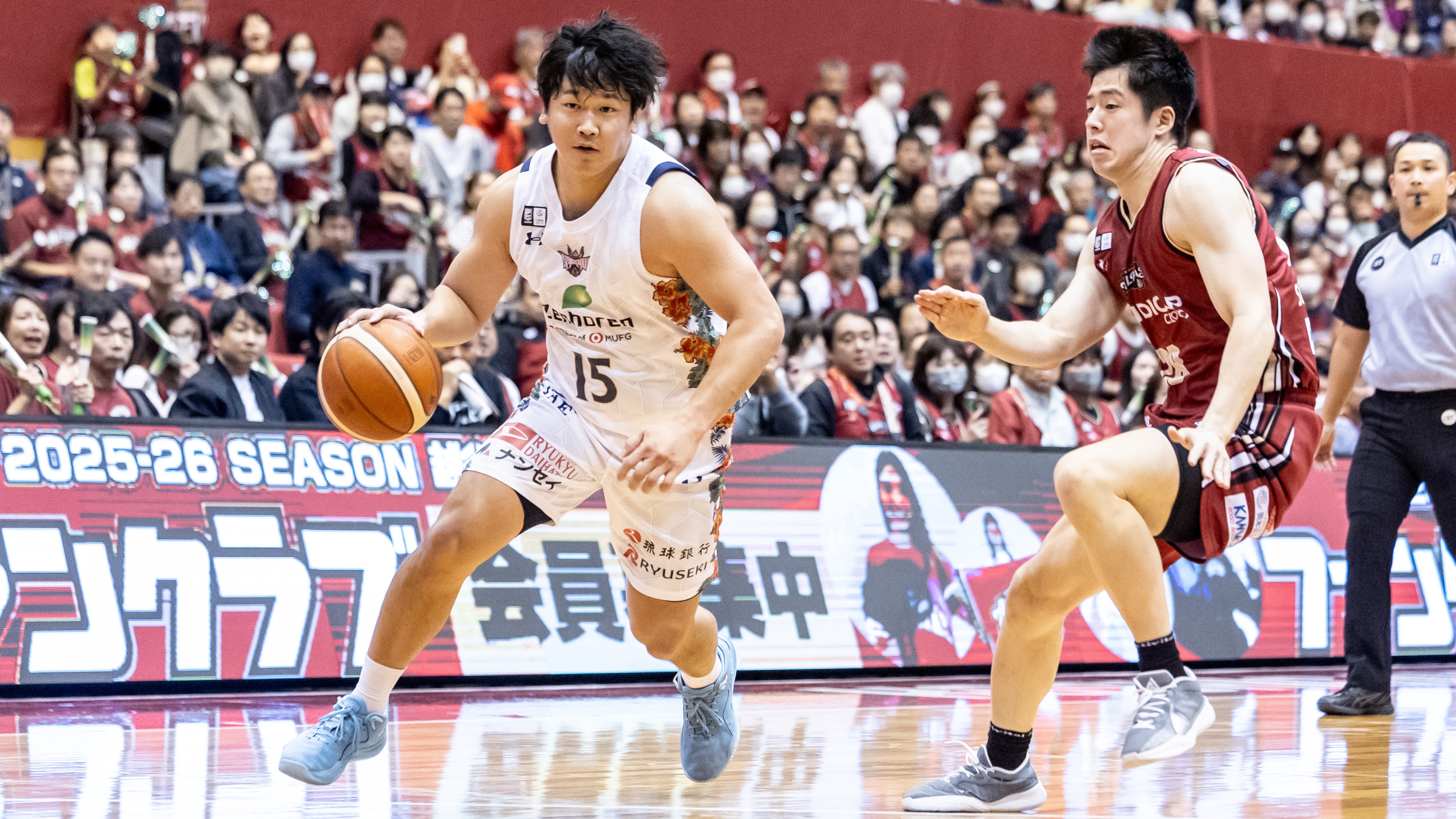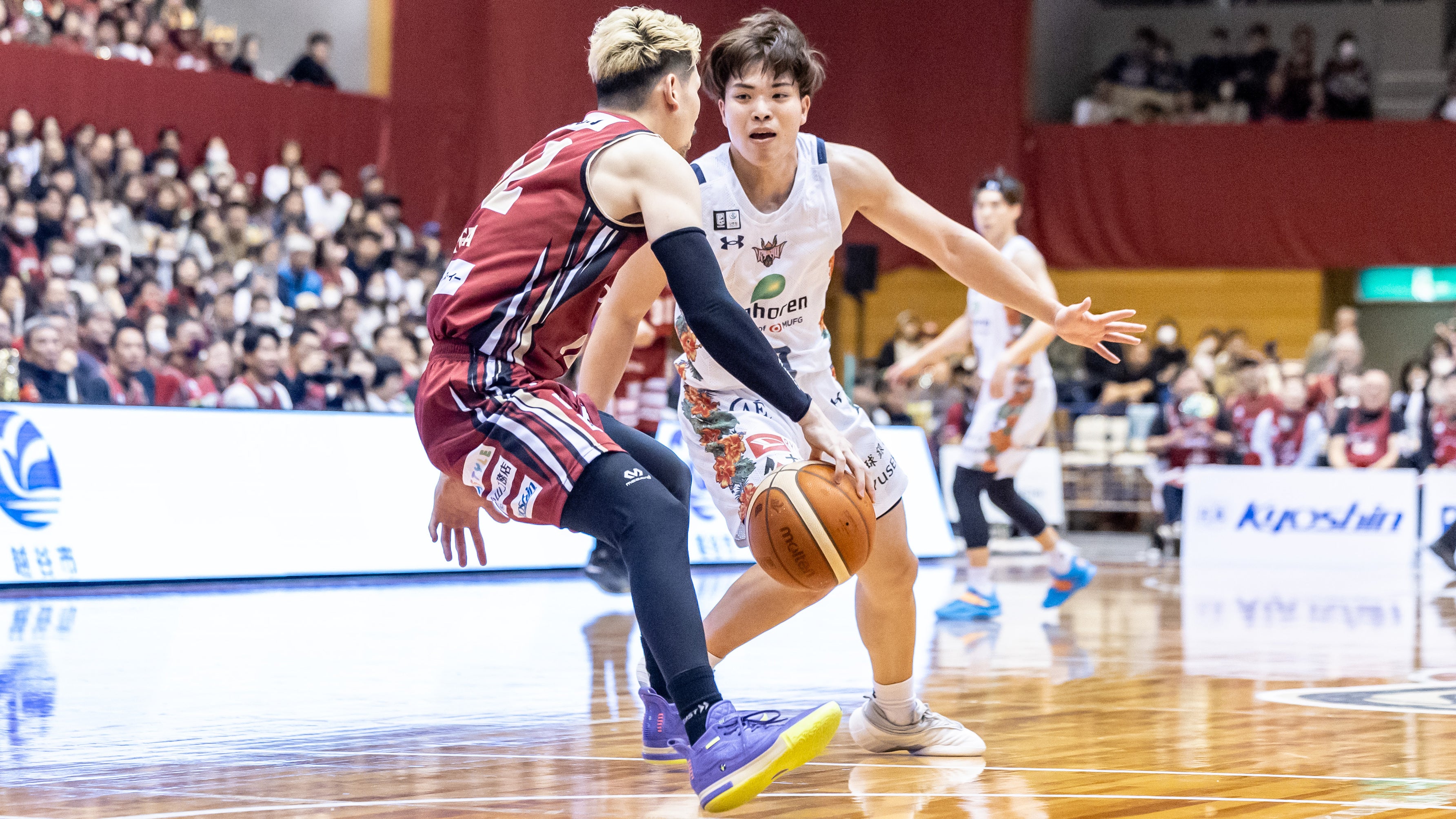 越谷の粘り強いディフェンスに得点を阻まれ我慢の時間が続きます。#47 平良彰吾選手が2Pシュートを決めます。#15 松脇選手が3Pシュートを5本中5本成功させ、越谷の追い上げを阻みます。#53 アレックス・カーク選手のスティールから、#4 ロー選手がパスを受け、ダンクシュートをたたき込みます。#2 小針幸也選手がスピードを活かしたドライブで中央突破し、レイアップシュートを流し込み、77-59で勝利を果たしました。