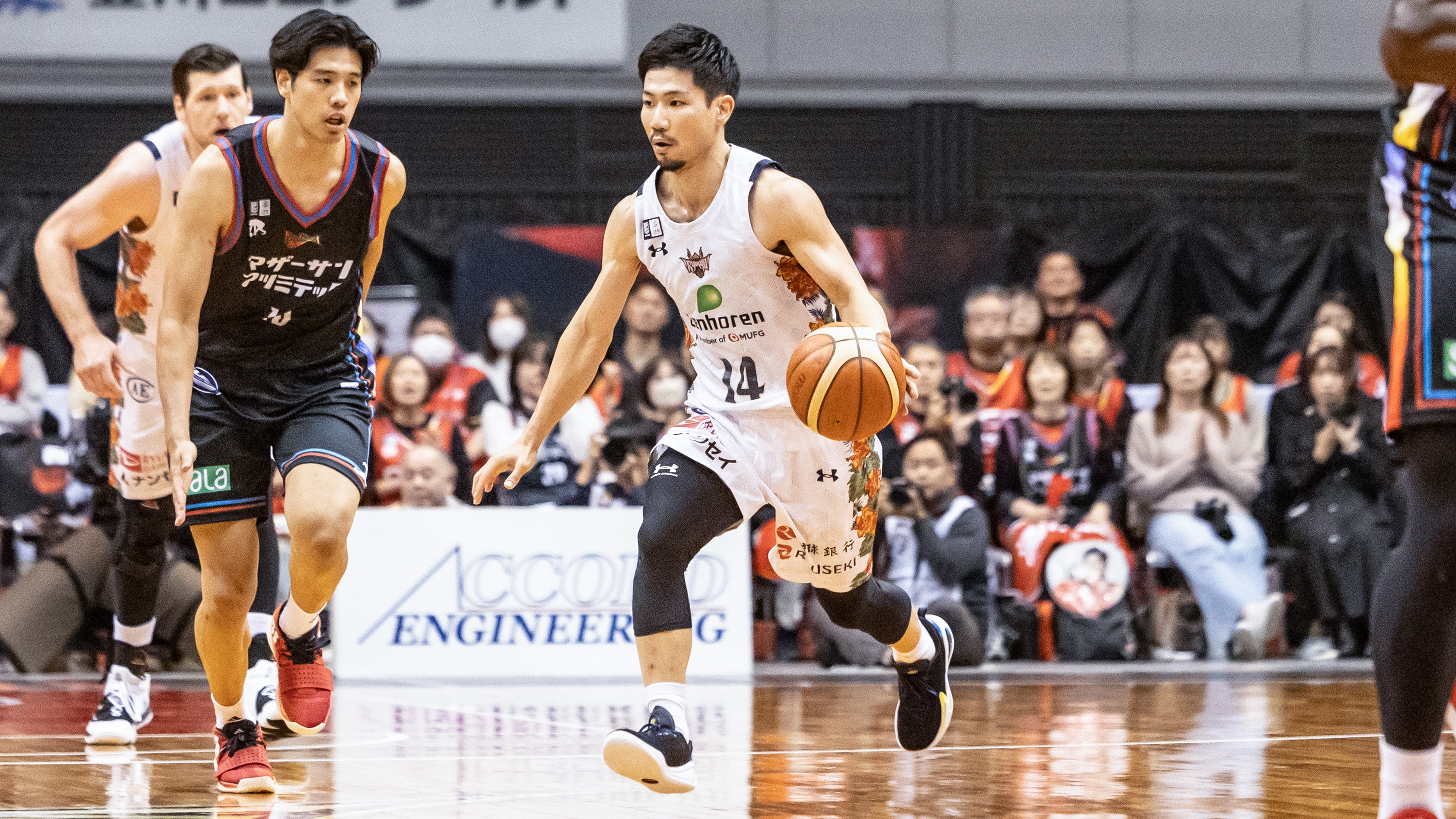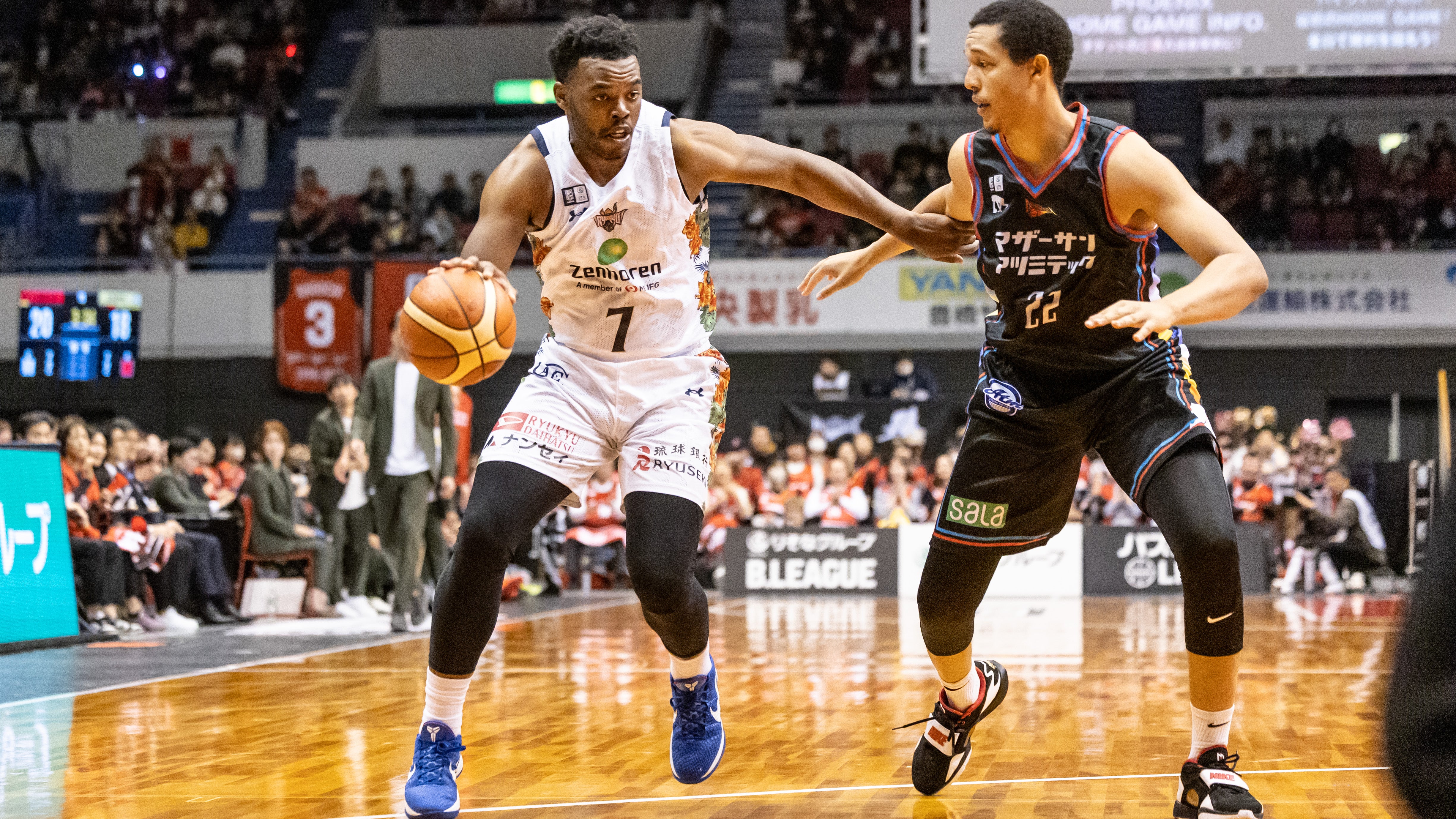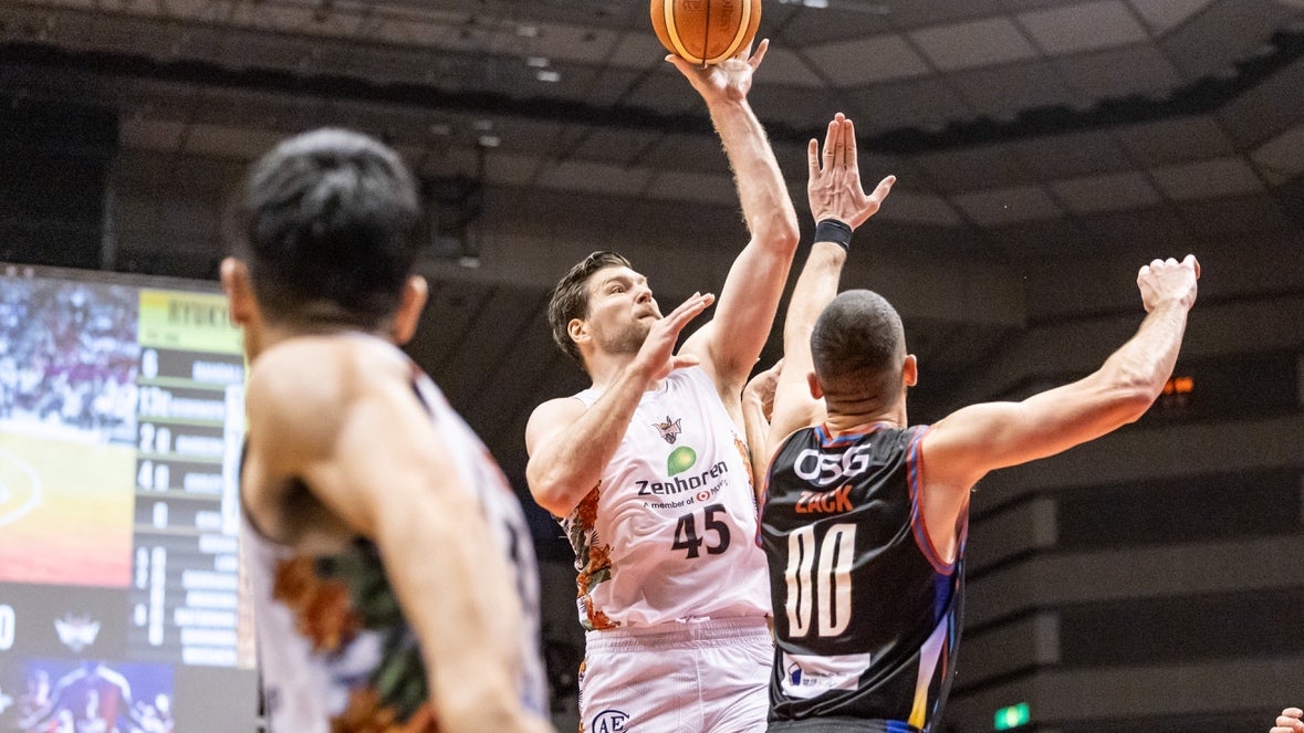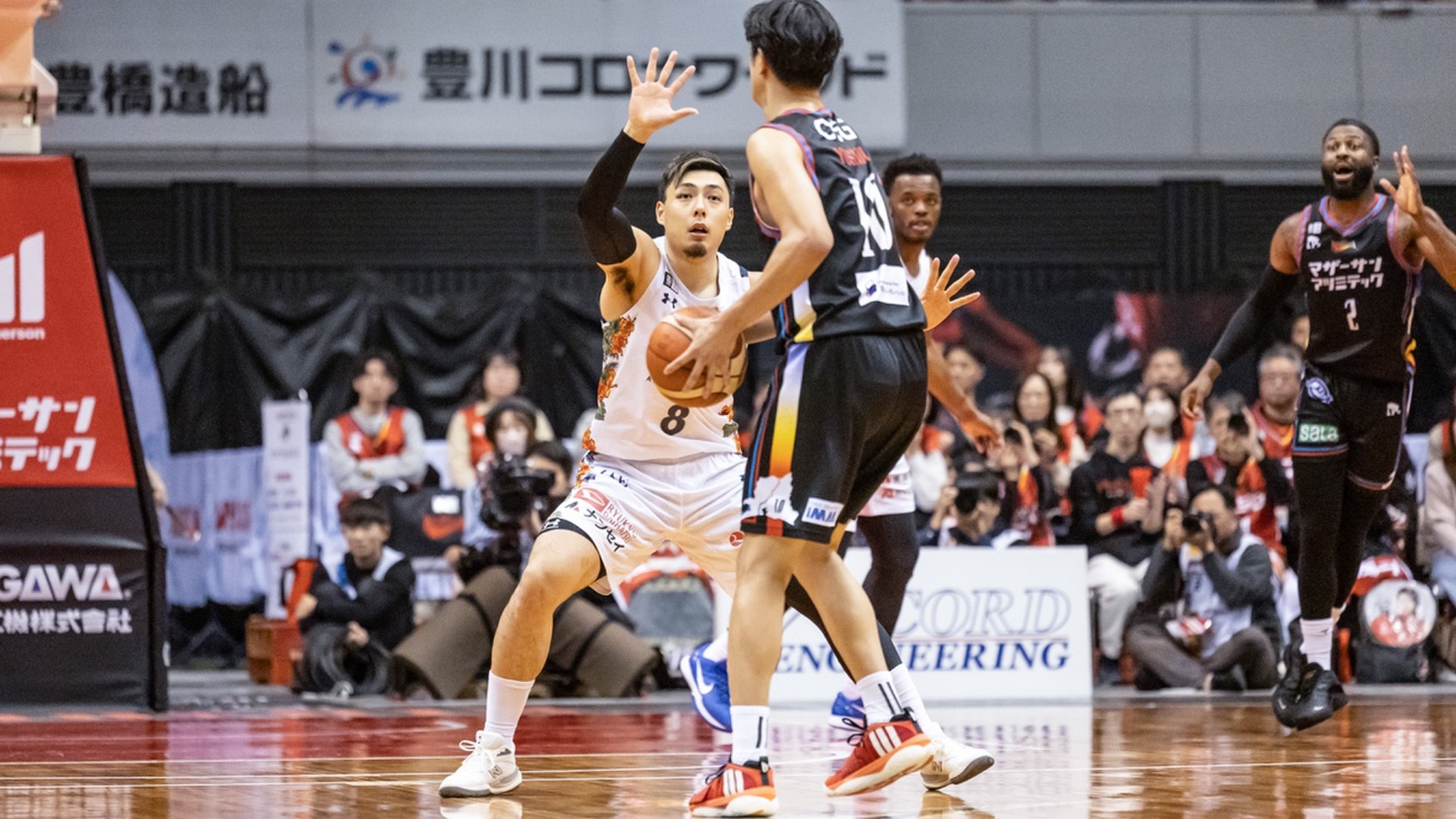 アウェー三遠とのGAME2。GAME1に続き、この日も#14 岸本隆一選手が3Pシュートで先制します。ロングパスを受けた#45 ジャック・クーリー選手がリング下から加点し、#15 松脇圭志選手が3Pシュートを射抜きます。#34 小野寺祥太選手がレイアップシュートを決め、さらに#15 松脇選手が3Pシュートを決めると、#14 岸本選手がジャンプシュートで得点を重ねます。#4 ヴィック・ロー選手がドライブから2Pシュートを沈めます。その後はディフェンスの強度を上げた三遠に得点を阻まれ、さらに7点のランを許し、23-29で1クォーターを終了します。