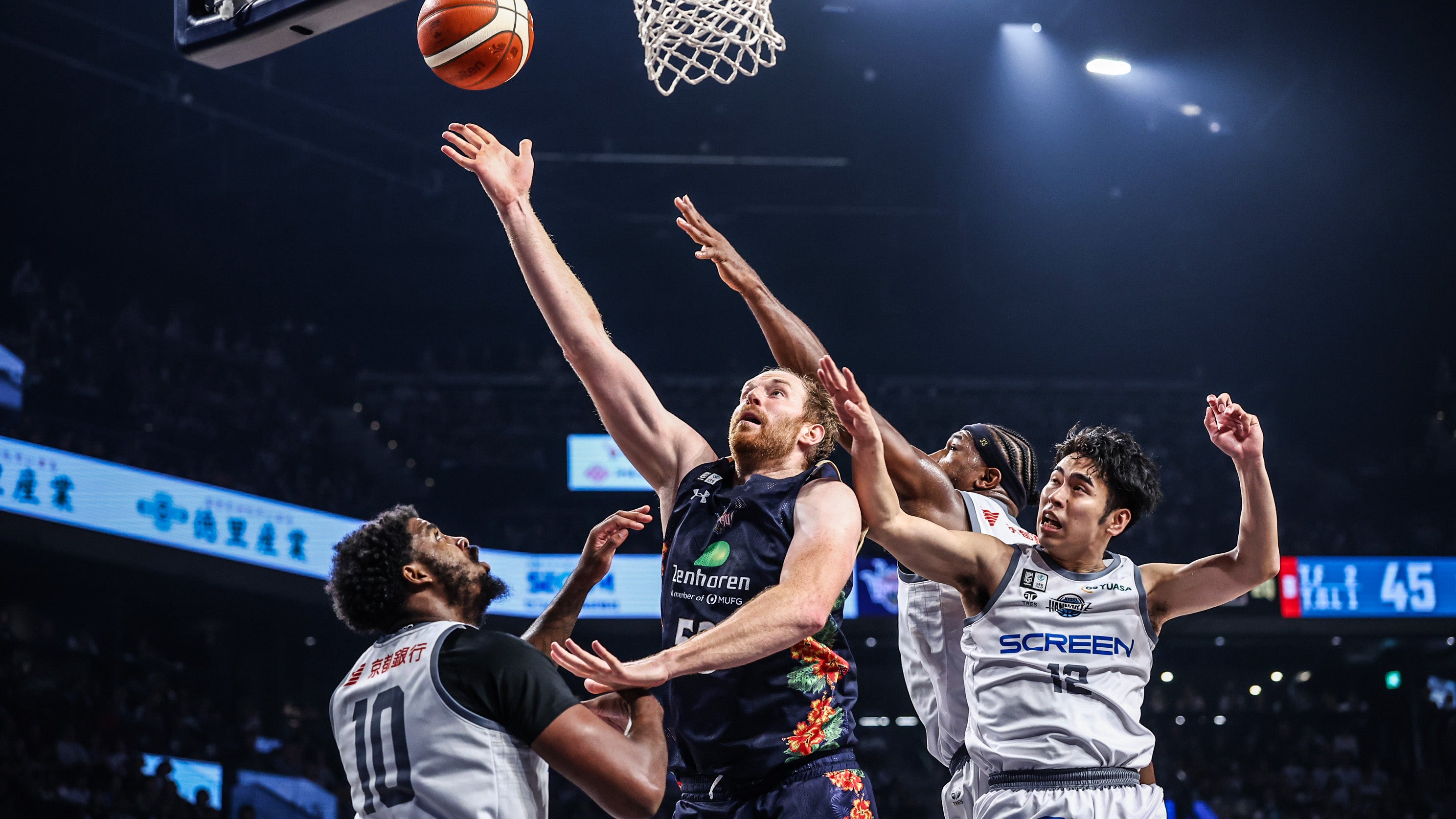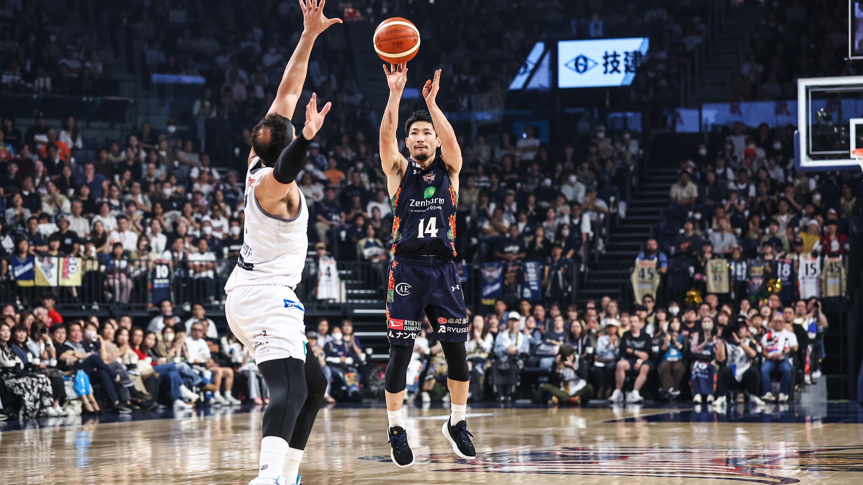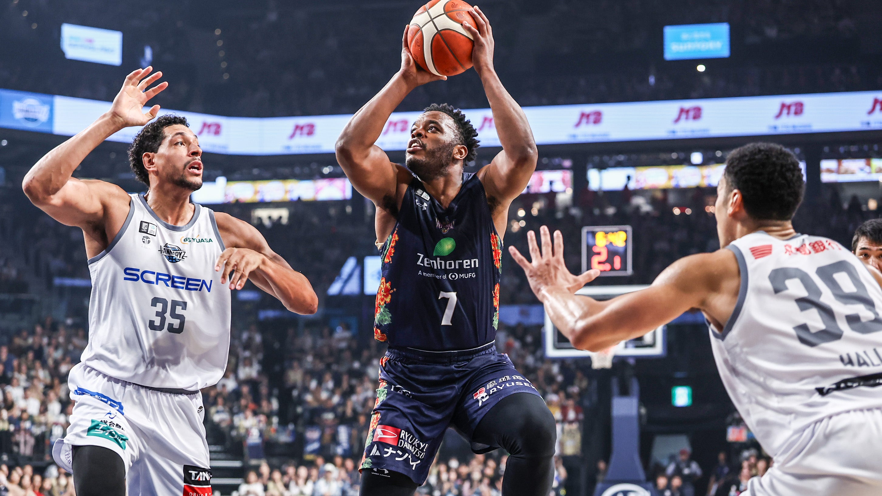 京都ハンナリーズをホームに迎えたGAME1。#15 松脇圭志選手が3Pシュートで先制します。#45 ジャック・クーリー選手がリング下からこぼれ球を流し込み加点します。#7 アンドリュー・ランダル選手がファールを受けながらもジャンプシュートを沈め、続くフリースローも決め切ると、#14 岸本隆一選手が3Pシュートで得点を重ねます。#8 佐土原遼選手がペイントエリアに内に侵入しレイアップシュート、続けてダンクシュート、さらに#14 岸本選手がレイアップシュートで加点し、獲得したフリースロー1本も沈めます。#53 アレックス・カーク選手がインサイドからジャンプシュートで加点するも、4点のリードを許したまま22-26で1クォーターを終了します。