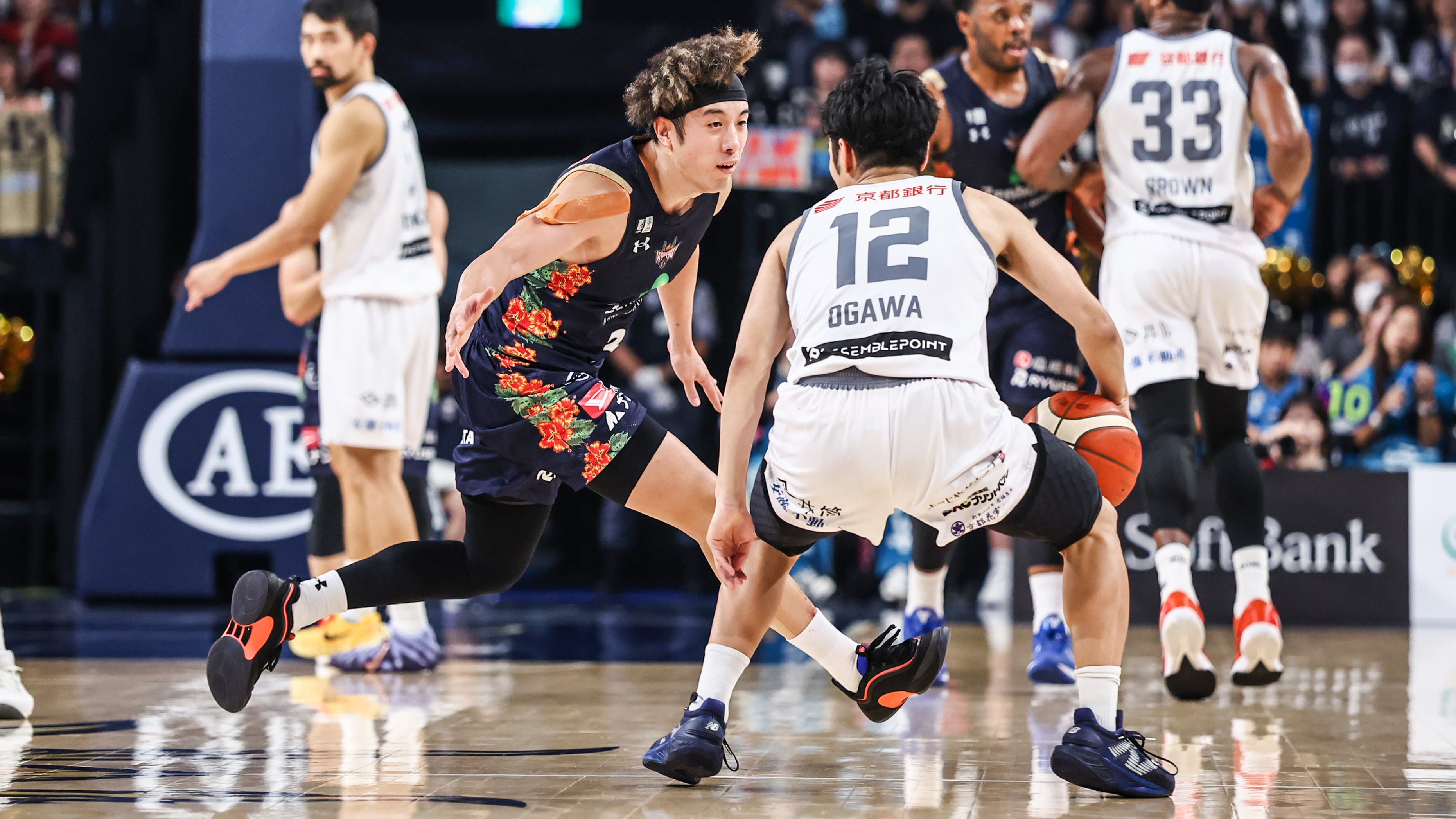 #18 脇真大選手が3Pシュートを射抜きます。#45 クーリー選手がペイントエリア内の1対1で競り勝ち2Pシュートで加点すると、#10 荒川颯選手が3Pシュートを決めます。素早いパス回しで相手のディフェンスを崩すと、#14 岸本選手が3Pシュートを決め切ります。さらに果敢にオフェンスリバウンドを奪うと、パスを受けた#14 岸本選手が3Pシュートを沈めます。#34 小野寺祥太選手がリング下からシュート、続けて3Pシュートを決めます。ペイントエリアで細かくパスを繋ぎ、#53 カーク選手がゴール下から得点を積み重ねると、51-46でリードを奪い前半を終了します。