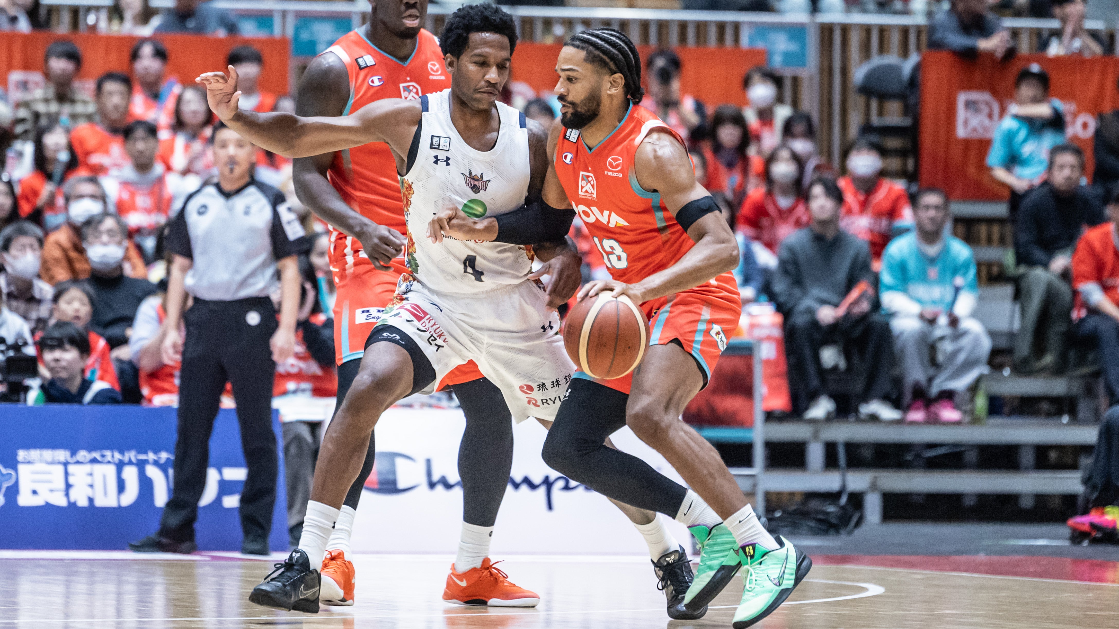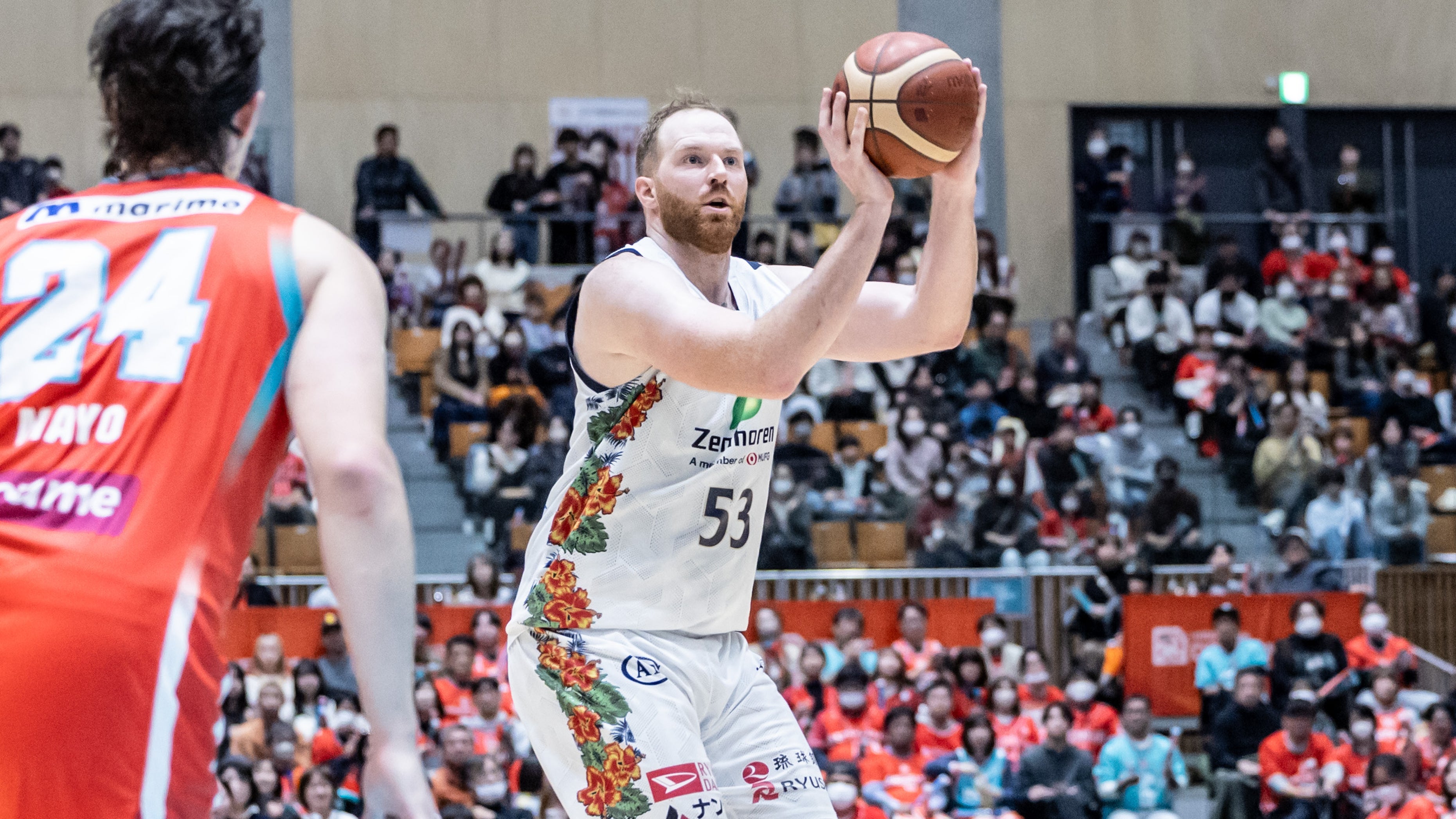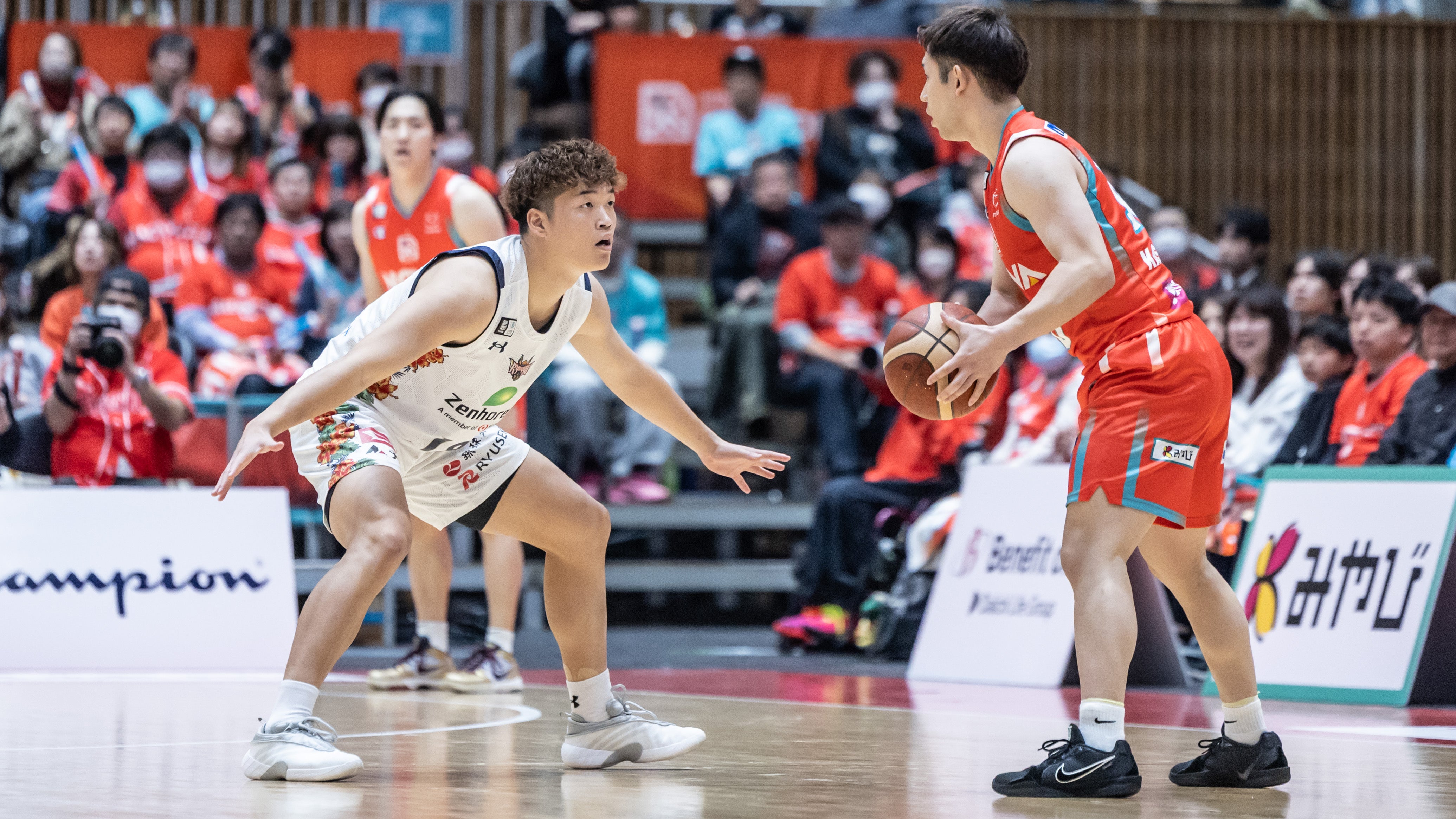 #17 崎濱秀斗選手のノールックパスを受けた#8 佐土原選手が3Pシュートを射抜きます。#53 カーク選手がリング下でパスを受けシュートで加点します。#8 佐土原選手、#21 ドットソン選手がペイントアタックから2Pシュート、続く#4 ロー選手もペイントエリアからのジャンプシュートを決めると、#21 ドットソン選手が3Pシュートを決め得点を重ねます。キングスは約3分間加点のない我慢の時間帯が続きますが、#45 クーリー選手がフリースロー1本を決めると、ペイントエリア中央からパスを受けた#4 ロー選手が2本連続シュートを決め切ります。さらに#4 ロー選手が3点プレー、2Pシュートを決め切り47-38で前半を終了します。