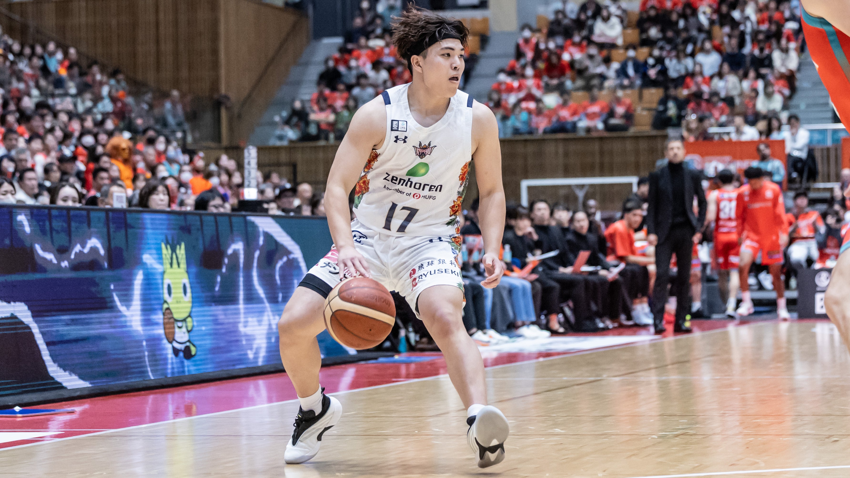 アウェーでの広島とのGAME2。開始早々、#14 岸本隆一選手が深い位置からの3Pシュートを射抜きます。#4 ヴィック・ロー選手がジャンプシュートを決めると、#45 ジャック・クーリー選手がリング下からのシュートで加点します。#14 岸本選手がドライブから#53 アレックス・カーク選手へパスを送るとそのままジャンプシュート、さらに#45 クーリー選手がペイントエリア内から2本連続で2Pシュートを決めます。#8 佐土原遼選手がリング下からの1対1でシュートを決めると、続いて#21 デイミアン・ドットソン選手がレイアップシュートで加点し、20-15で1クォーターを終了します。