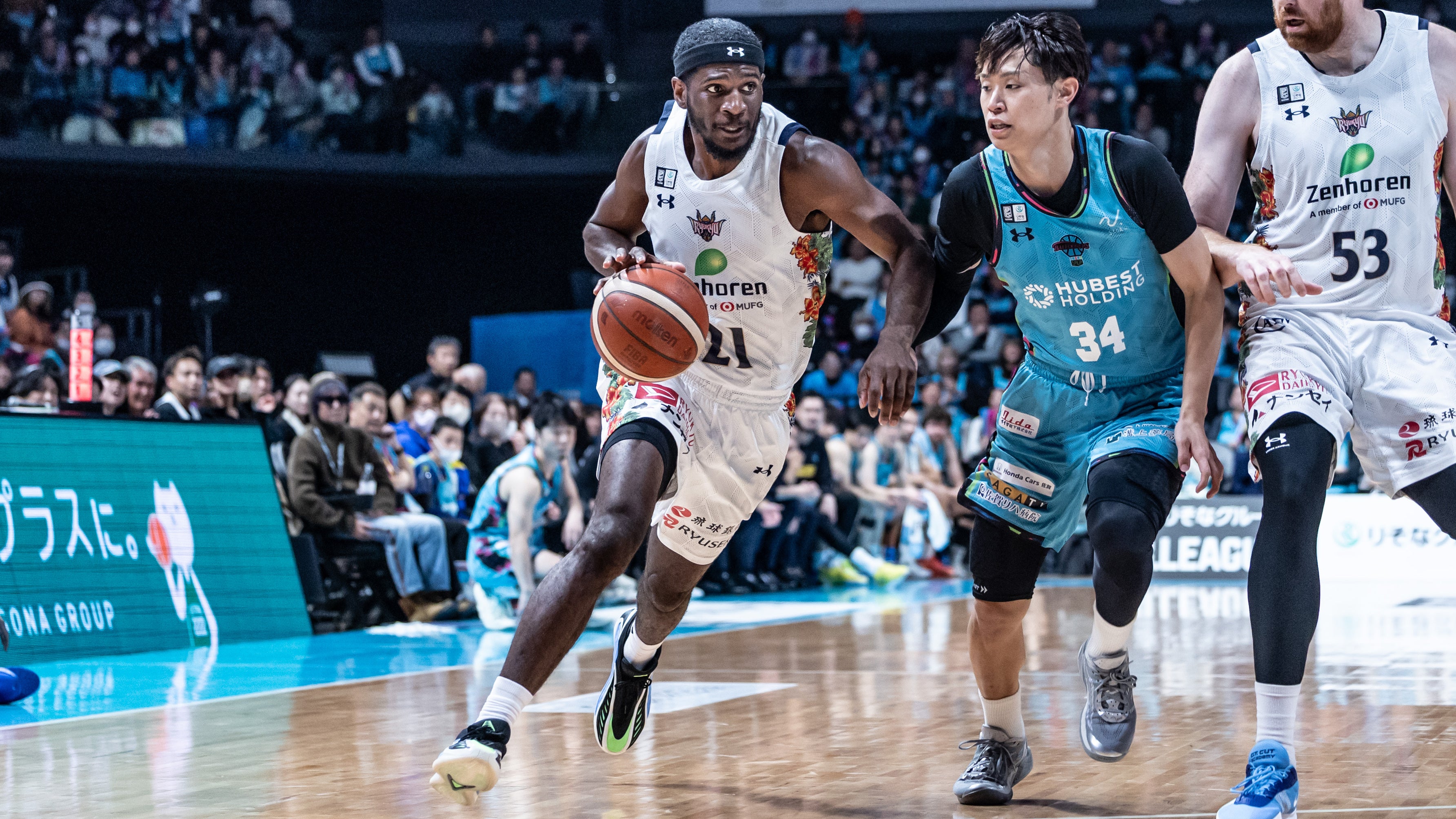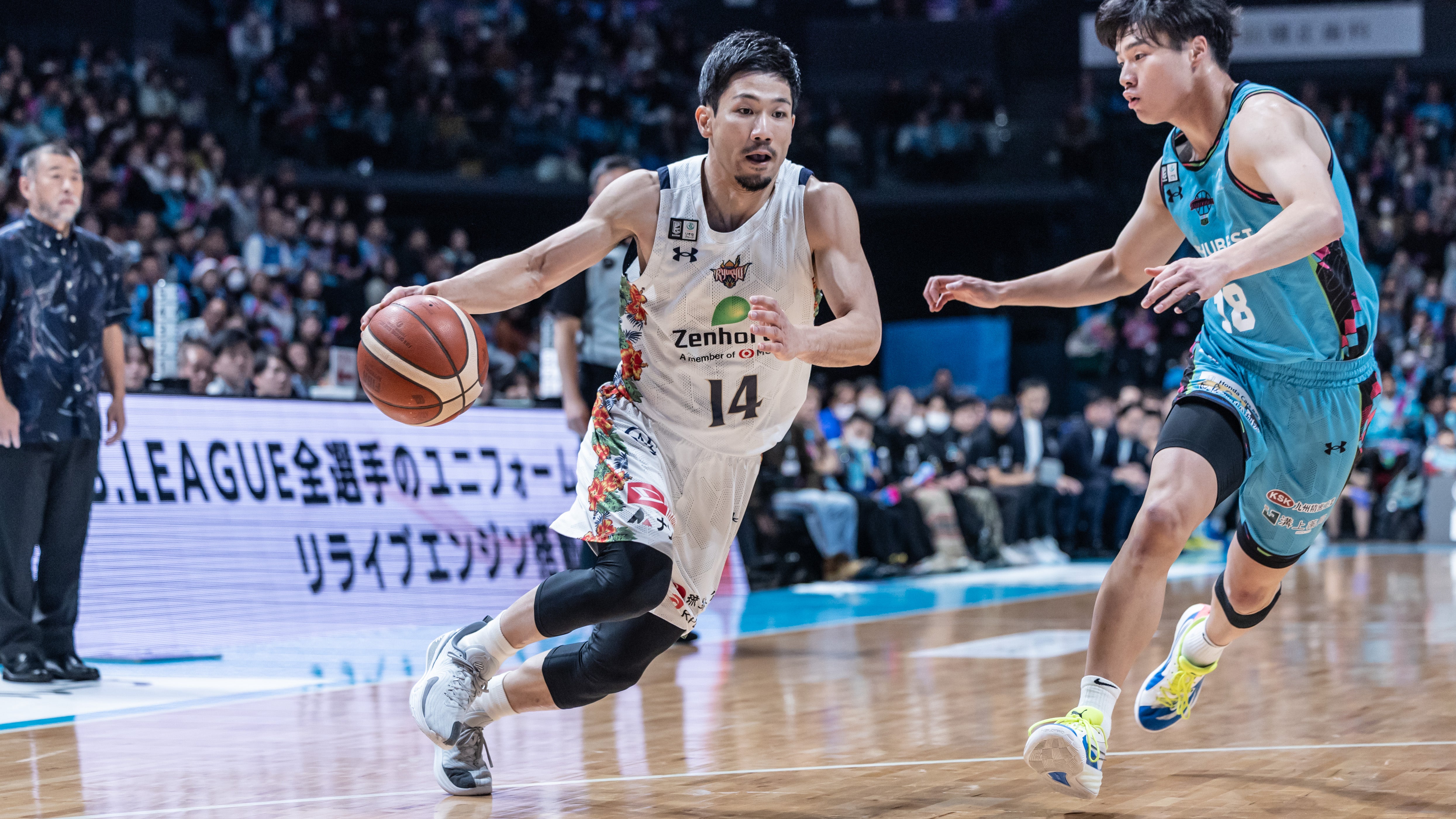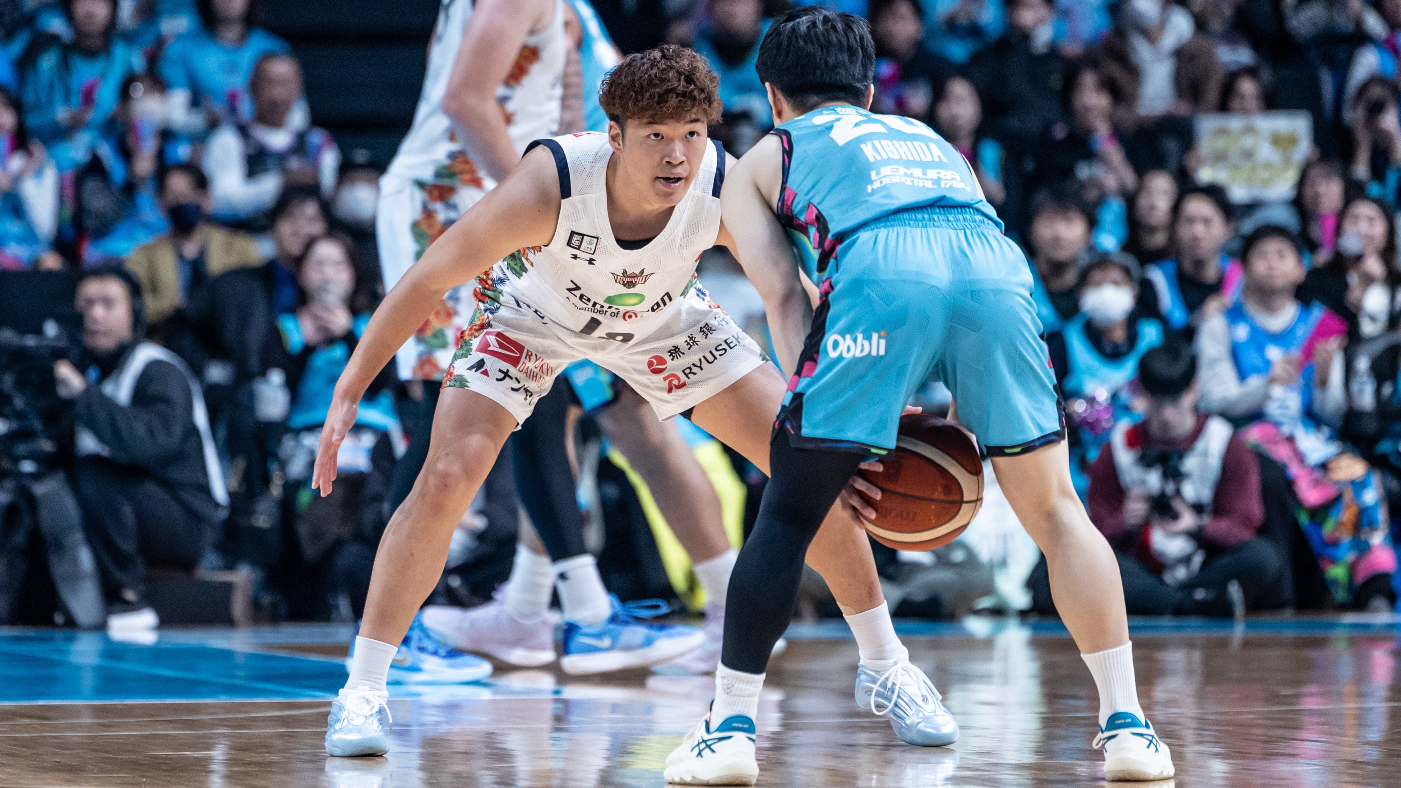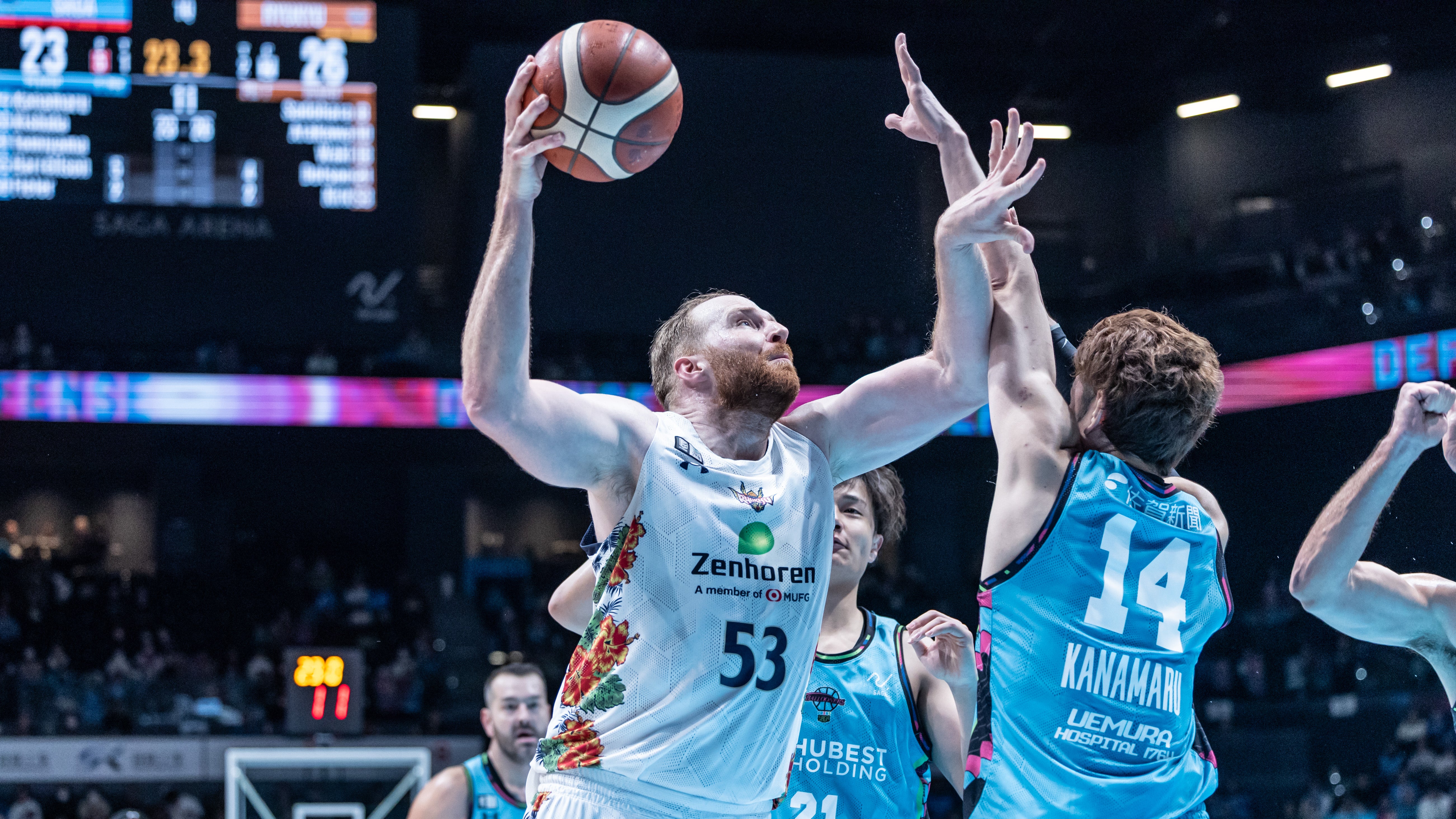 アウェー佐賀とのGAME1。開始2分、#34 小野寺祥太選手がフリースローを2本沈めます。#14 岸本隆一選手、#34 小野寺選手が2人連続で3Pシュートを射抜きます。#4 ヴィック・ロー選手がペイントアタックから3点プレーを決めると、さらにディフェンスリバウンドからの速攻で#34 小野寺選手が3Pシュートで加点します。直後に佐賀に3Pシュートを2本連続で許しますが、#15 松脇圭志選手が3Pシュートで得点を重ねます。#53 アレックス・カーク選手がオフェンスリバウンドからシュートを流し込み加点します。さらに#14 岸本選手が3Pシュートを決め切ると、#21 デイミアン・ドットソン選手が2本のフリースロー、#53 カーク選手がリング下からジャンプシュートを決め、28-25で1クォーターを終了します。