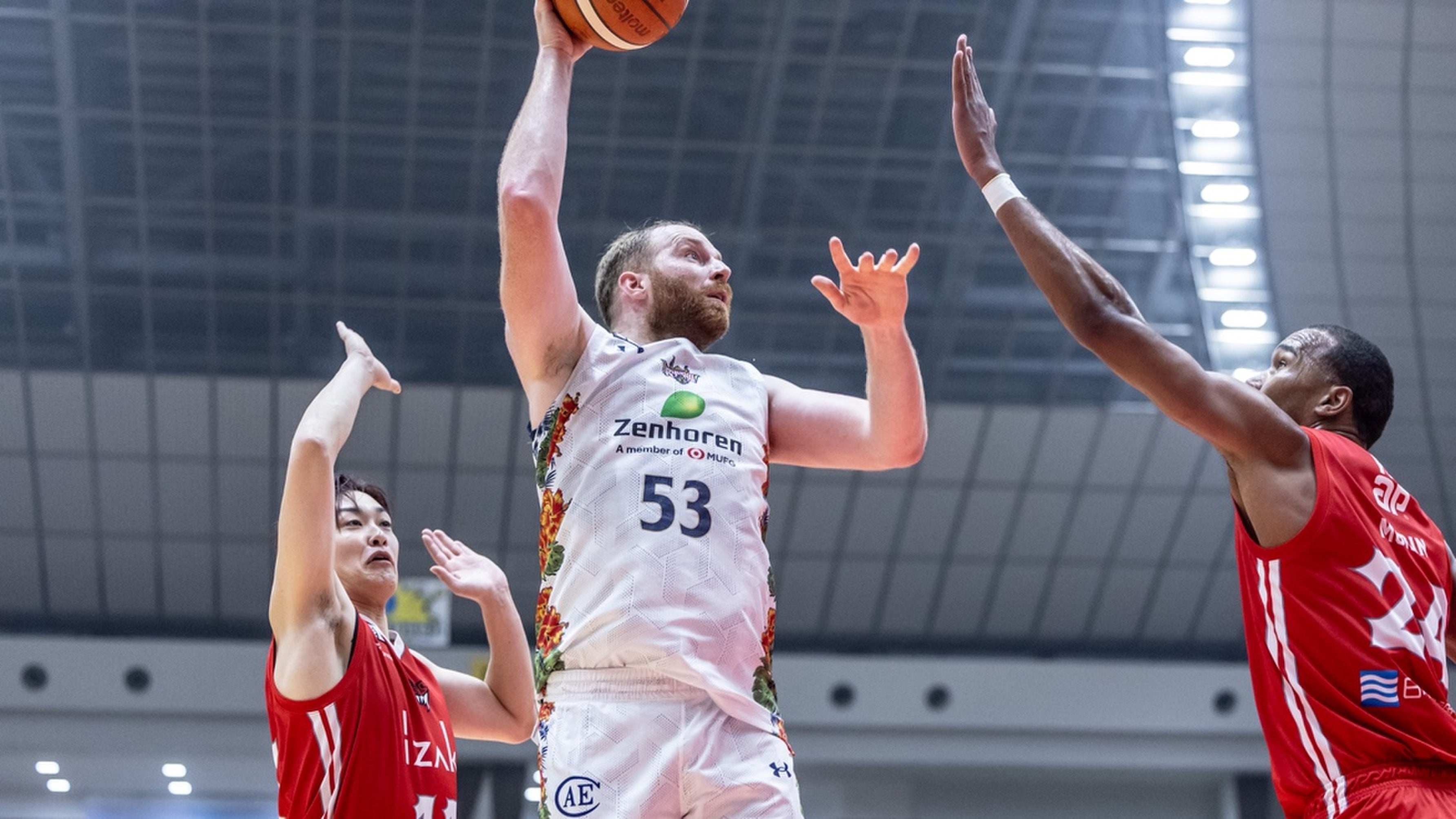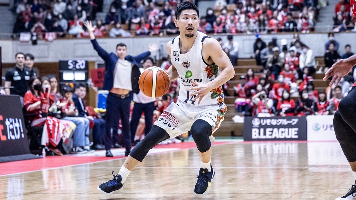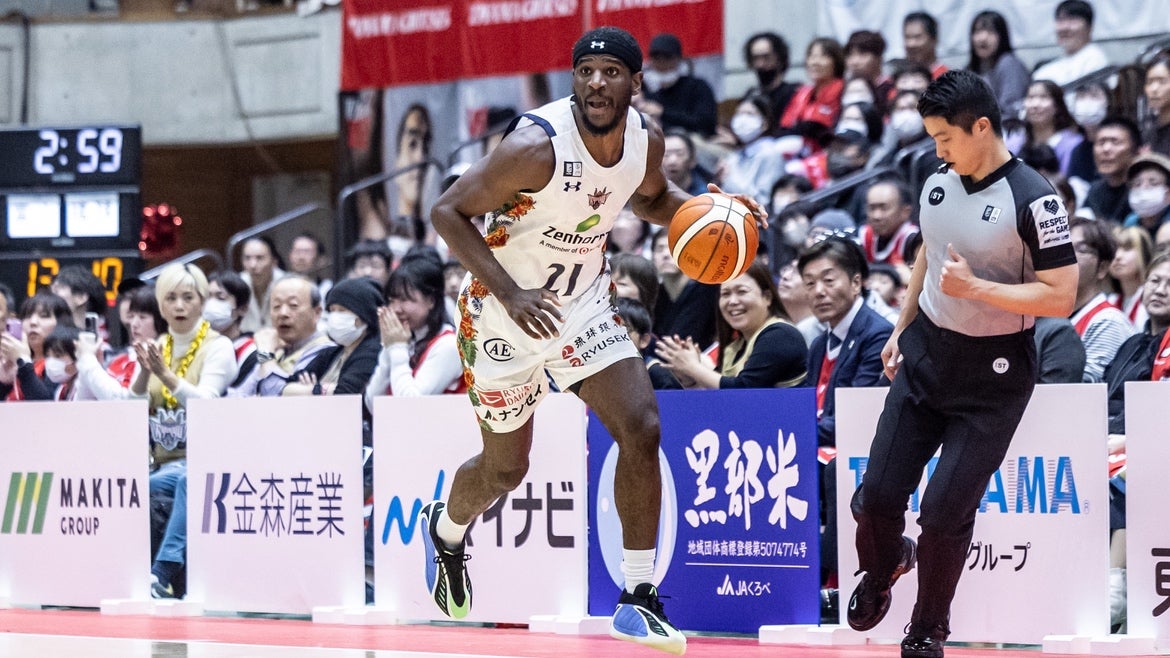 アウェーで富山とのGAME1。立ち上がりの約2分間、両チーム共に攻撃のリズムを掴むことができません。#34 小野寺祥太選手が3Pシュートを射抜き、オフェンスリバウンドから#53 アレックス・カーク選手がジャンプシュート、さらに獲得したフリースローを1本沈め、3点プレーで加点します。相手の速攻や外角からのシュートに苦しむも、#21 デイミアン・ドットソン選手がスティールから2Pシュートを決め切ります。#18 脇真大選手が力強いドライブからレイアップシュートを流し込みます。19-23で1クォーターを終了します。