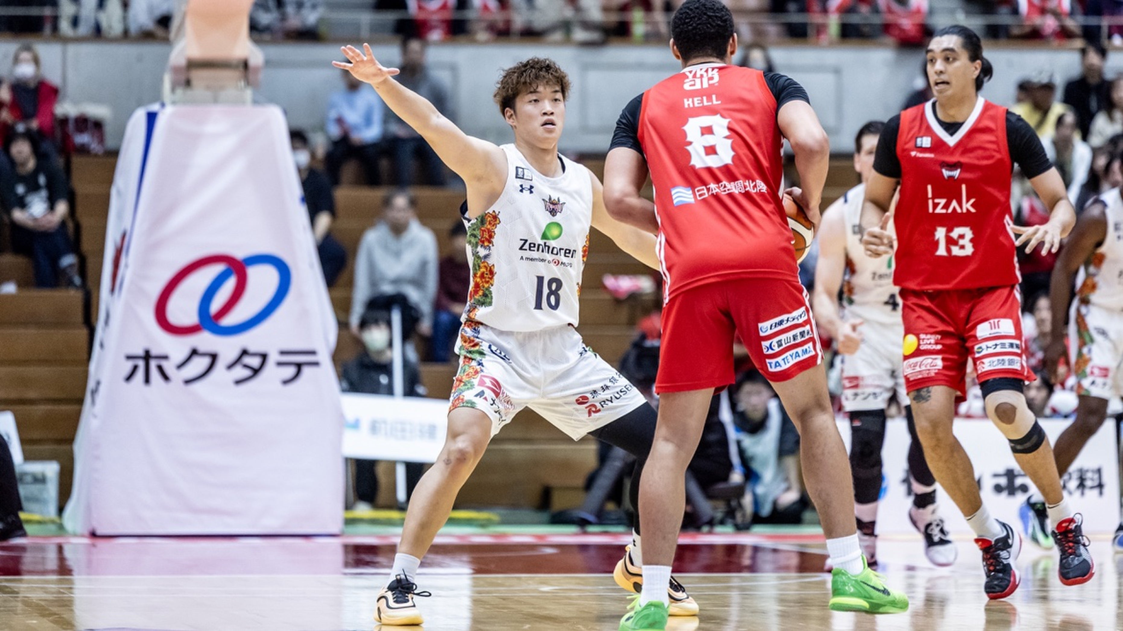 粘り強い守備でリズムを掴み、#21 ドットソン選手がレイアップシュート、#10 荒川颯選手が3Pシュートを沈め24-23で一時リードを奪うも、富山#12 ブロック・モータム選手に3Pシュートなど要所での得点を許し、再び追いかける展開に。オフェンスリバウンドから#45 クーリー選手がリングへ流し込みます。#21 ドットソン選手が2本連続で3Pシュートを沈め、32-33と1点差まで詰め寄ります。その後約2分半得点を重ねられず我慢の時間帯が続き、#15 松脇圭志選手が2Pシュートを沈め、36-43で前半を終了します。