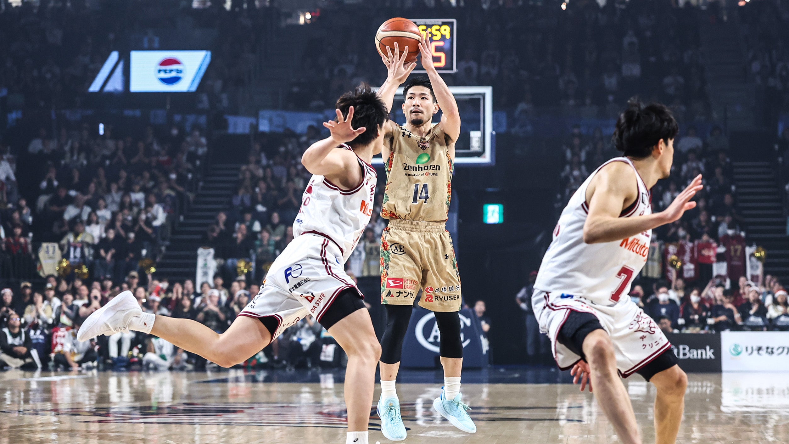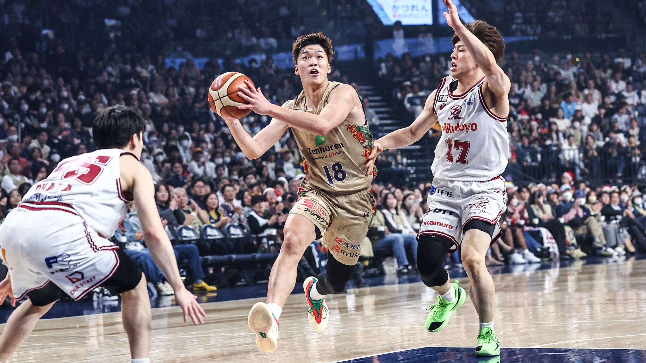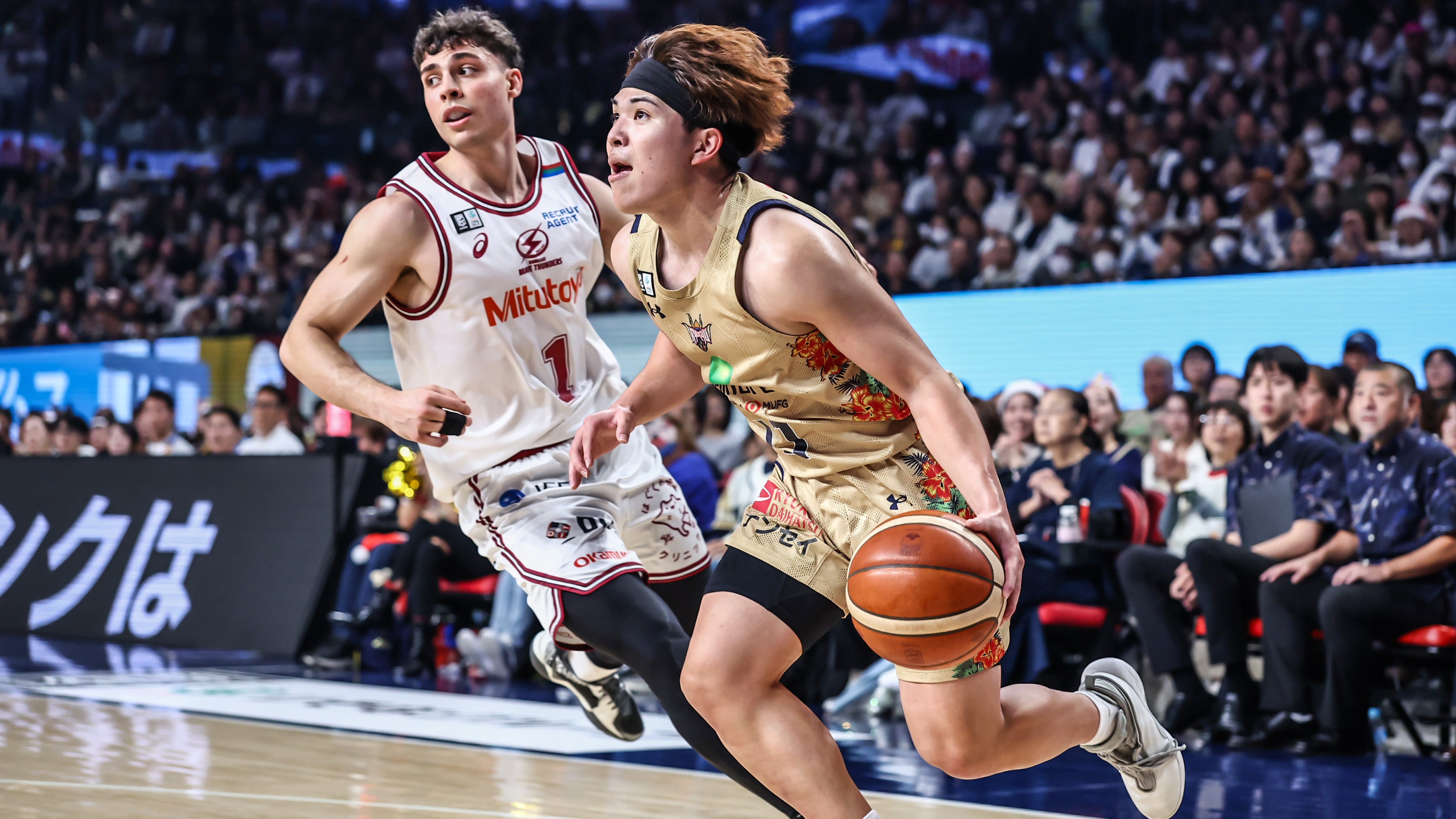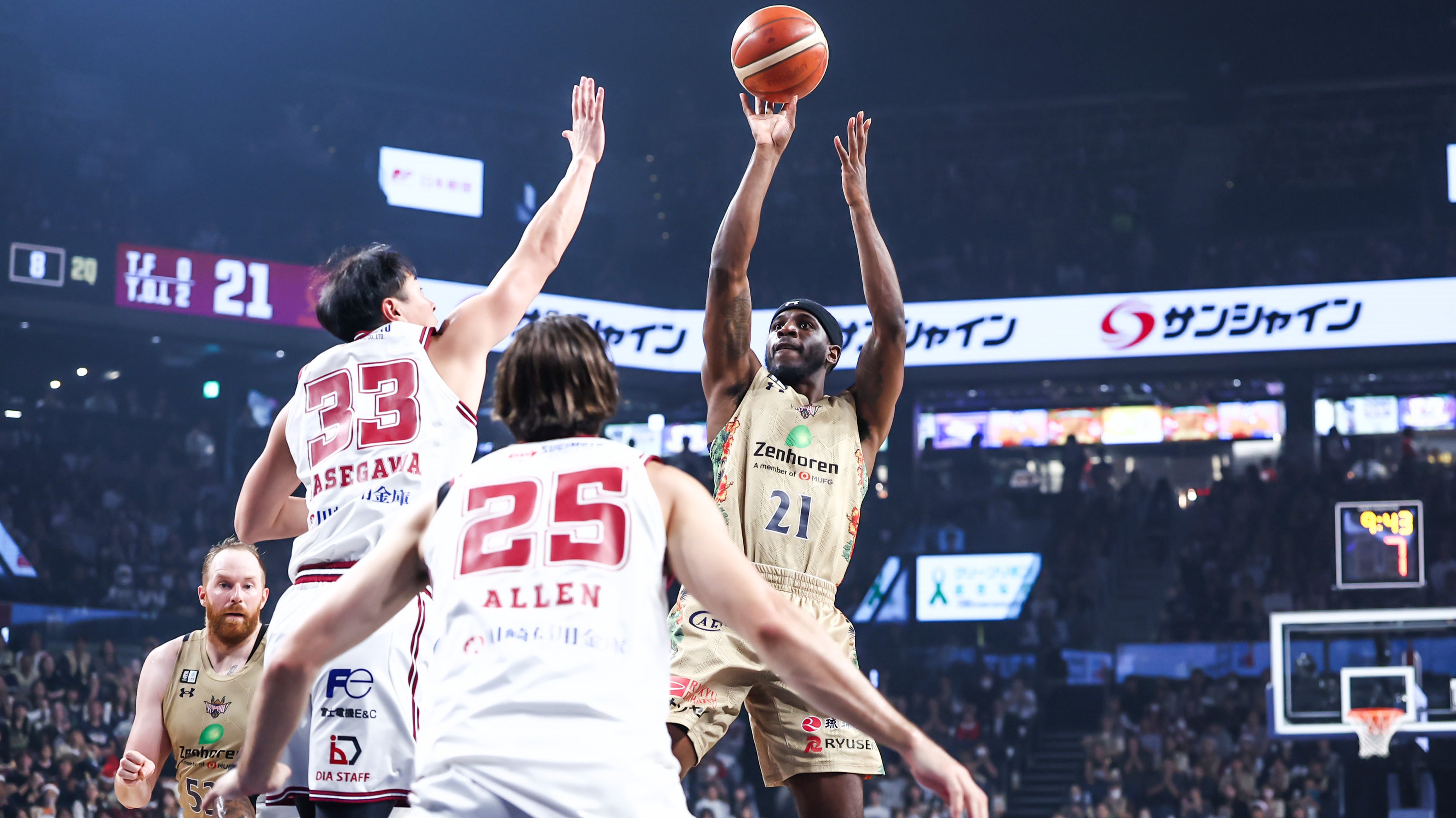 川崎をホームに迎えた一戦。#14 岸本隆一選手が3Pシュート、ドライブから2Pシュートをリングへ流し込み、連続得点を決めます。#53 アレックス・カーク選手がジャンプシュートで加点します。#14 岸本選手が2Pシュート、3Pシュートで得点を重ねますが、相手にリードを許す展開が続きます。終了間際、#18 脇真大選手が難しい体勢からレイアップシュートを決め、さらにフリースローを成功させます。続いて#18 脇選手が2本連続となるレイアップシュートを決めると、23-21とリードを奪って1クォーターを終了します。