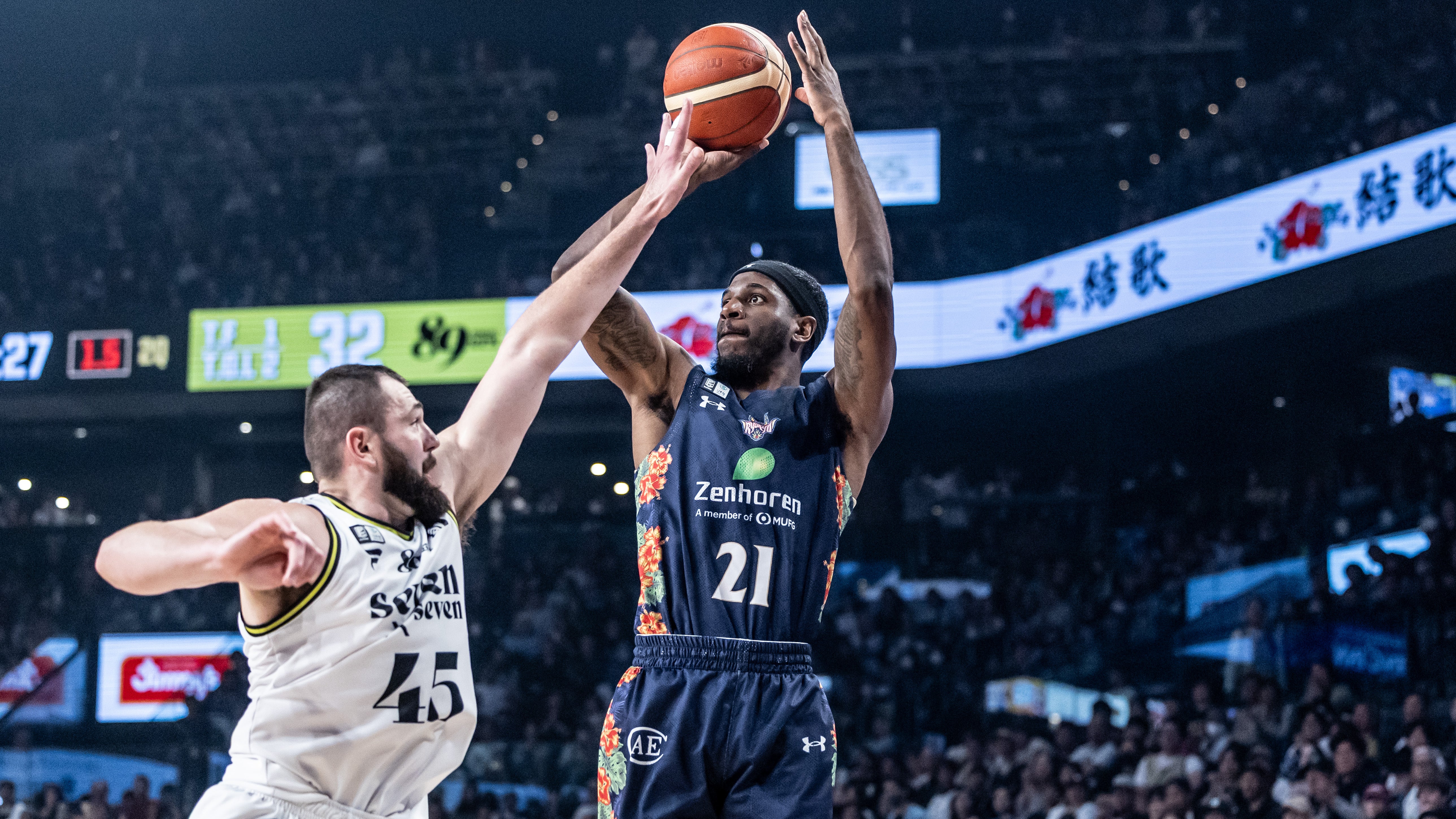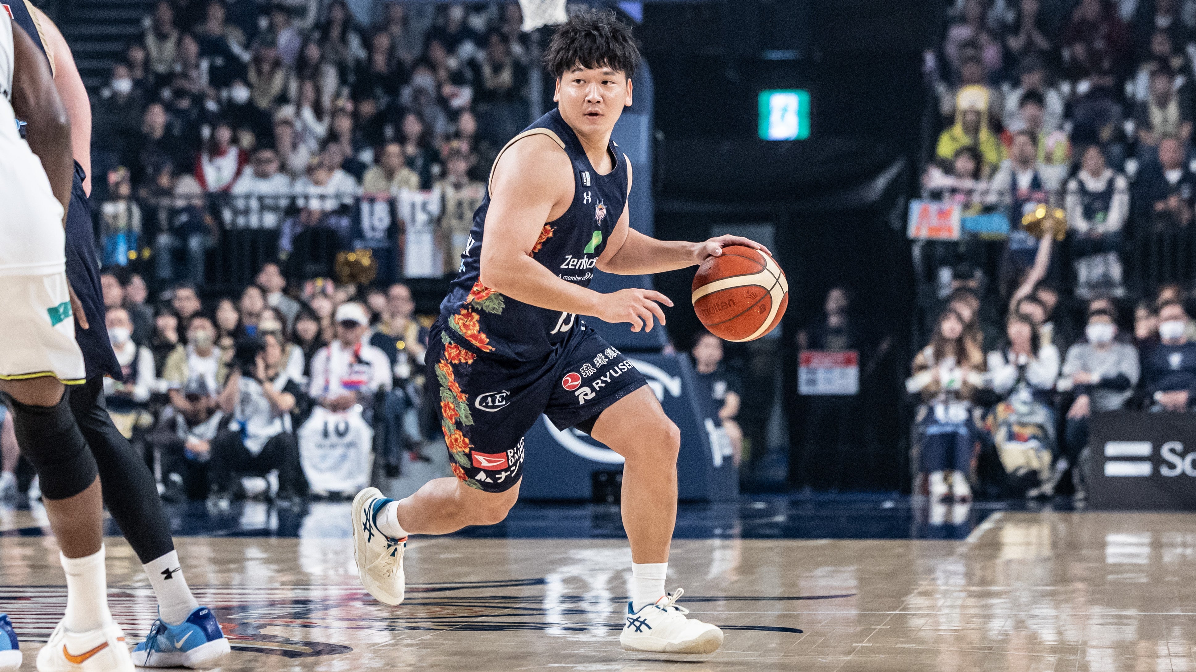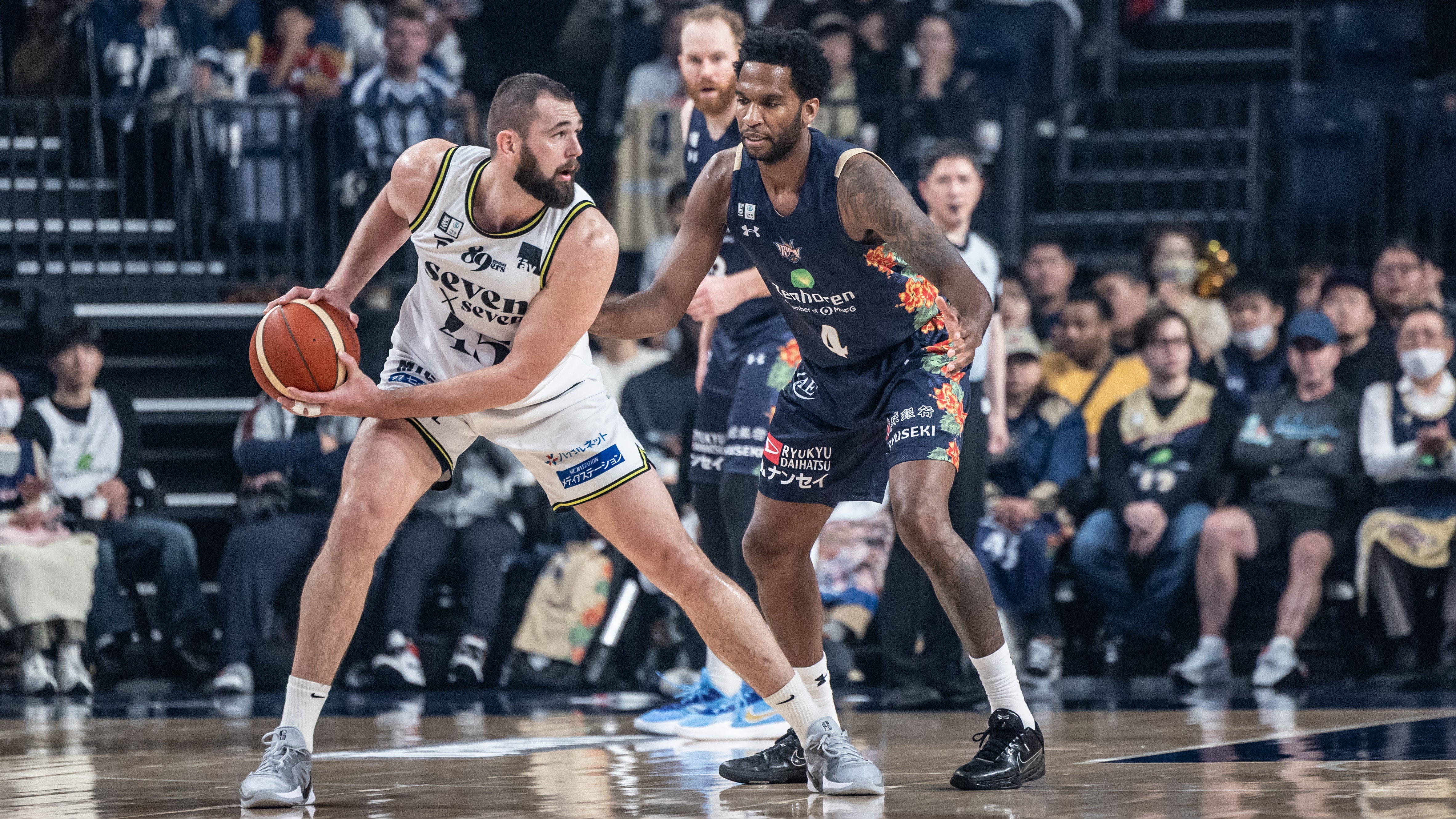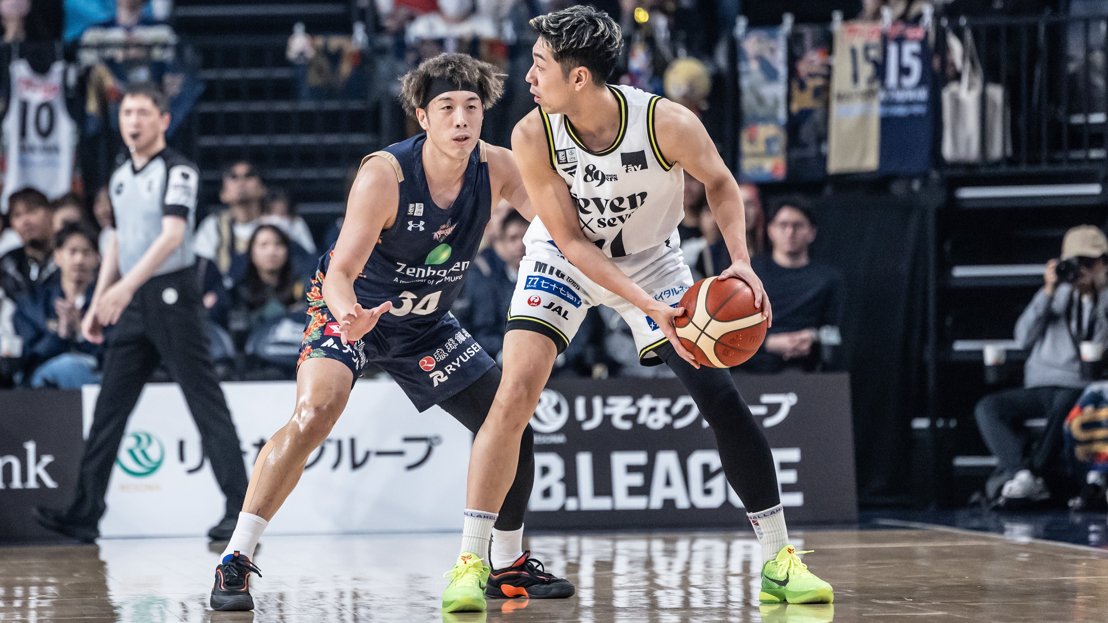 #15 松脇圭志選手が3Pシュートを射抜きます。#17 崎濱秀斗選手のノールックパスを受けた#53 アレックス・カーク選手が2Pシュートを決めます。さらにジャンプシュート、ゴール下からのシュートと2本連続で加点します。#21 ドットソン選手、#10 荒川颯選手が3Pシュートを射抜き得点を重ねます。#8 佐土原選手がオフェンスリバウンドのボールをリングへ流し込みます。終了間際、#14 岸本隆一選手がペイントエリア内に侵入し、難しい体勢からシュートを決め切り、34-43で前半を終了します。